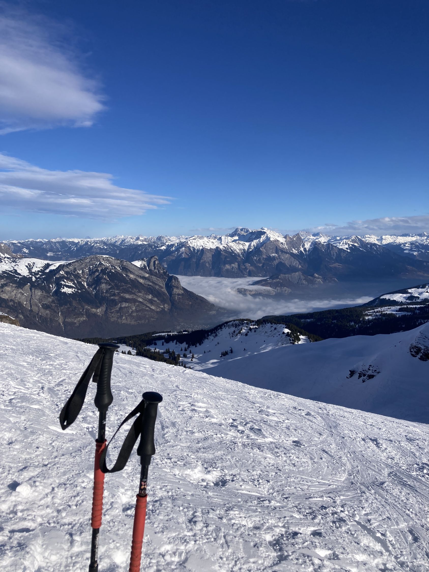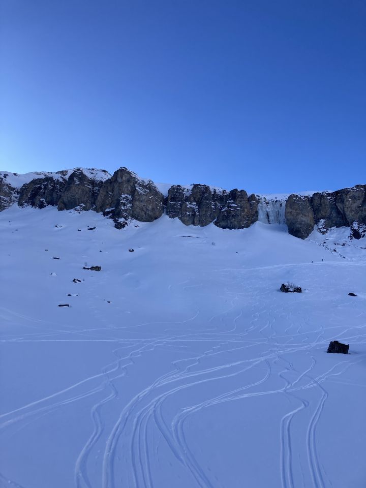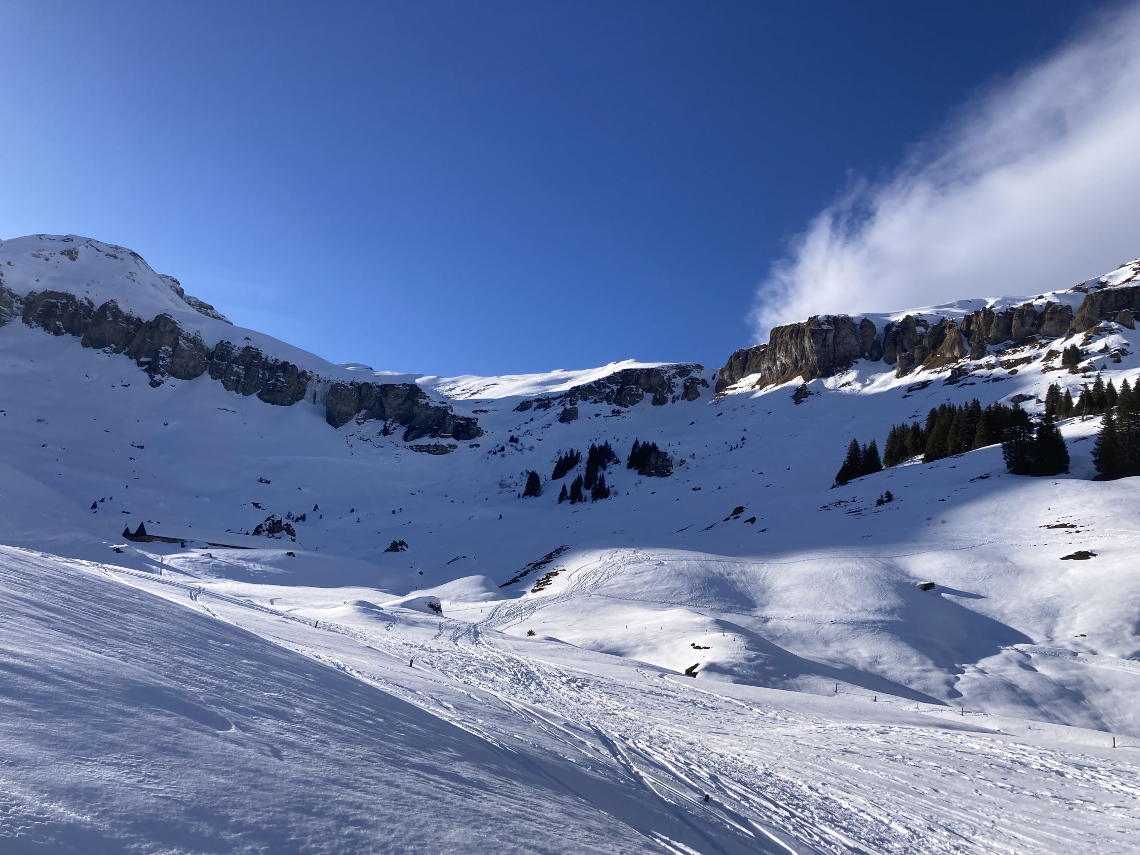 Unten im Wald zwei kurze apere Stellen. Bei der Abfahrt rechts über Reservoir umfahren. Gute Spur bis zum Gipfel Abfahrt oben in der Mulde Pulver und habe auch noch freie Stellen zwischen den vielen Spuren gefunden. War spät unterwegs, deshalb keine Sonnenhänge gefahren im Schatten haben sie schnell eine leichte Kruste. Beim Chammhuttli nach der Engstelle gleich nach rechts. Die Spur ist wegen einer Nassschneelawine etwas tiefer als sonst. Aber bei Schönplanggen noch ausreichend Platz und Pulver gut!.