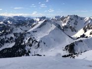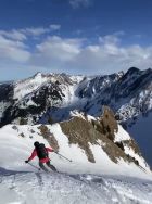 Abfahrt durch das Ost-Couli: ab Skidepot nur teilwese Schnee dem Ostgrat entlang. Einfahrt und oberster Teil hart, dann sehr wechselhaft Bruchharsch / Presspulver. Der Durchschlupf östlich Pt.1716 geht bis auf eine sehr kurze Stelle gut, hier ein paar "Chempe" übersteigen und dann runter zur Alp Seeberg. Wir sind unterhalb der bewaldeten Felskanzel ca. 1650 gleich links in den Graben gewechselt und in diesem bis ca. 1550 gefahren. Somit konnten wir bis zur Alp durchgehend ohne "Steinlamento" fahren. Unterhalb der Alp links vom Graben einer Wegspur folgen und dann im freien Gelände noch bis zur Brücke Pt.1365 die schöne Pulverauflage benützen. Abschliessend wie Anmarsch auf dem Weg zurück zum PP Hengstkurve.