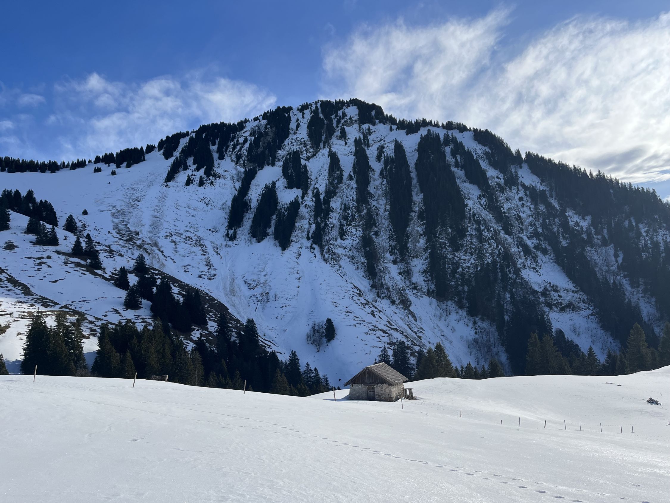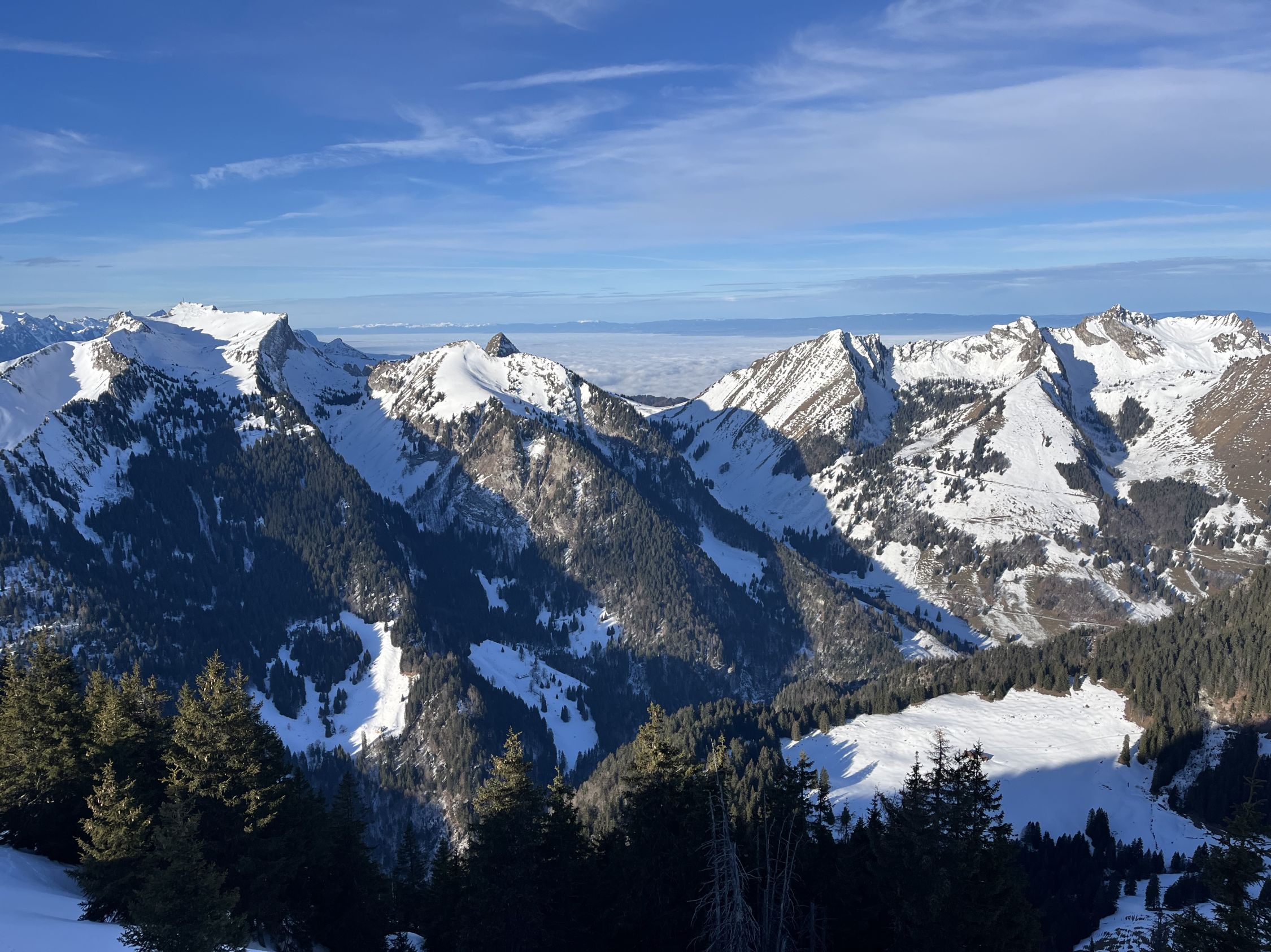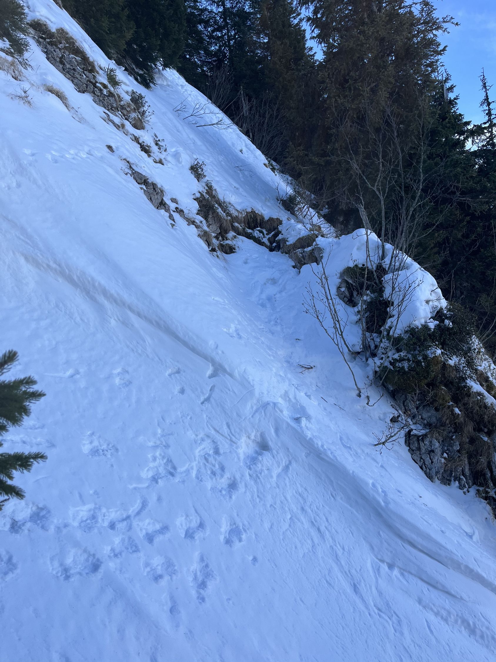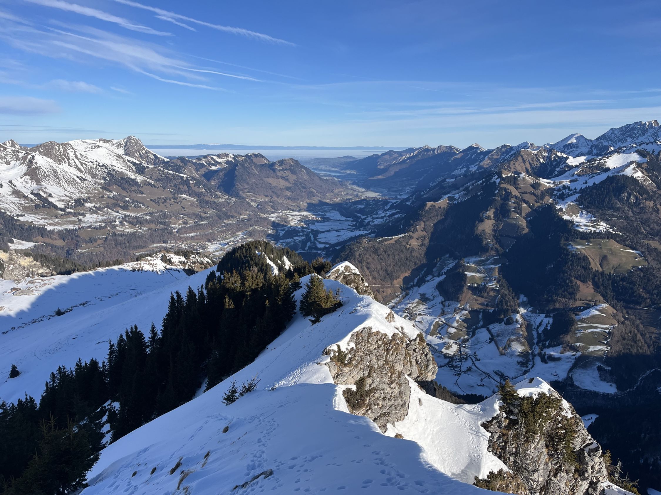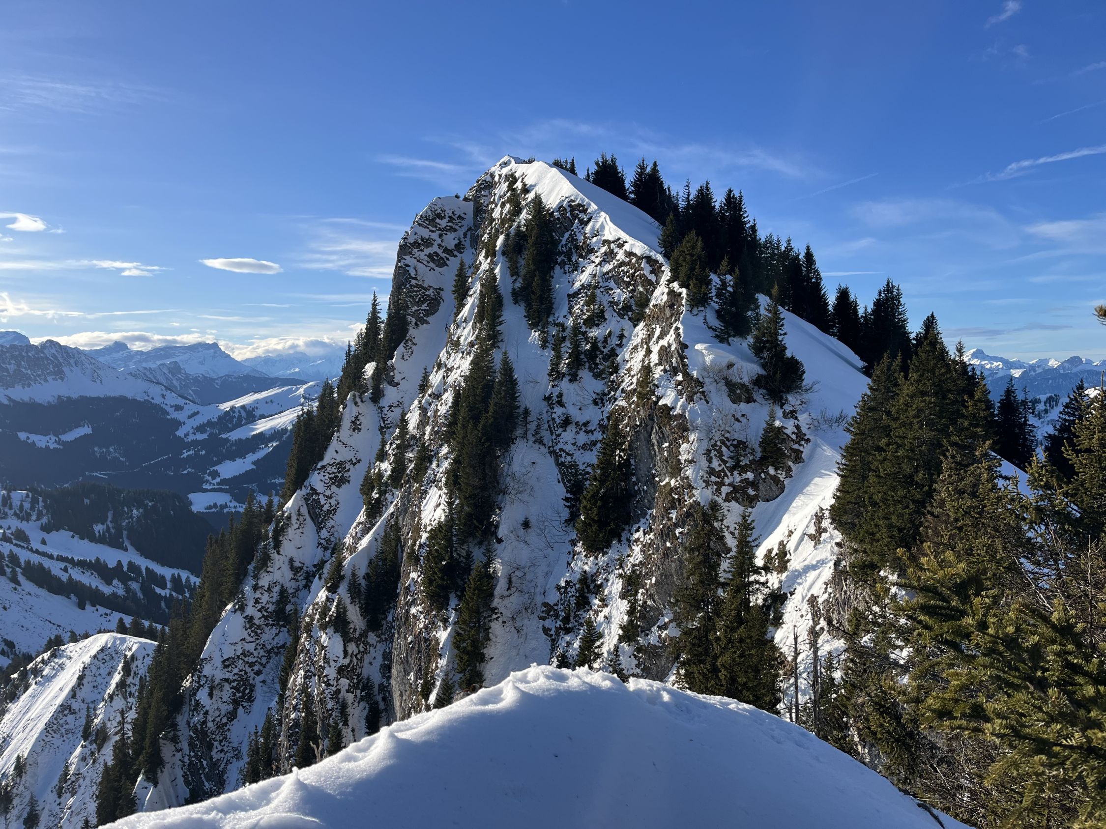 Aktuell mehr Winterbergsteigen als Ski- oder Schneeschuhtour: Die Steigeisen kamen mehr zum Einsatz als die Schneeschuhe. Der wenige Pulverschnee ist oft verblasen und die Unterlage hart bis eisig. Am Grat etwas besser, weicherer Schnee. Viele Lawinenkegel auf dem Weg nach Corjon, mit Steigeisen jedoch problemlos.