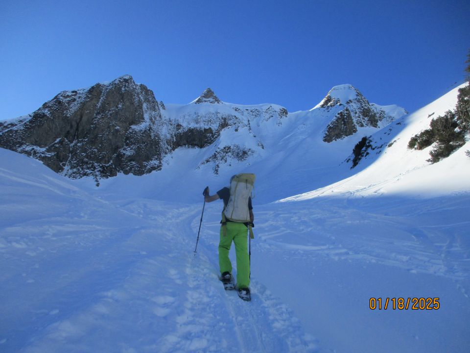 Aufstieg auf guter Spur. Problemloser Abstieg, wenngleich durch reichlich zerfahrenes Gelände.