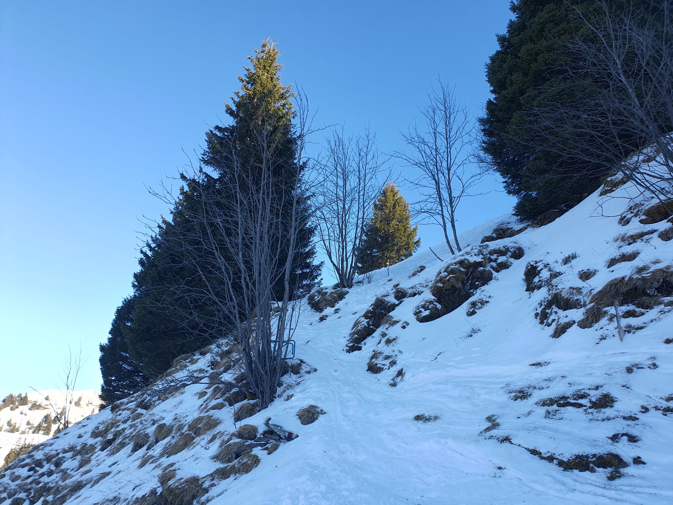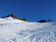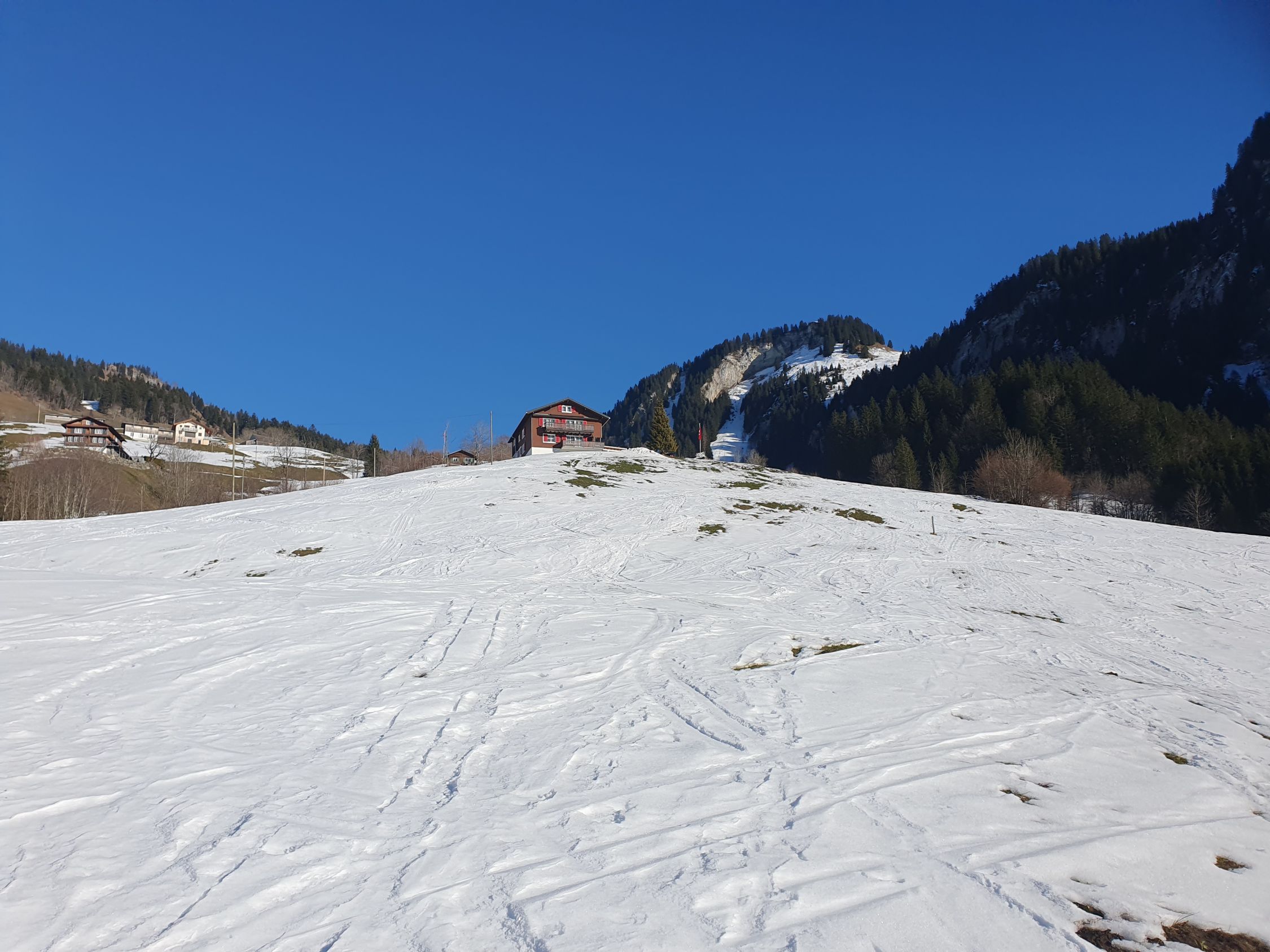 Start in Weglosen Talstation, zuerst auf der Abfahrtspiste, dann kurz nach SE auf rutschigem Hartschnee abgekürzt, um dann gemütlich auf dem Forstweg hoch zur Druesberghütte zu gelangen. Anschliessend auf verfahrenem Schnee via Pfannenhütten hoch zum Rütistein. Oben etwas abgeblasen, aber geht gut ohne Steinkontakt.