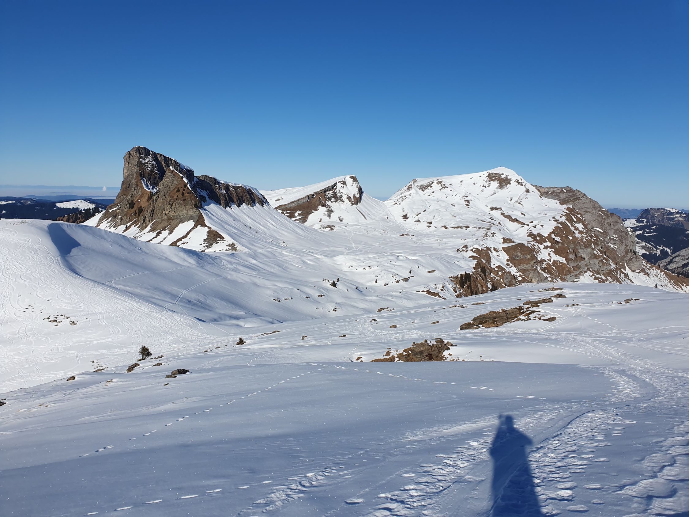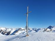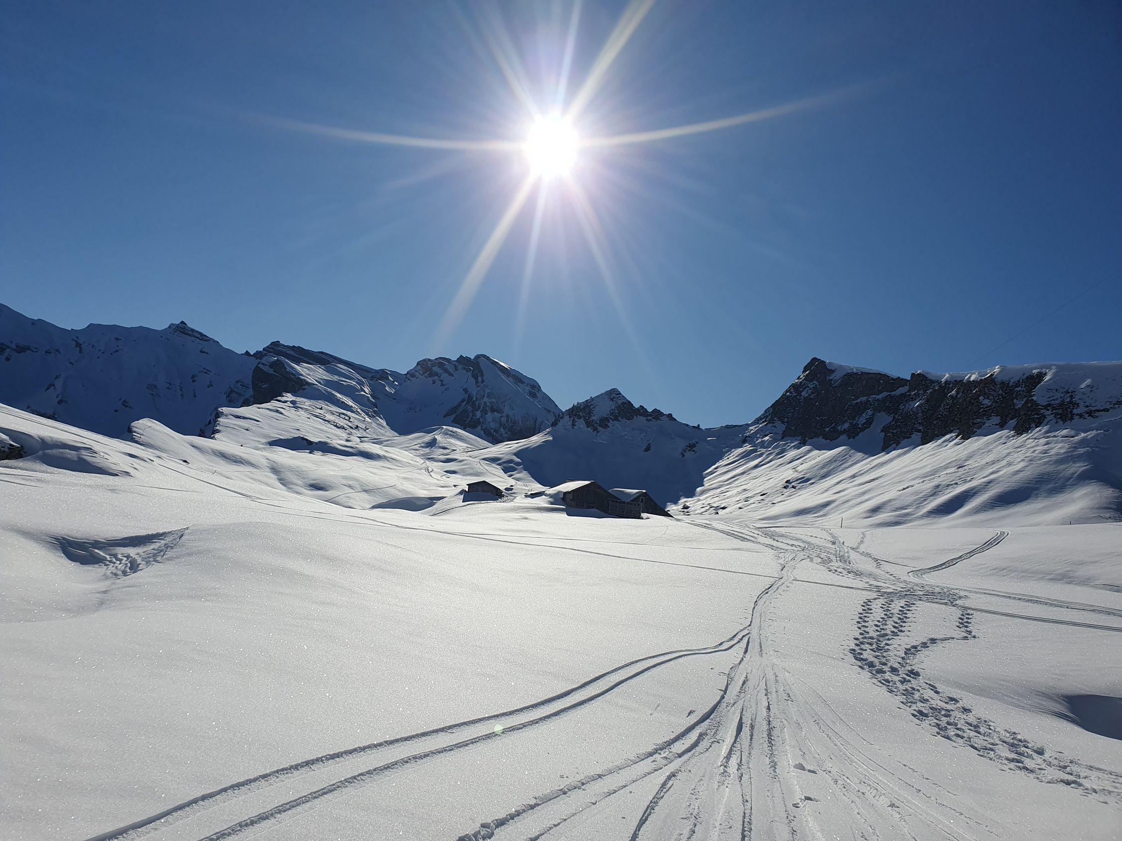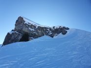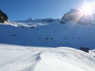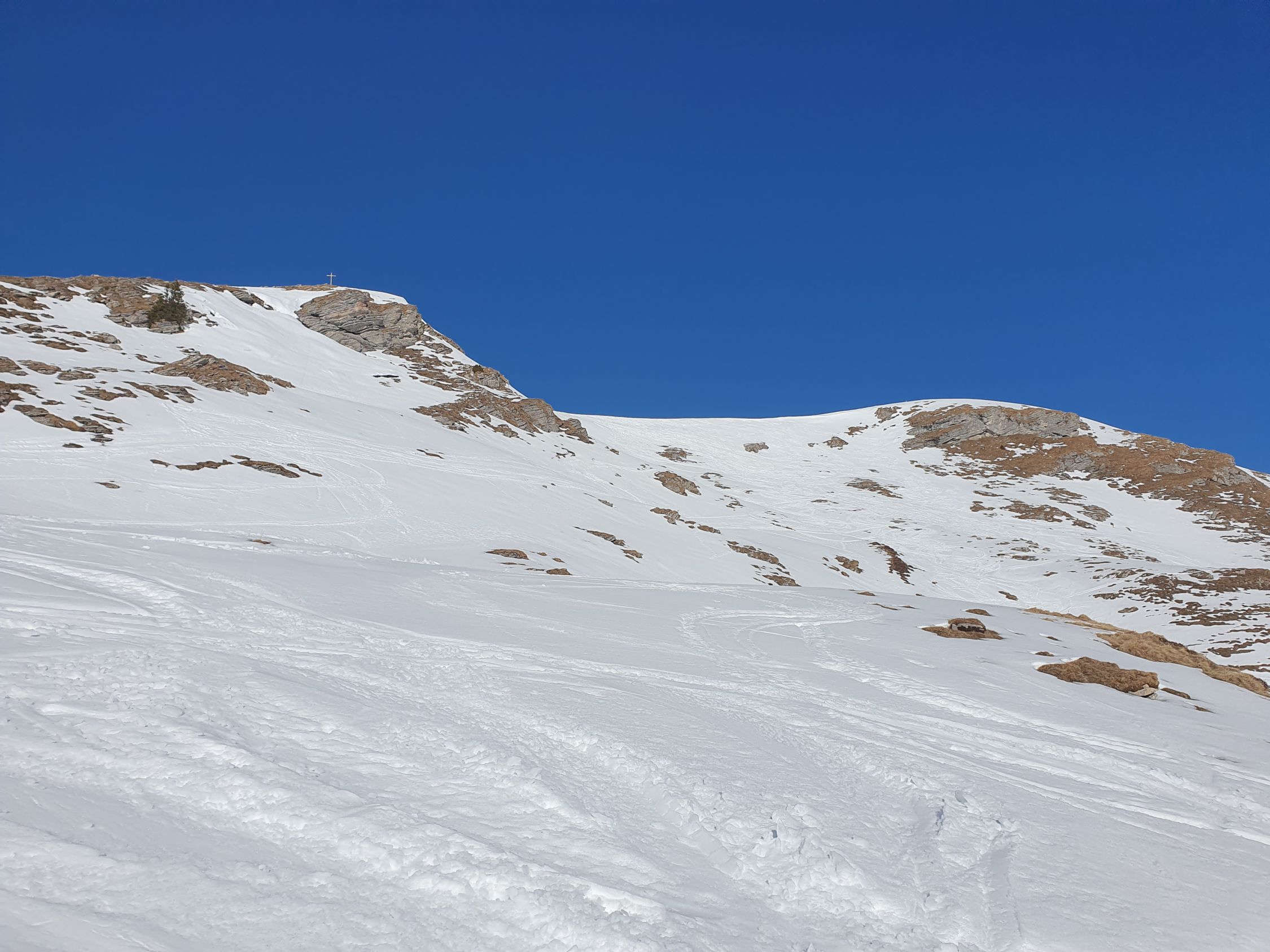 Kurze Abfahrt zum Hinterofen. Mal Hartschnee, mal etwas Pulver aber gut zu fahren. Wieder Anfellen und auf Sulzschnee direkt hoch zum Piet. Oben Hartschnee.