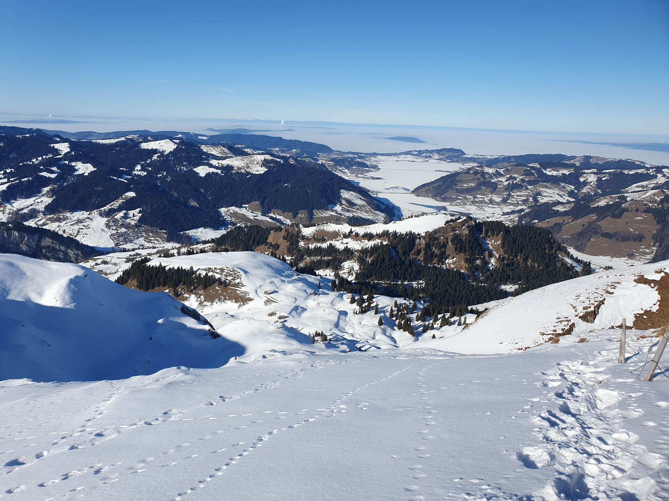 Schlussabfahrt via Tierfäderenegg nach Unteriberg Waag ging gut. Oben neben den Spuren noch etwas Pulver gefunden. In der Steilpassage dann wieder Hartschnee. Weiter unten über die Wiesen etwas wenig Schnee, ging aber noch immer gut zu fahren. Aufgrund des Grases, statt der Steine unter dem Schnee, konnte trotz Schneemangel mit gutem Gewissen abgefahren werden.