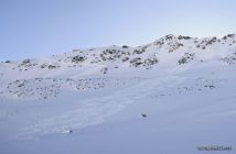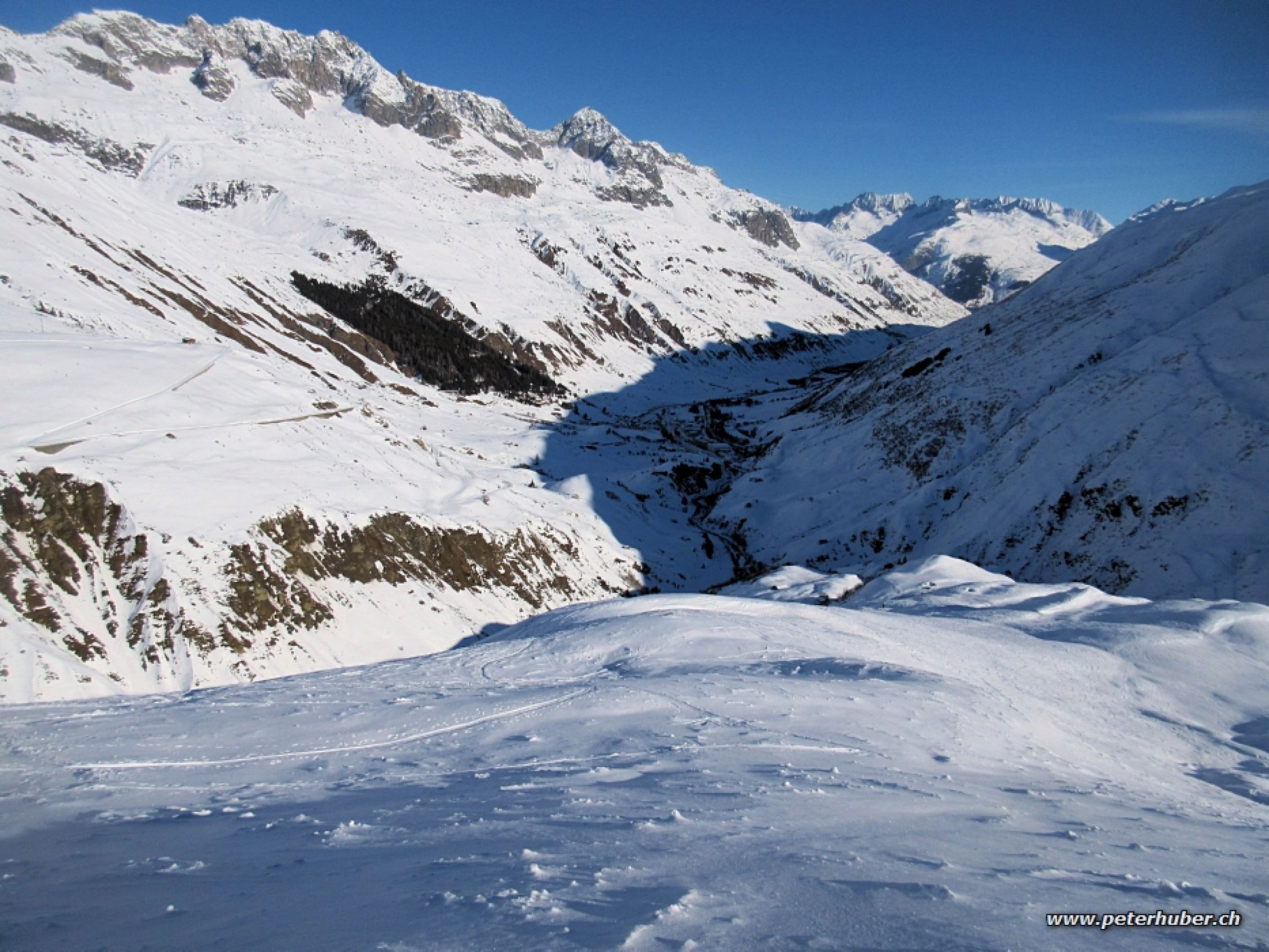 Abfahrt: Wir sind vor dem Gipfel auf zirka 2700 m in den Nordhang eingestiegen. Die ersten Meter der Querung waren zwar toll mit Pulverschnee gefüllt, doch die Steine lauerten gleich unter der Oberfläche. Dann bei Schwärzistöck und Deierli toller, unverspurter Pulverschnee und schönes Abfahrtsvergnügen. Bei P 1827 über die Brücke und zur Furkapassstrasse gequert, gehr sehr gut. Dann auf der pistenhaften Passstrasse nach Realp.