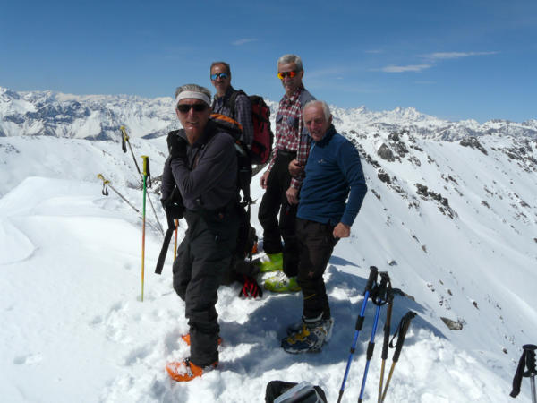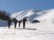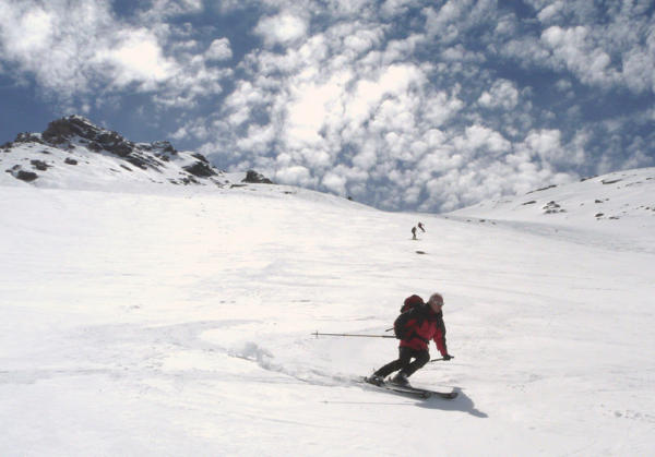 Bardonecchia-Rochemolles-Mündung V.d'Almiane 1950m bei der Grange Chaux.Etwa 100m dem Bacheinschnitt entlang durch Lawinengerümpel,dann über weite,immer steiler werdende Hänge,am Schluss über leichten Gipfelgrat zur Punta Valfredda,flankiert von der Testa del Coin und der Almiane.