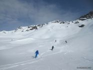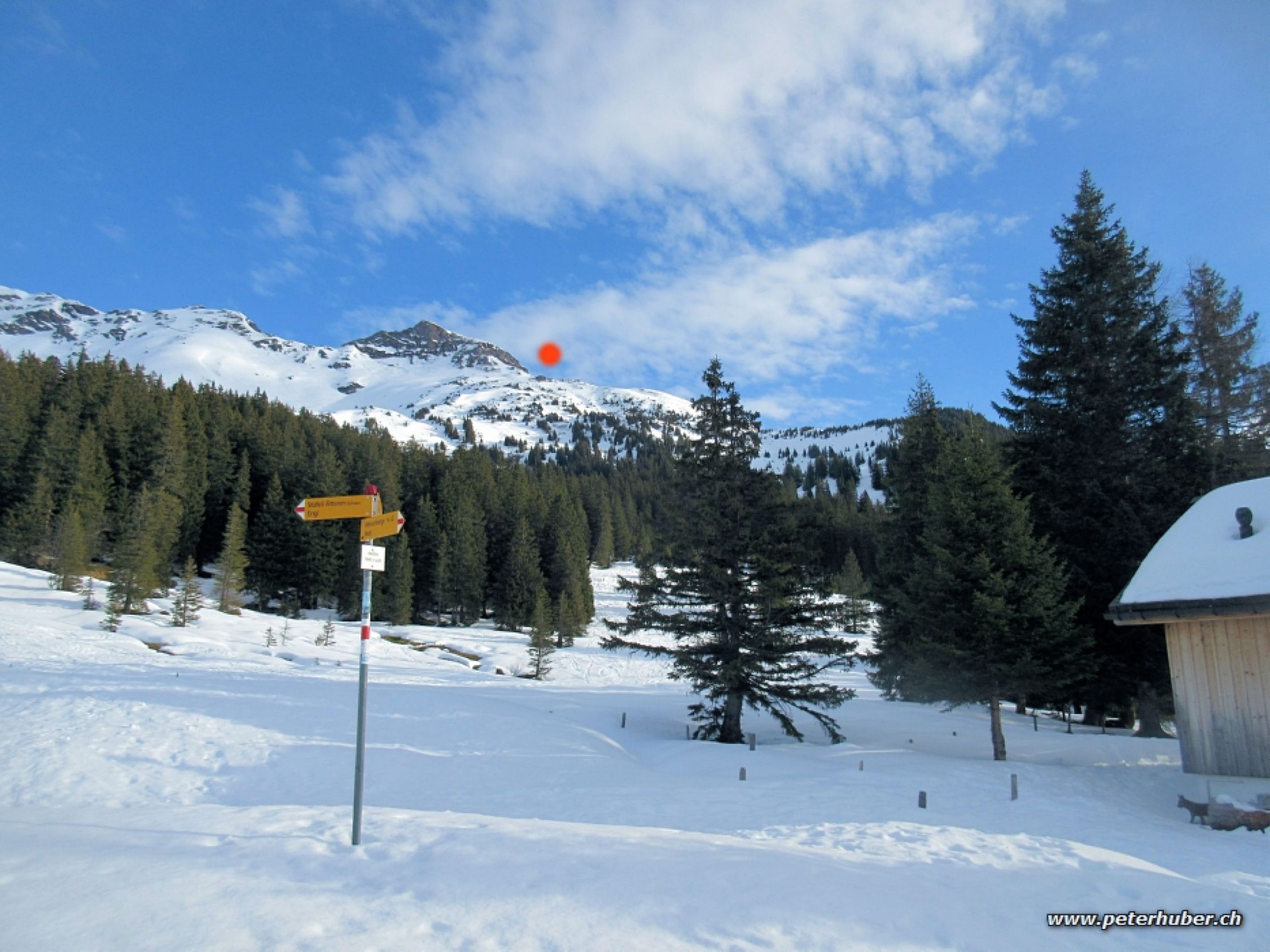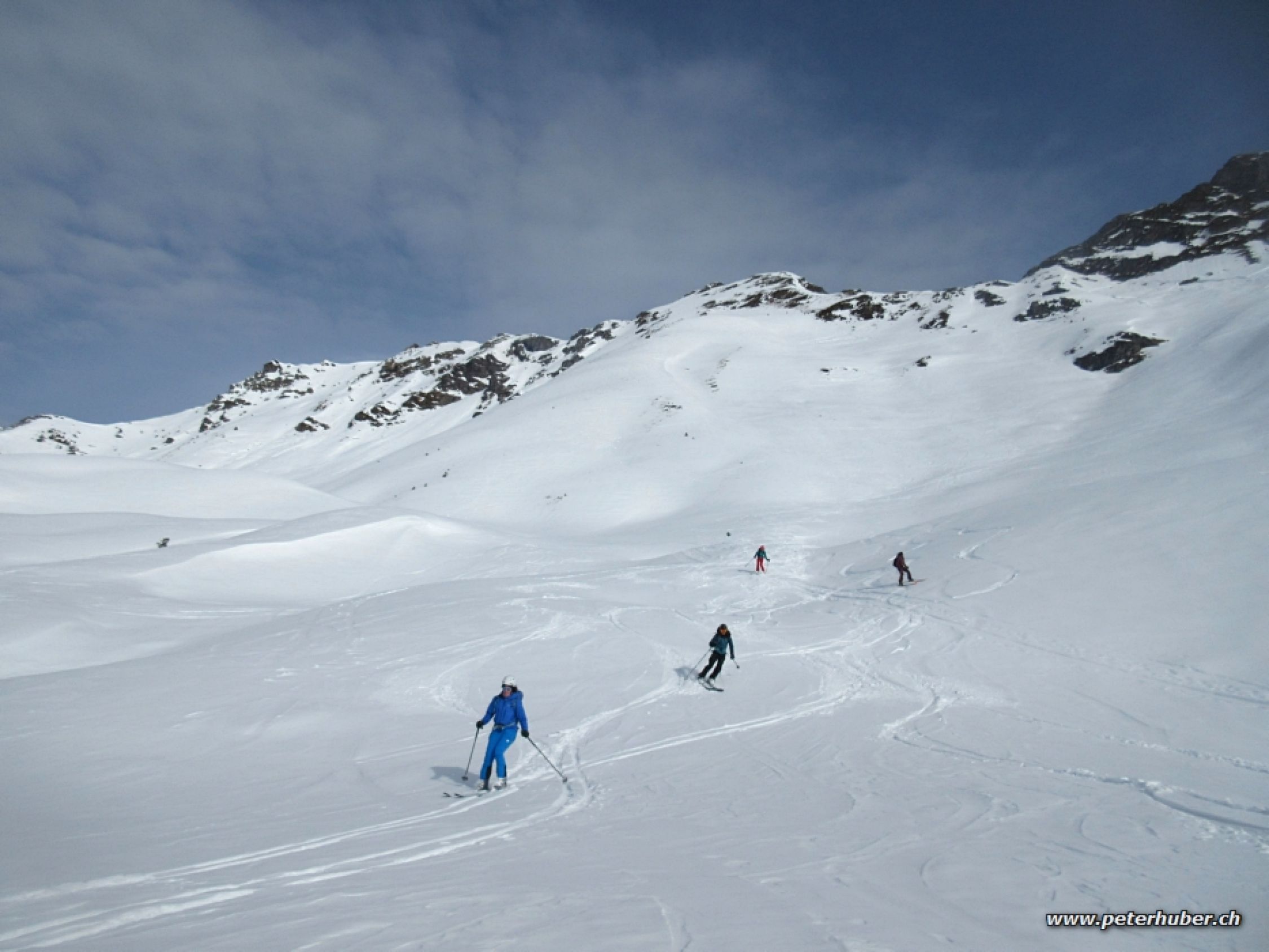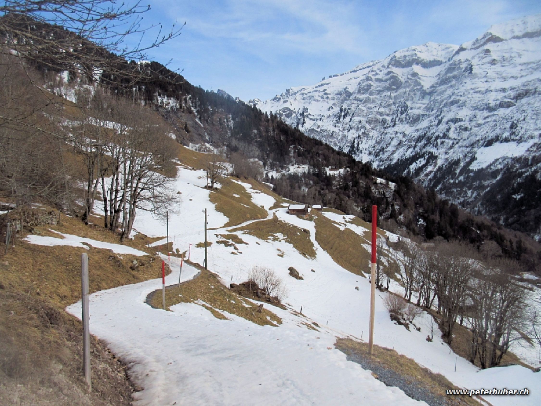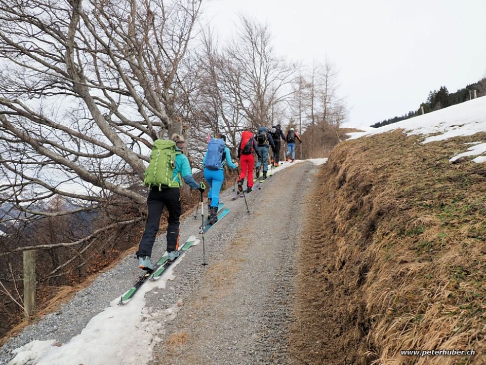 Abfahrt: Via Fuggboden. Die Steilhänge haben fast durchgehend getragen. Nur selten brachen wir durch. Recht schön zu fahren. Die steilen Buschhänge bei Chnoren waren mühsam zu fahren. Die alten Spuren waren hart gefroren und schüttelten mächtig. Unterhalb 1700 m abschnittweise pistenartig ausgefahren und etwas aufgetaut. Ganz passabel zu fahren. Ab Schiben waren die Hänge weitherum braun. Jedoch hatte es auf der Strasse durchgehend Schnee bis zum Restaurant hinunter.