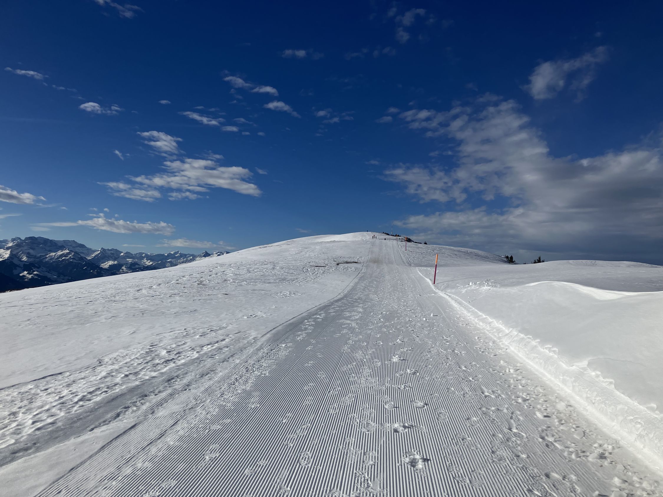 Weg führt über die Ratracpiste bis Seesel, ab da zum Teil Knöchel tief Schnee.