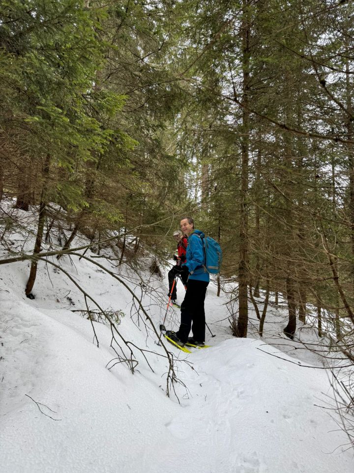 Ich wollte meine neuen Skis nicht strapazieren und nahm die Schneeschuhe. Rückblickend wäre es mit den Skis schon gegangen, obwohl sich das Abfahrtsvergnügen wahrscheinlich in Grenzen gehalten hätte. Früher Aufbruch ist anzuraten, weil der Schnee mit fortschreitender Tageszeit, bei solchen Temperaturen, weich und klebrig wird.