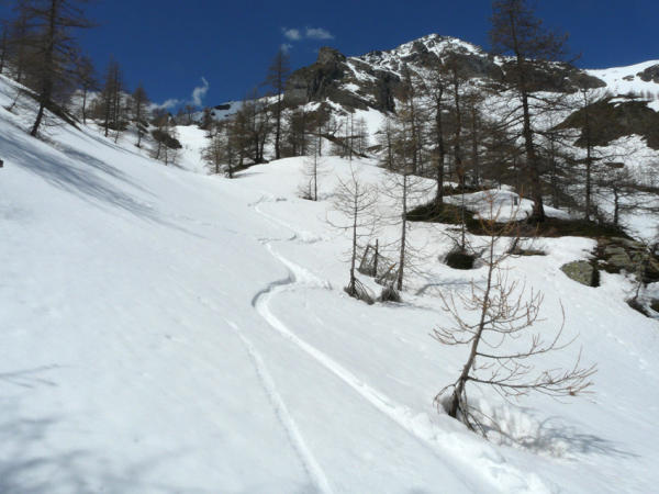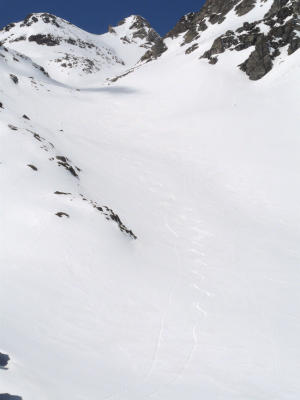 Nach Gewitter in der Nacht und Bewölkung bis in die Morgenstunden war der Schnee einfach zu weich, um noch eine weitere Stunde für den Gipfel zu "spendieren",aber es war noch alles zu fahren,was weiss war!