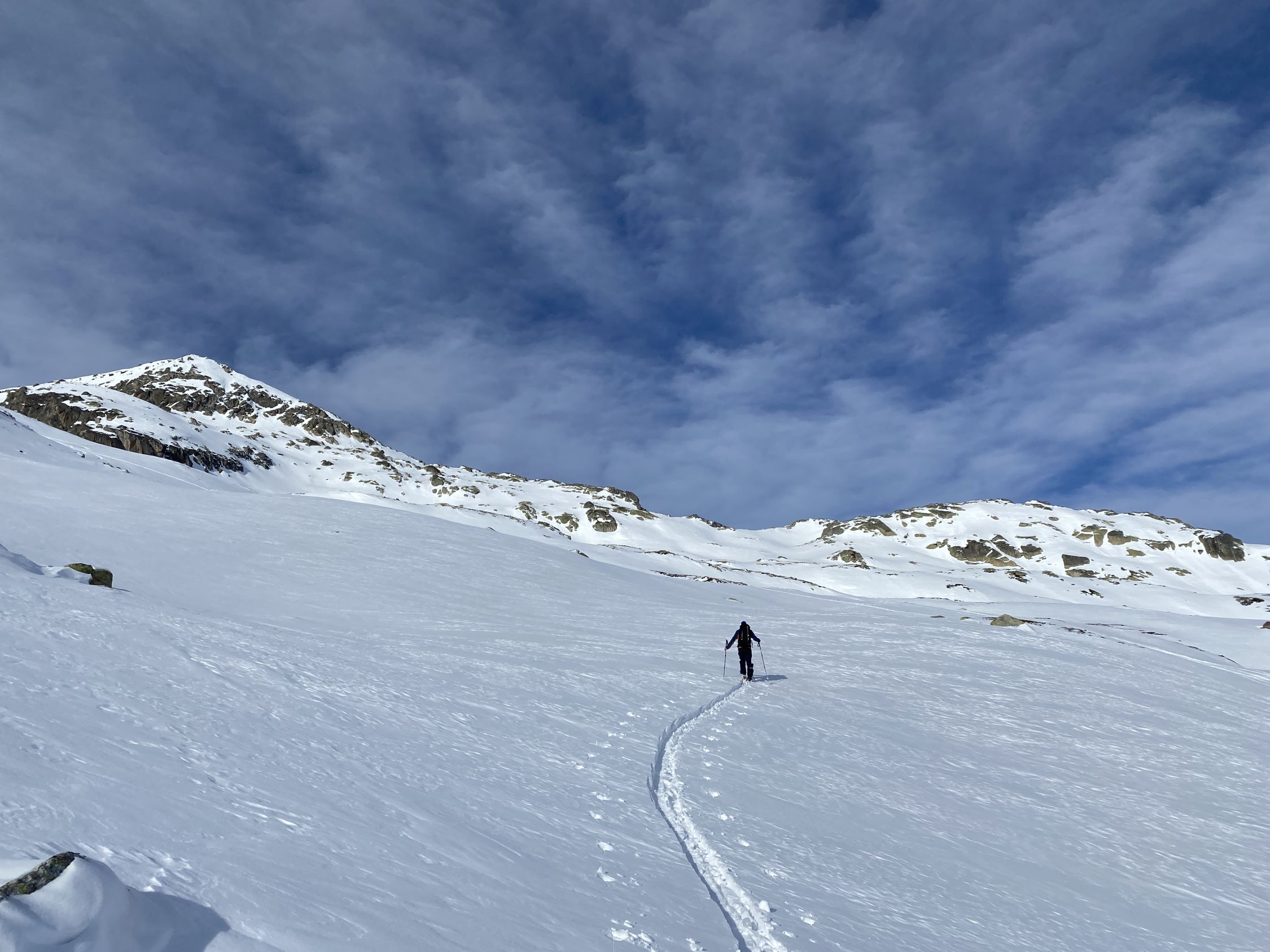 Gestartet 09:00. Beim Aufstieg war der Schnee zuerst eher weich und nur wenig hart, dank milden Temperaturen. Weiter oben Mix aus Presspulver und mal sulzig.