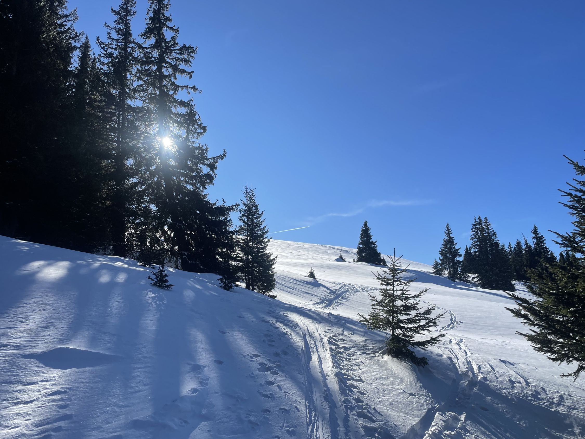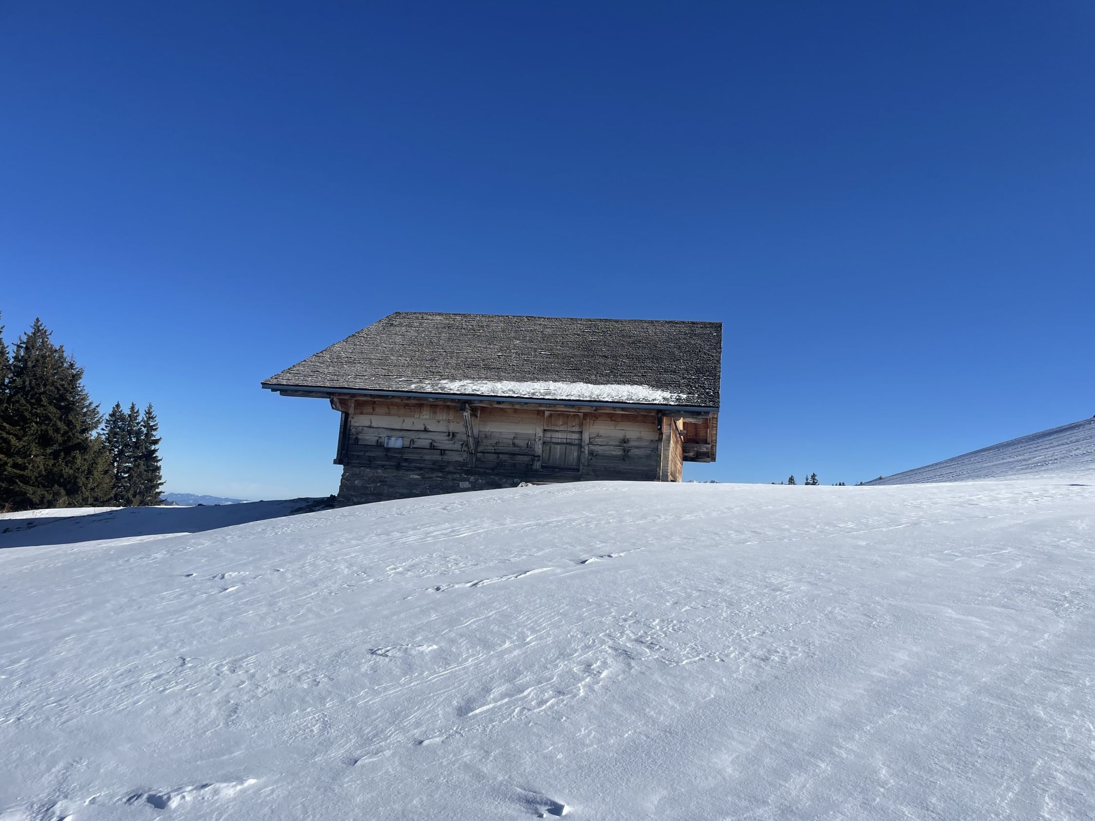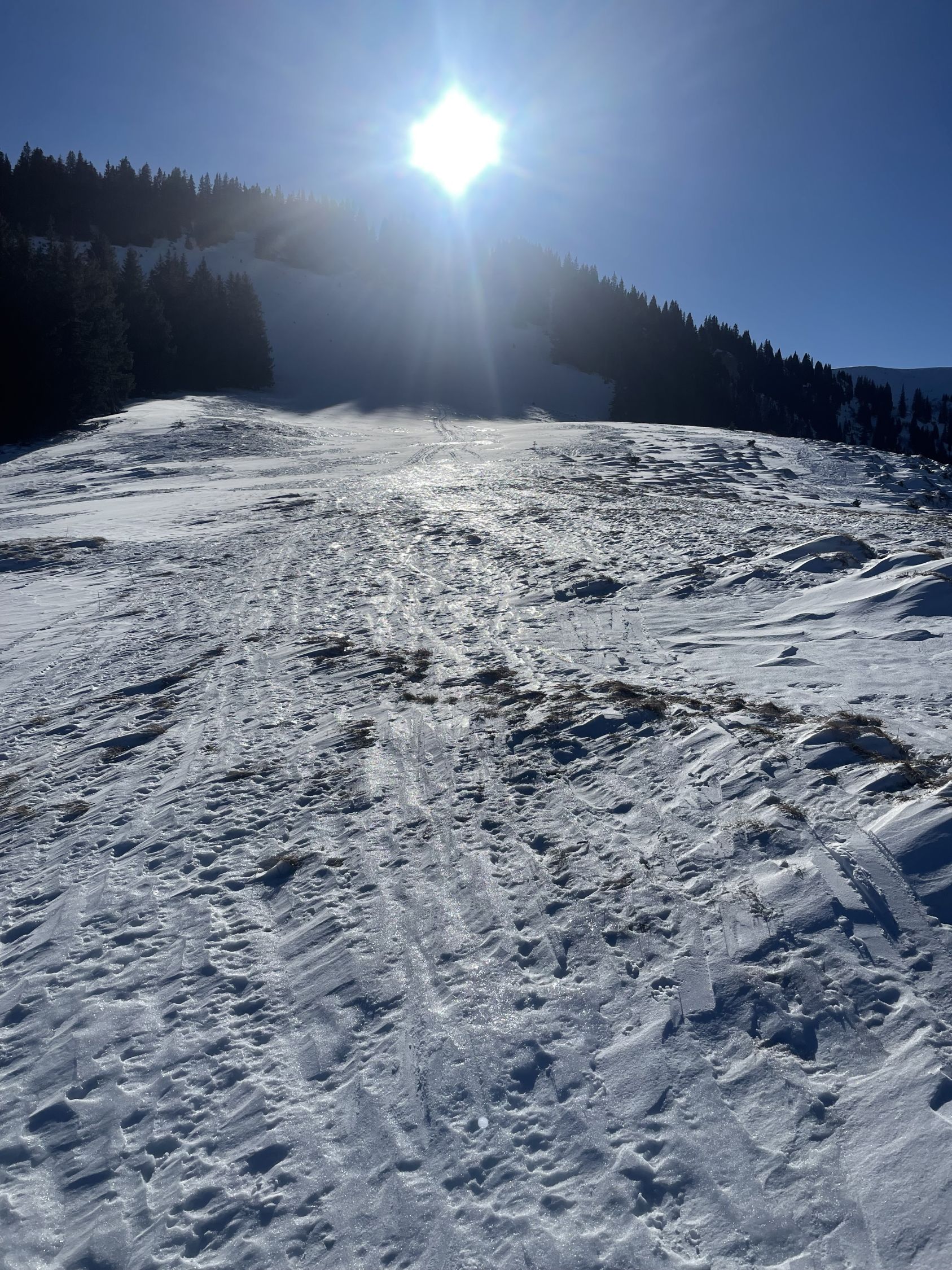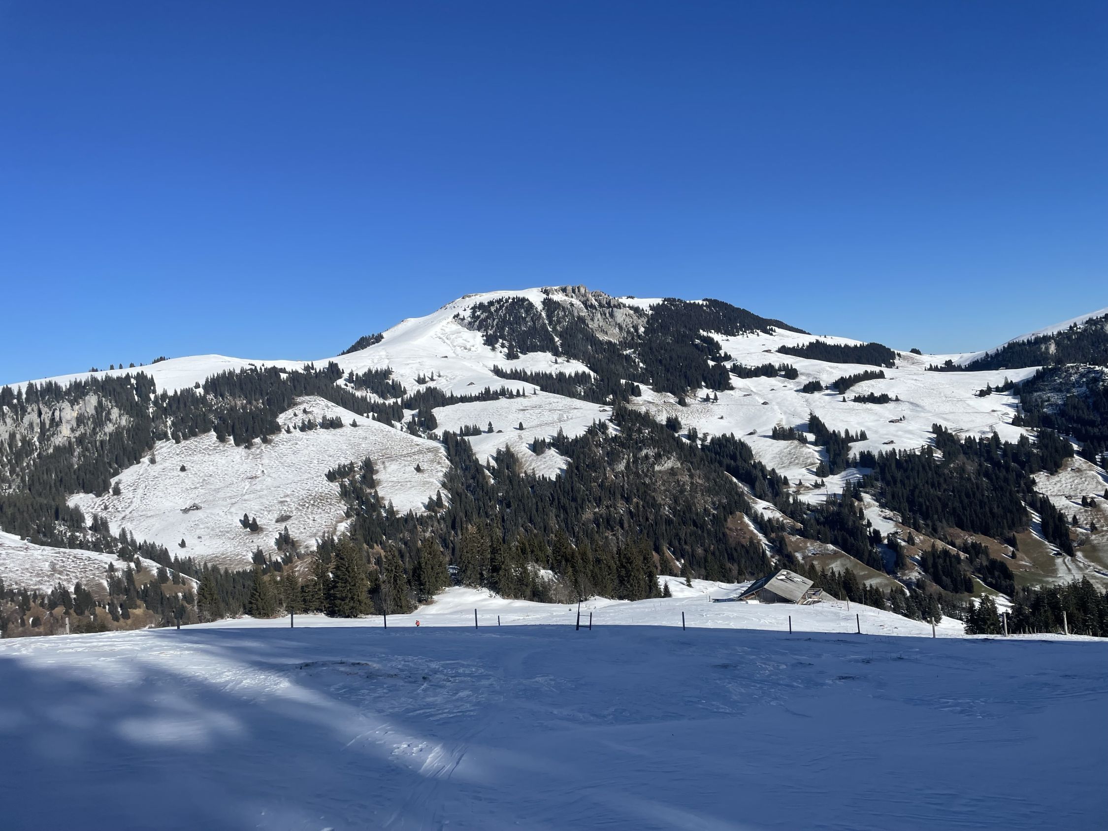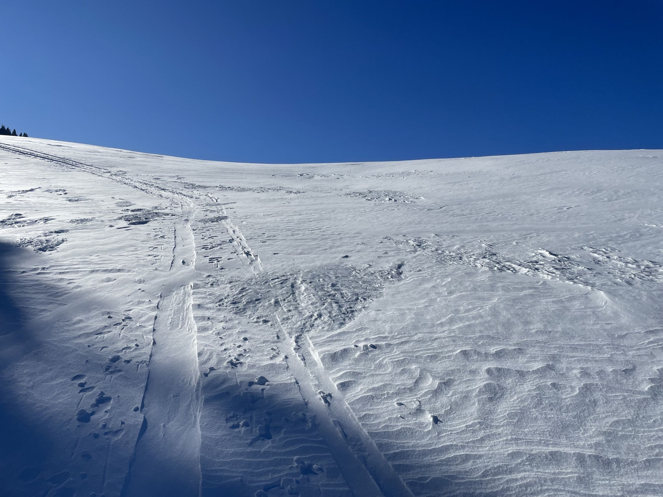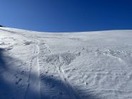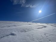 Glanzvolles Wetter, minus 2 Grad beim Start und ein Hauch Neuschnee von vergangener Nacht, unten 1-2 cm, oben ca 5cm, und erstaunlicherweise wenig Leute hier, da muss man „ausgezeichnet „ geben. Minimes Gemecker gäbe es allerdings schon, dazu später. Aufstieg problemlos, unten nur sehr wenig Unterlage, aber da hat man ja die Alpstrasse. Weiter oben ab der Sennhütte teils abgeweht und eisig. Das kurze Steilstück zum Glück nicht verweht und gut zu gehen. Oben fast alleine, und das an einem Sonntag:-). Abfahrt: im Gipfelhang teils Winddeckel, teils schöner Pulver. Weiter unten je länger je mehr die alten Spuren spürbar, das ratterte wie Tramschienen. Letzter Hang auf der Strasse gut fahrbar. Wind und halt wenig Neuschnee waren bei der Abfahrt ein wenig Spielverderber, aber das ist Jammern auf hohem Niveau.