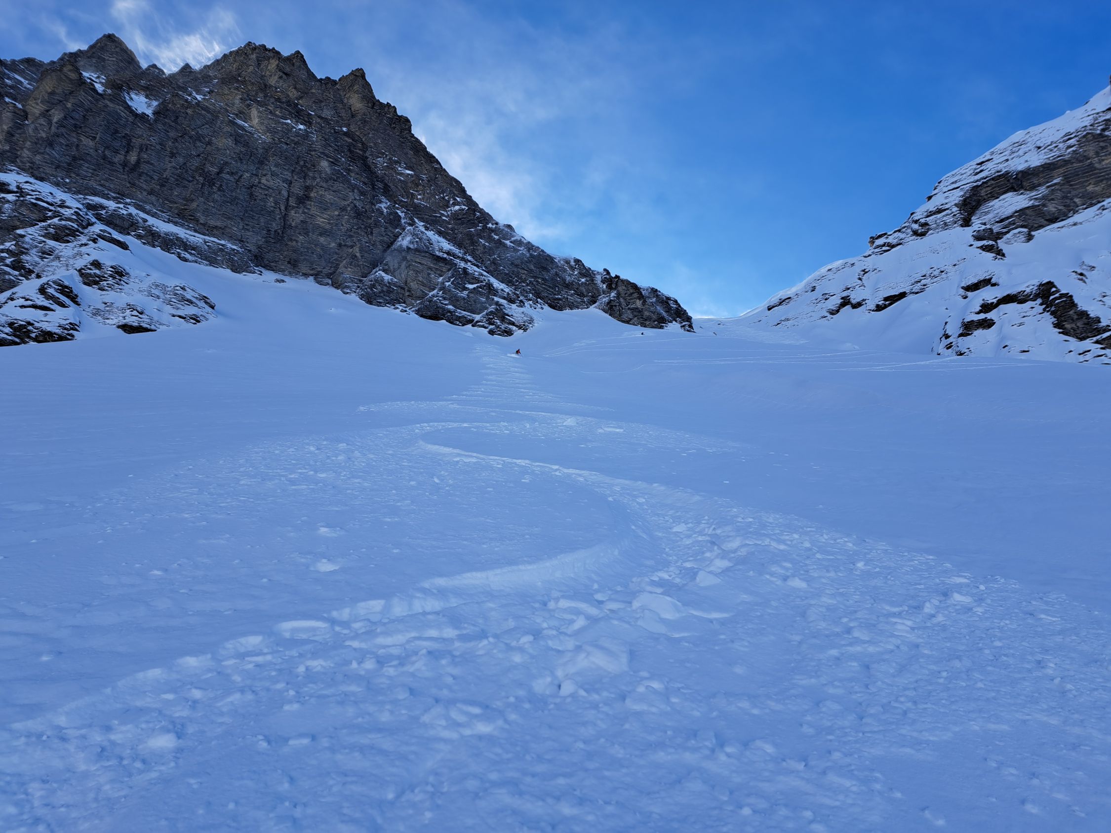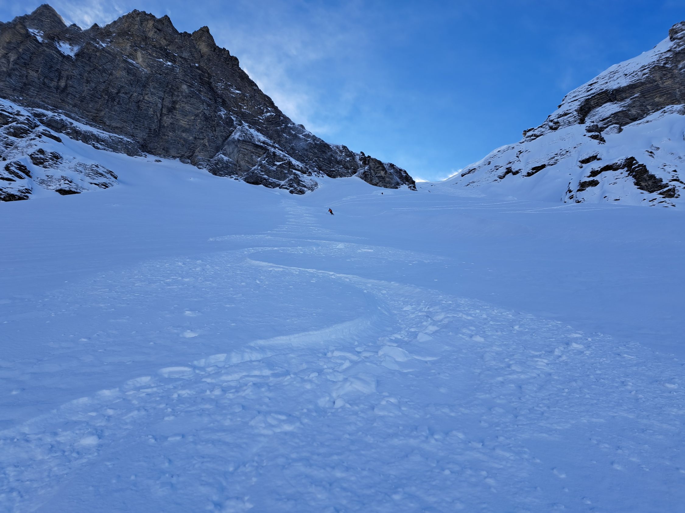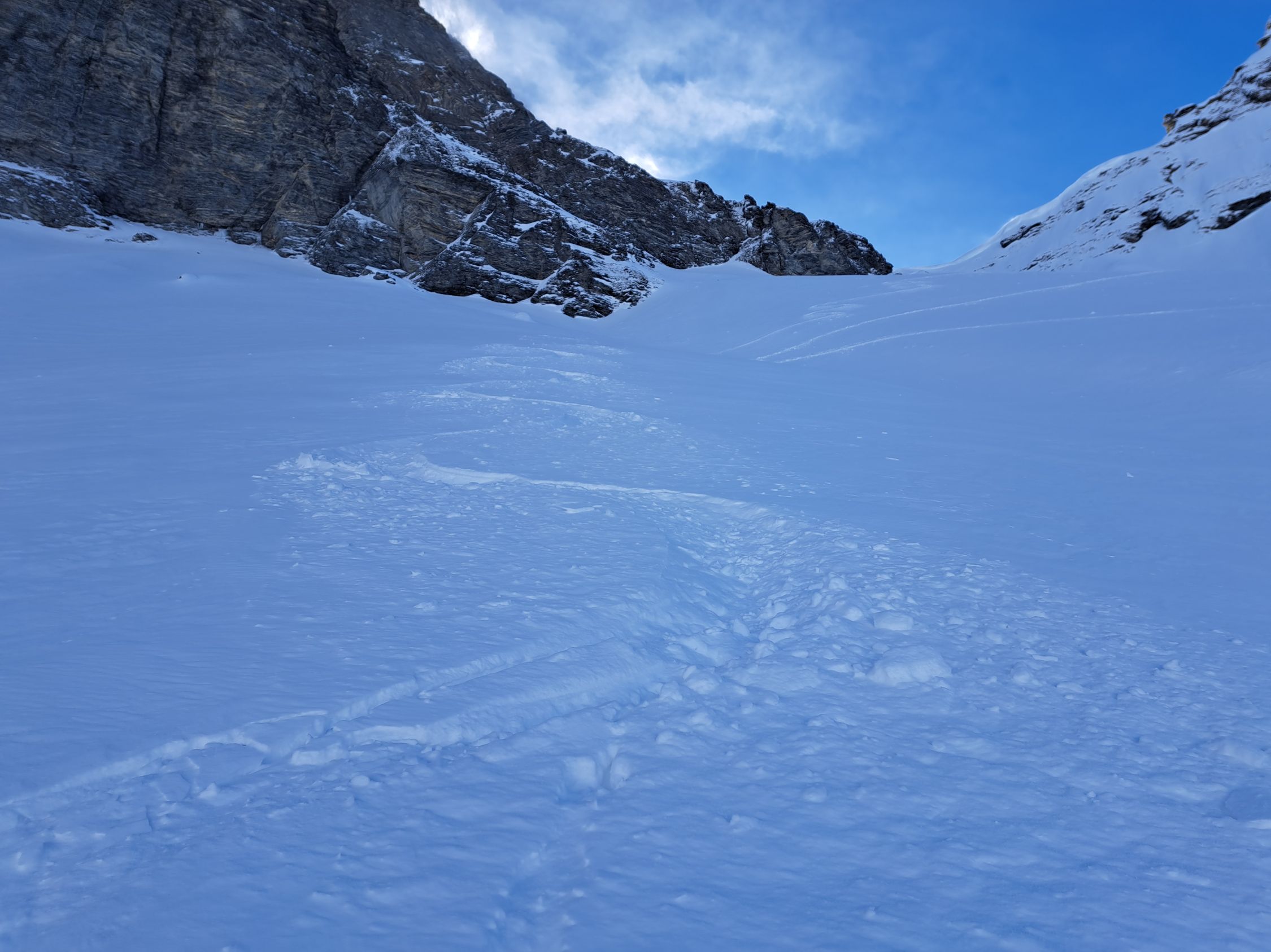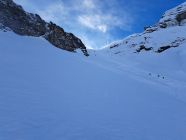 In der Mulde unter der Wächte ca2300m löste er ein kleines Triebschneebrett aus das 2 der nachfolgenden türeler noch ca.20m mitriss aber unverletzt