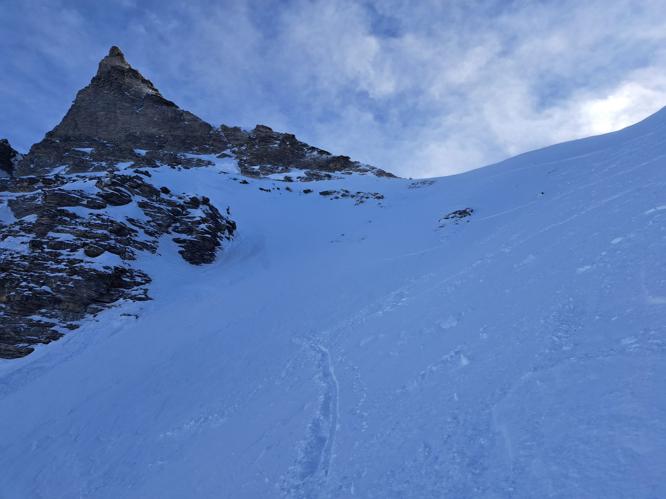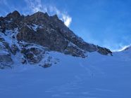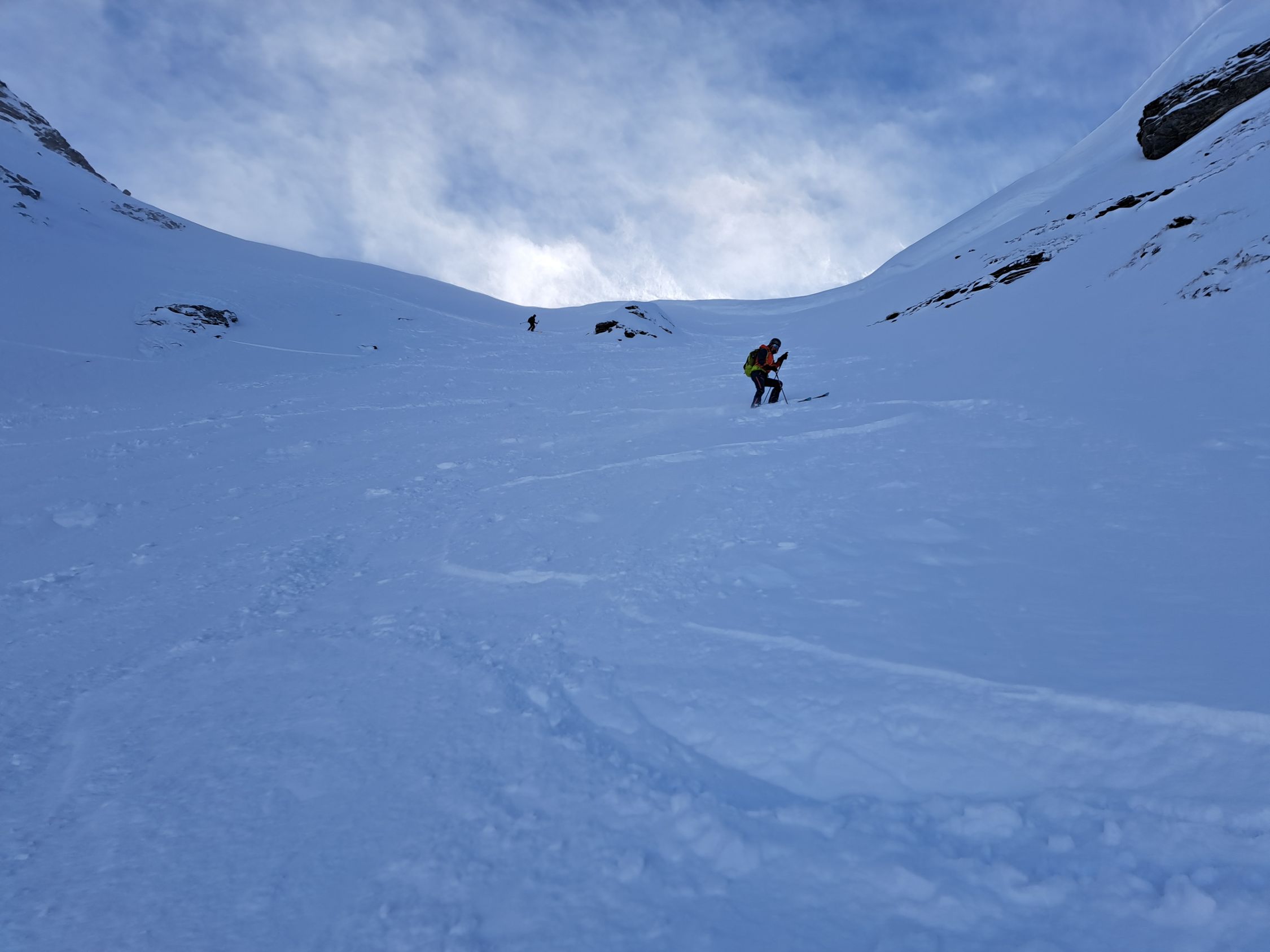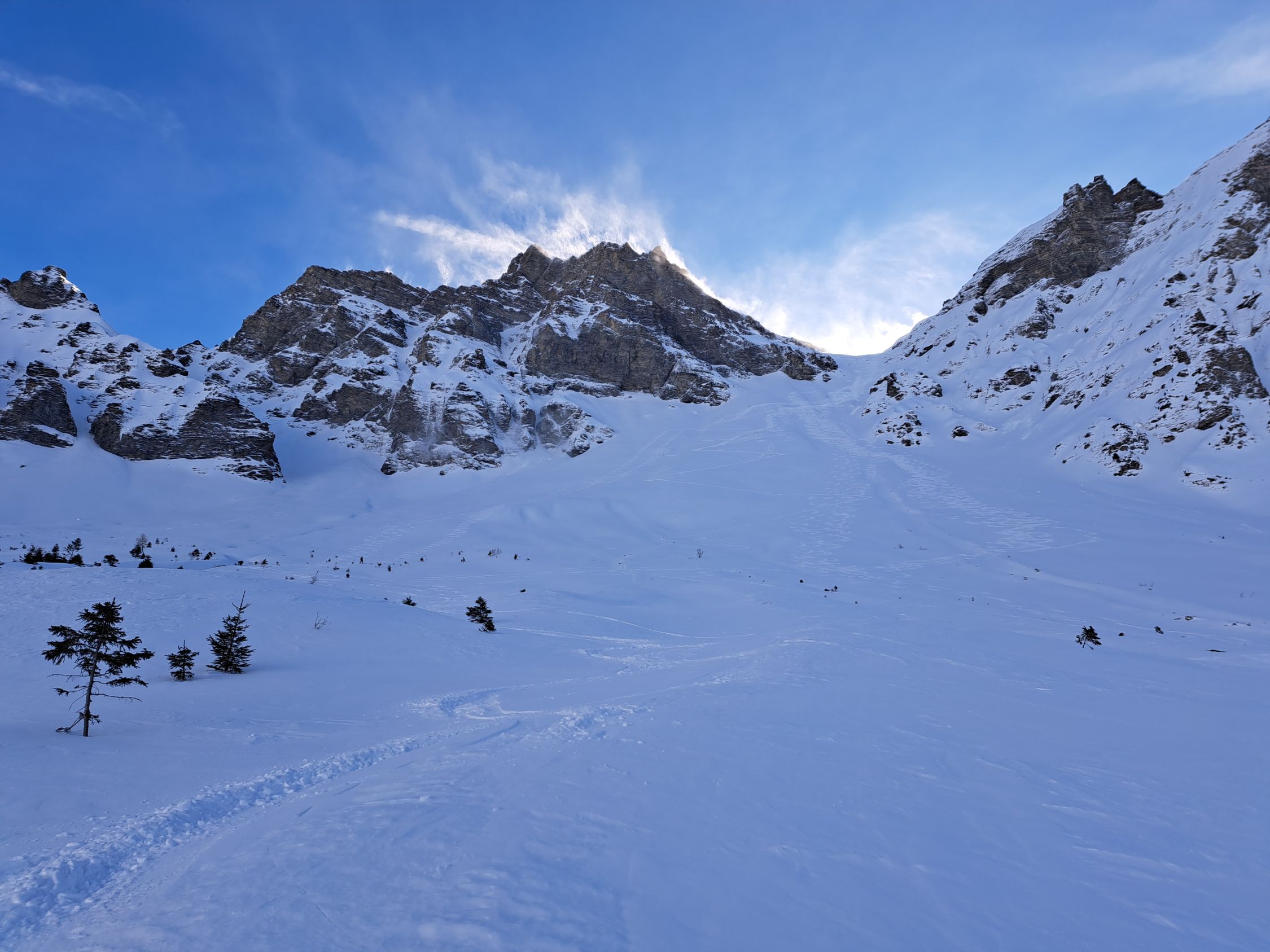 In der Mulde unter der Wächte ca2300m löste er ein kleines Triebschneebrett aus das 2 der nachfolgenden türeler noch ca.20m mitriss aber unverletzt