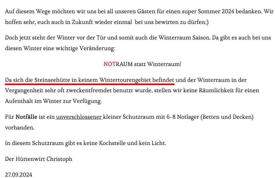 Hier stiehlt man sich einfach mit einer Falschbehauptung (kein Wintertourengebiet) aus der Pflicht einen solchen bereit zu halten.