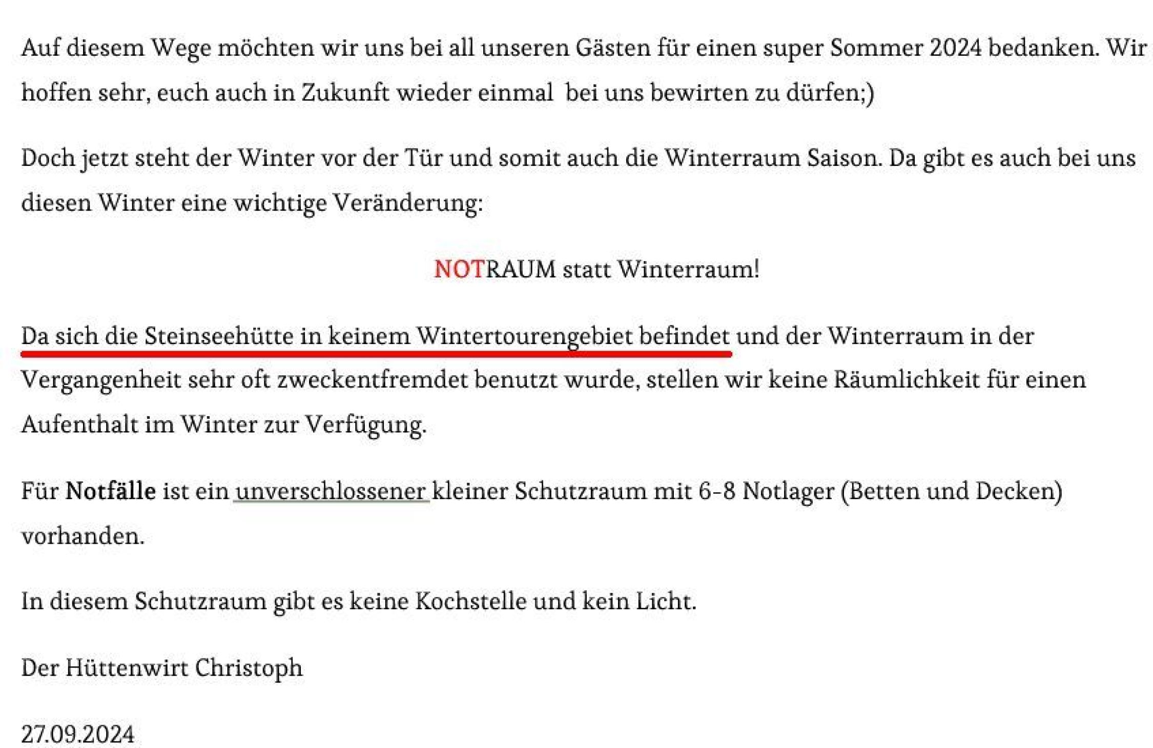Leider wurde der Winterraum auf der Steinseehütte geschlossen; angeblich weil sich die Hütte nicht in einem Wintertourengebiet befindet, was ganz klar gelogen ist, wie die Bilder zu diesem Beitrag belegen.