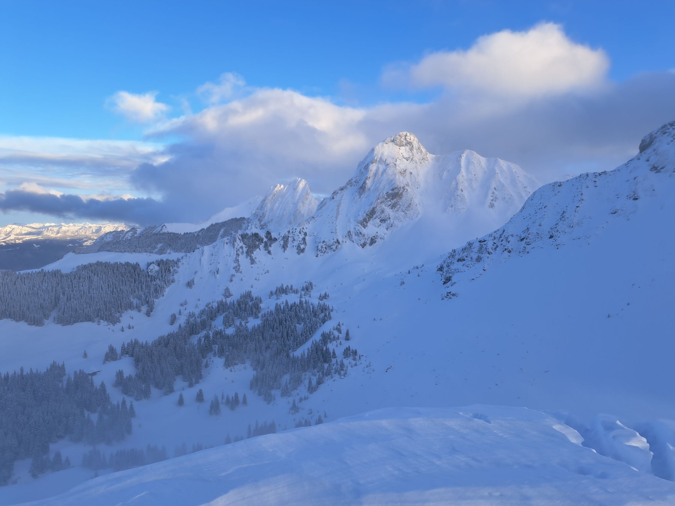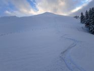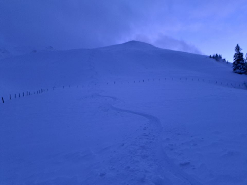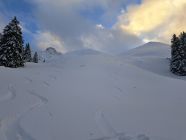 Ab Untere Gantrischhütte 20 -50cm Pulverschnee der vom starken Südwestwind ungleichmässig verteilt ist.