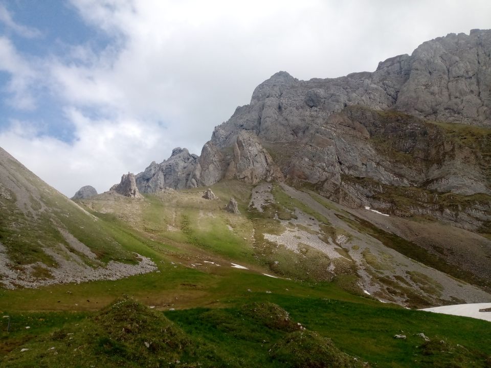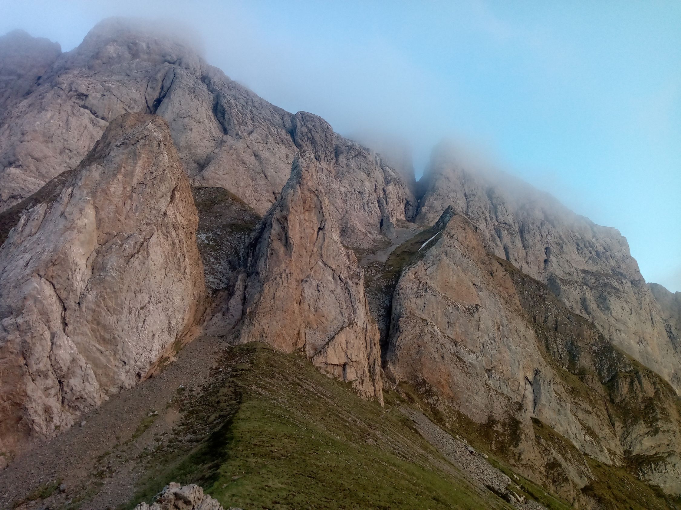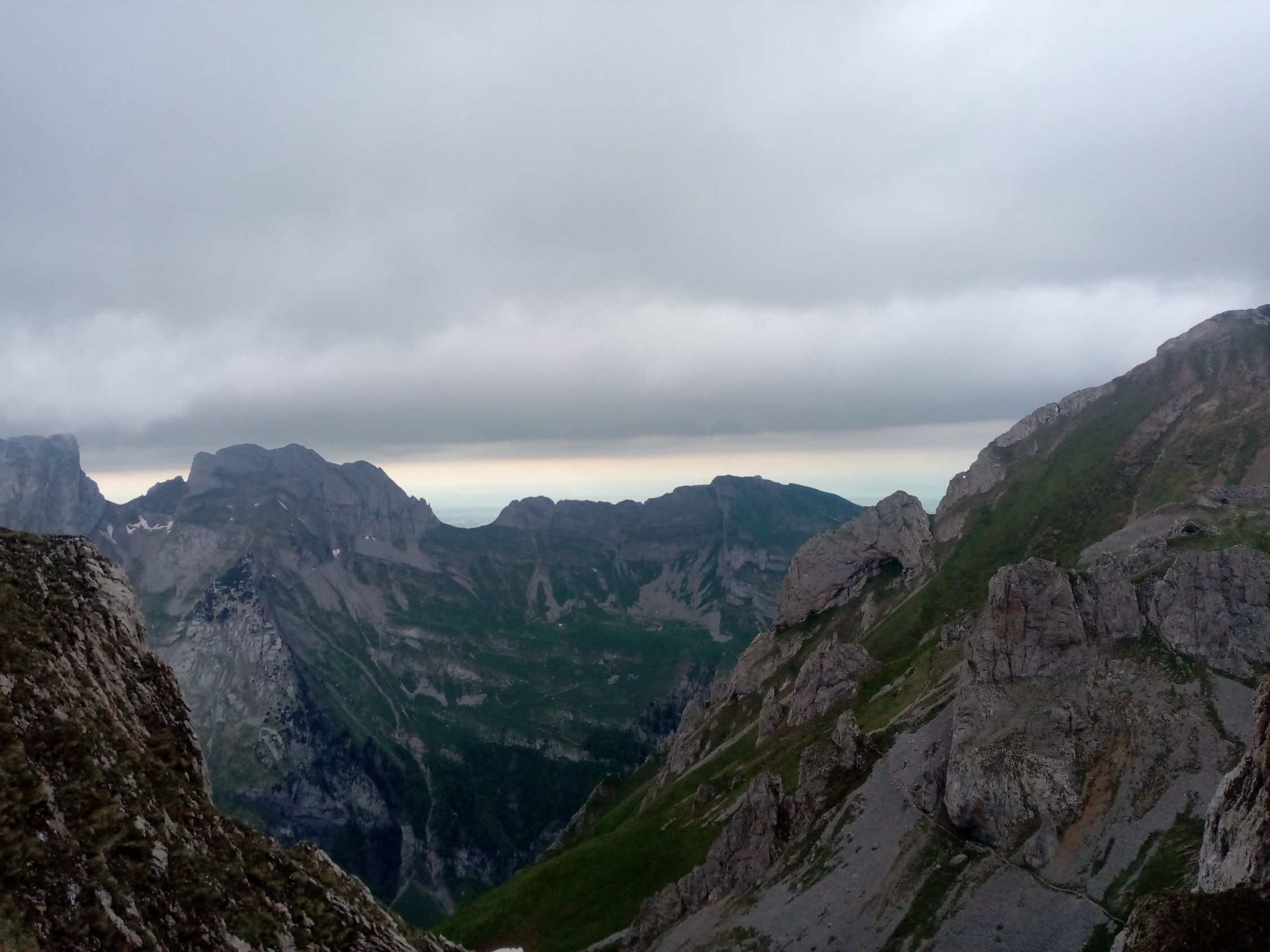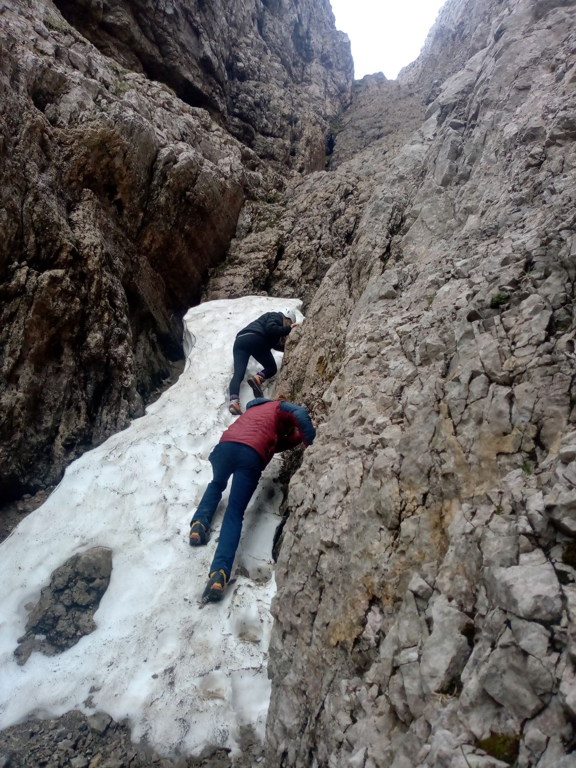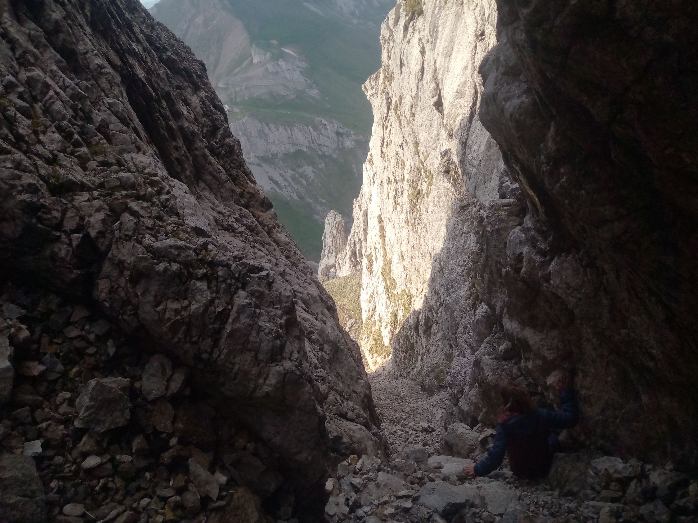Kraxelstellen feucht, vor allem im Abstieg etwas ungemütlich. Es liegt etwas Schnee im Kamin, dieser ist nicht umgehbar aber Pickel wurde nicht benötigt.