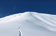 Abfahrt: Der windgepresste Neuschnee konnte im Gipfelhang nach Schönbüel hinunter mit etwas Kraft gut gefahren werden. Der Winddeckel trug zwischendurch fast. Die Abfahrt zur Üsseri Alp war gut, jedoch auch mit windgepresstem Schnee.