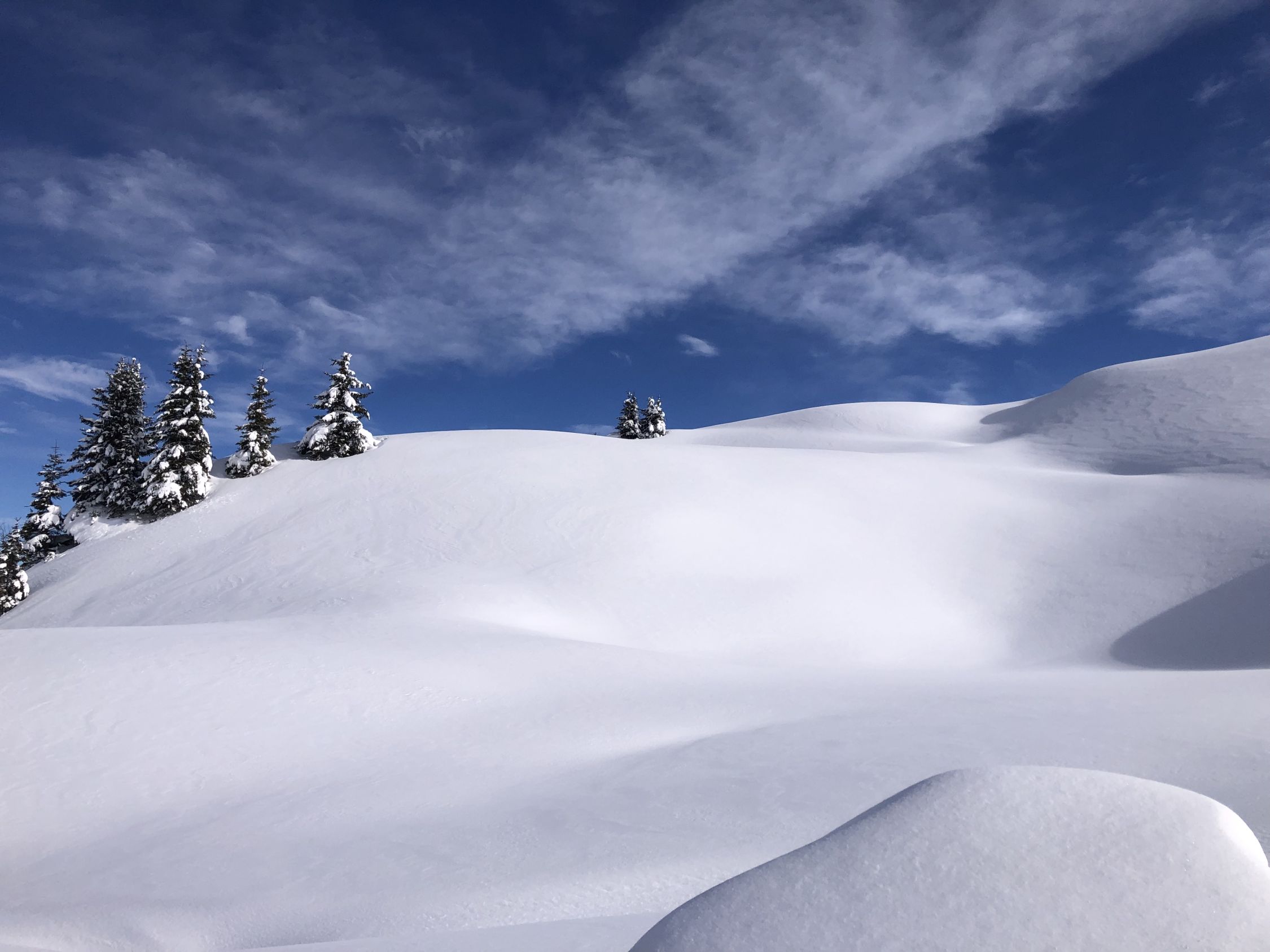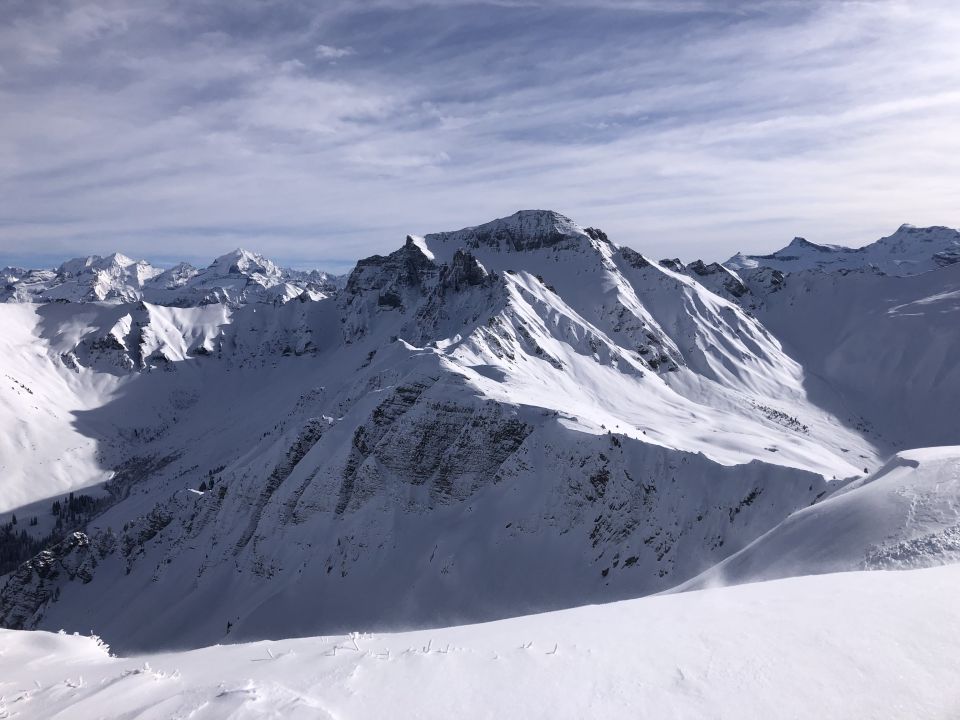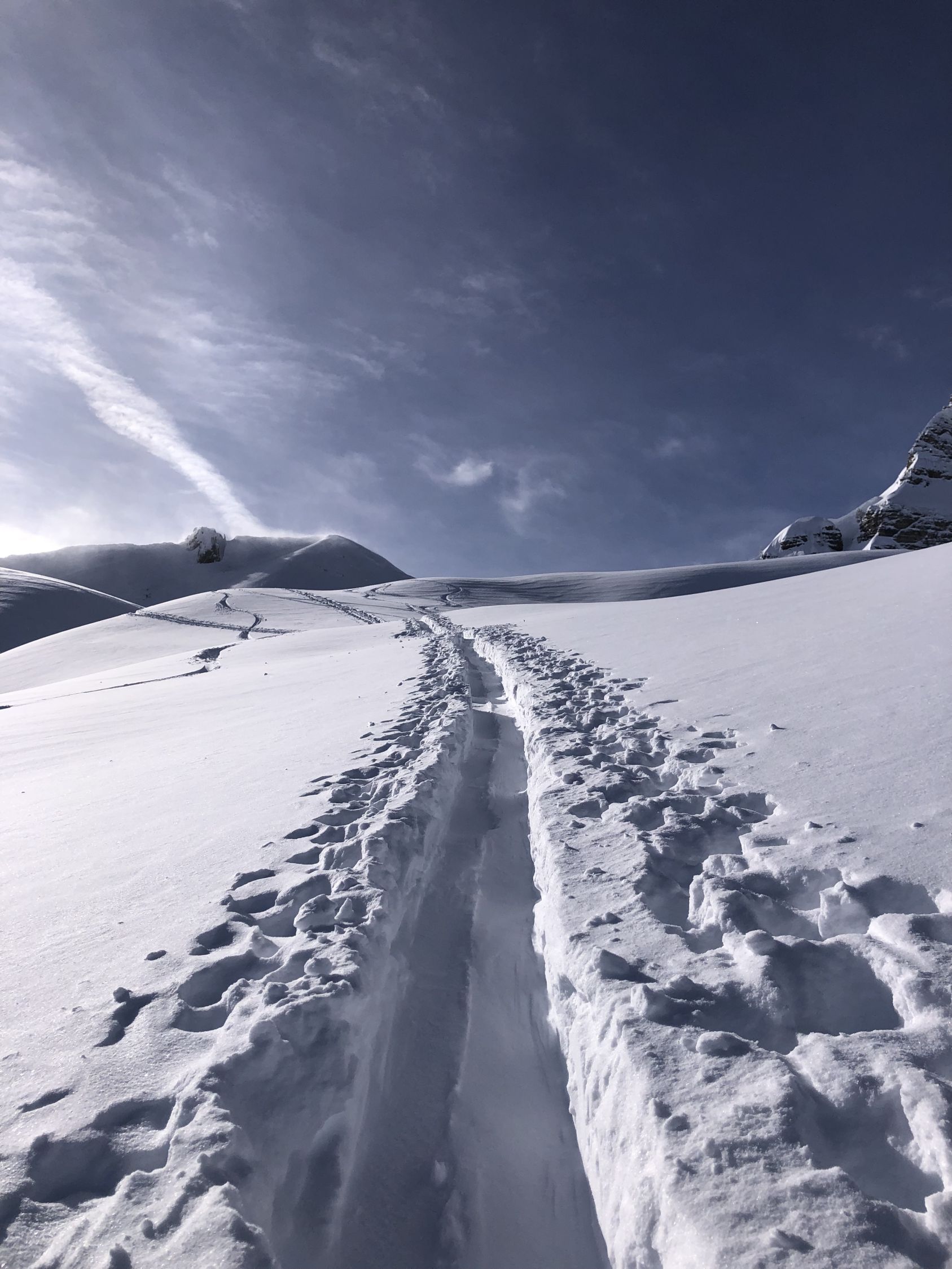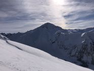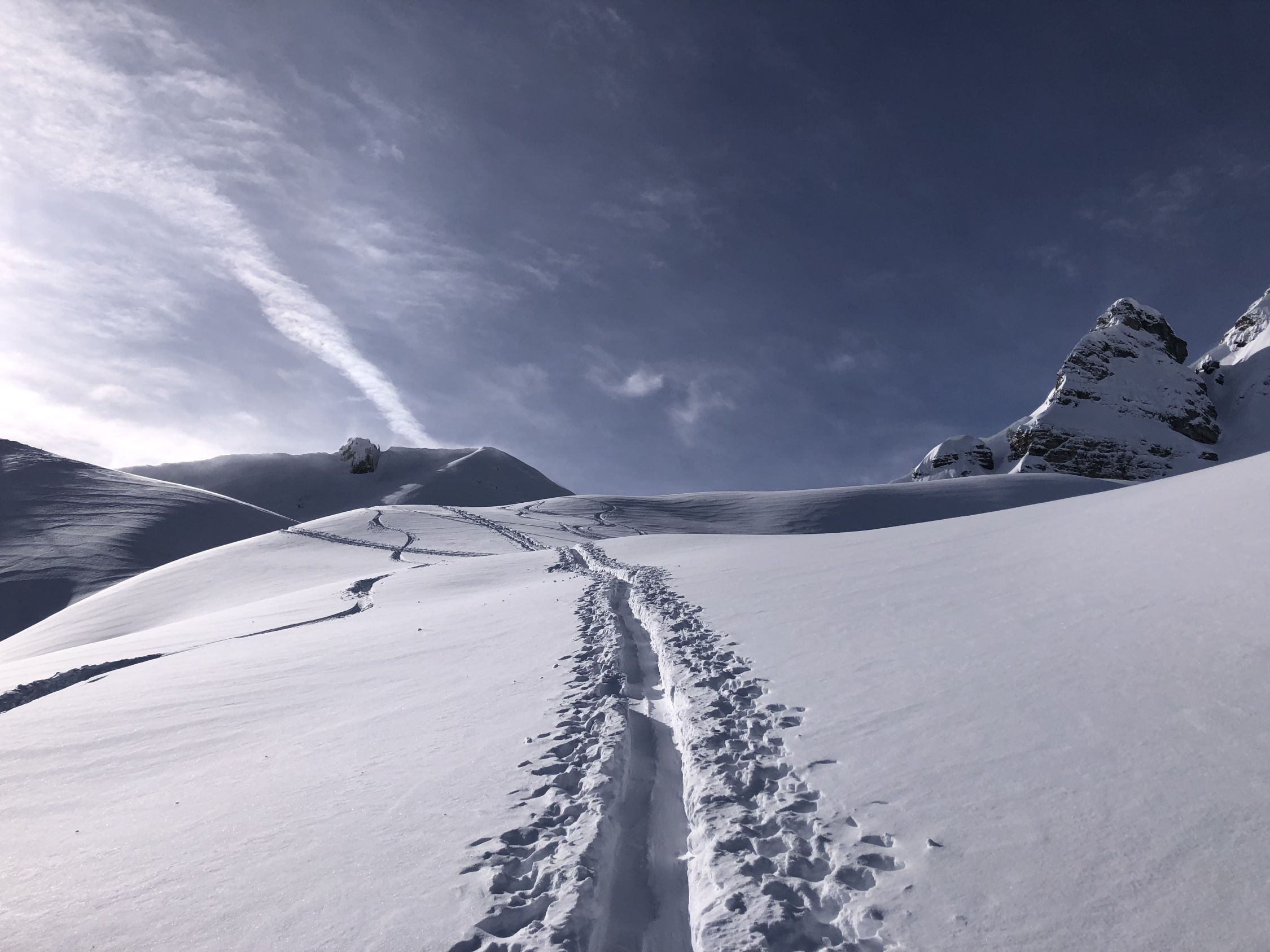 Später Start heute 10.15, ab Hotel Spillgerte, dafür Aufstieg mehrheitlich im Sonnenschein. Strasse ab Parkplatz top eingeschneit in alle Richtungen. Es hat oberhalb 1450m ca. 30cm Pulver gegeben. Der Gipfelhang wie erwartet windbearbeitet, Presspulver, stellenweise hart und eisig. Trotzdem gut fahrbar. Unterhalb Grimmifurggi dann top Pulver, so wie wir es lieben, locker flockig, ohne Windeinfluss.