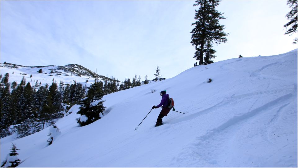 Ab dort dann mehrheitlich pulvriger Schnee mit oder ohne Unterlage, auf dem Forstweg dann ganz entspannt zum Parkplatz.