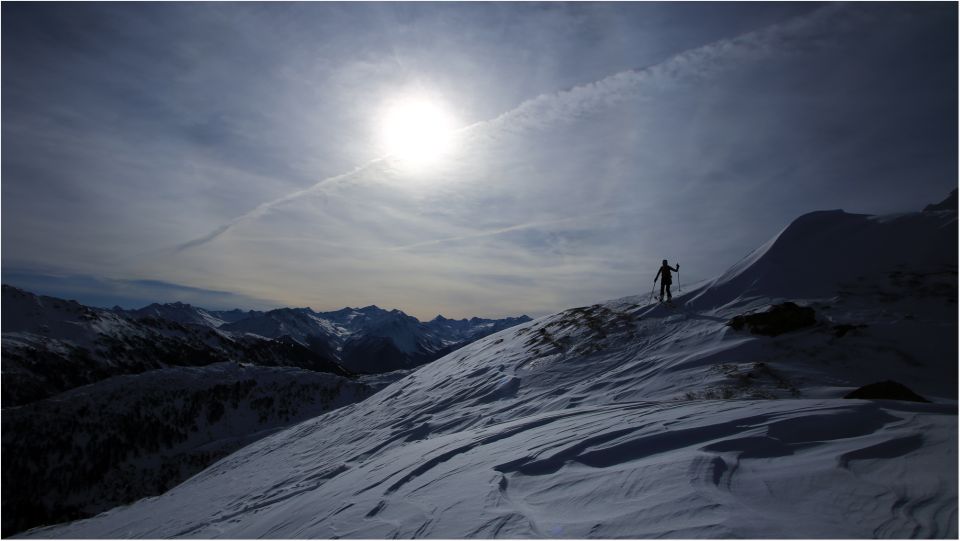 Gleiches Bild oben am langen Rücken, dort allerdings teilweise bockhart, dann wieder tiefer, plattiger Schnee.