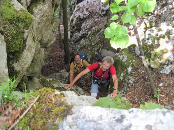 Fallern 554 m beim Bergsteigerparkplatz ist unser Treffpunkt und unter der kundigen Führung von Max vom Jurasüdfuss starten wir unser spannendes Unterfangen. Dem Chesselbach folgen wir bis zum Forsthaus 620 m und marschieren auf der offiziellen Wanderroute Richtung Balmfluechöpfli, überrunden dabei eine Grube und bald stehen wir vor einem auffallend grossen Steinmann. Dieser markiert den Aufstieg zum Einstieg der Eulengrat-Kletterroute. Nordwärts, in sehr steilem Gelände gewinnen wir auf Pfadspuren rasch Höhe und stehen bald unter der Glatten Flue. Für nicht ganz Schwindelfreie empfiehlt es sich hier, zur mentalen Unterstützung eine Reepschnur aus dem Rucksack zu holen und mit gemeinsamer kameradschaftlicher Hilfe die ausgesetzteren Passagen zu erklimmen. Primär hilft uns eine Kette, ein abschüssige Flanke zu überwinden. Nach der Wurzelwegpassage und einer sehr hübschen Traverse stehen wir unvermittelt an einer sonnigen Kante mit traumhaftem Tiefblick und mittels leichter Felskraxeleinen (I) stehen wir bald auf dem Eulengrat. Um zum Gratbuch zu gelangen, steigen wir einige Meter wieder runter. Ein hübscher Aussichtsplatz lädt und kurz zum Verweilen ein, wieder ein Platz an der Sonne, das will genossen sein. Unter uns sehen wir die Kletterer am Eulengrat, während wir auf deren Abstiegsroute (T4-Gelände) hochgestiegen sind. Nordostwärts, wiederum auf Pfadspuren, später auf dem Wanderweg peilen wir nun das Balmfluechöpfli 1290 m an. Als Variante lässt sich dieses ebenfalls direkt dem Grat entlang ersteigen. Nach dem pünktlichen Mittagessen pilgern wir auf dem Wanderweg weiter, hinab zur Nesselbodenröti, dem Gratweg entlang (bietet schöne Tiefblicke) auf das Röti 1395.2 m, westwärts und bordrunter zum Wegweiser "Hammerweg" 1271 m. Oberhalb der Touristenstrasse führt dieser durch den Wald, westlich vom Chänzeli, via Risimatt gehts zum Nesselboden. Via Stigelos gelangen wir zum Ausgangspunkt.