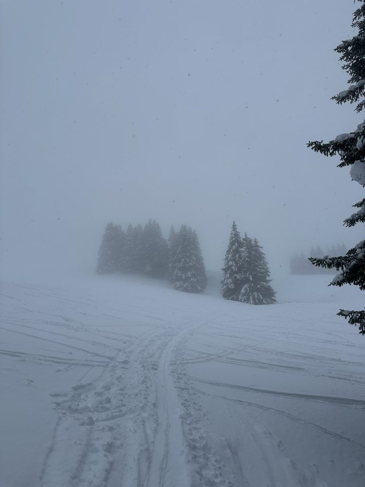 Beim Brätliplatz zwei sehr freundliche Tourengängerinnen getroffen, weiter durch den Nebel Richtung Stand - auf den letzten Höhenmetern klart es auf. Erste Abfahrt Westseite, gute Sicht, sehr guter Schnee, also gleich nochmal hoch, Piquenique und runter auf der Nordseite, wieder suuper! Unter Hindermenige wird der Schnee schwer, macht nix - wie meist war es viel besser als erwartet :))