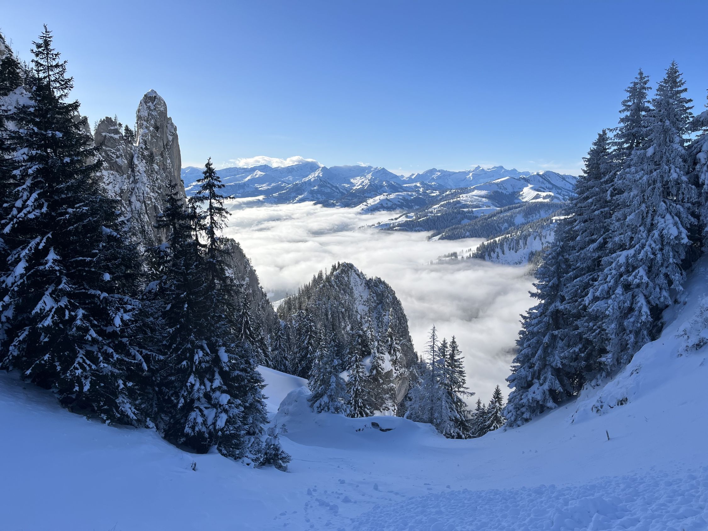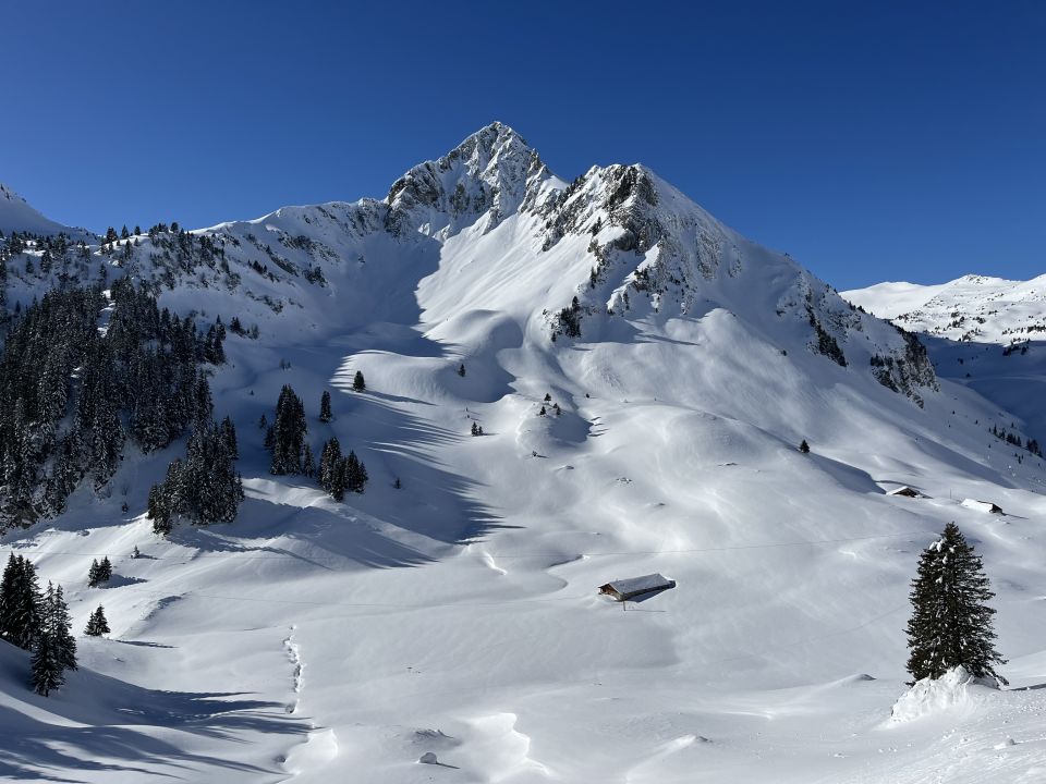 Schnee ab etwa 1200 m, schöner gesetzter Pulverschnee ab etwa 1400 m. Sehr angenehm zu begehen bzw befahren.