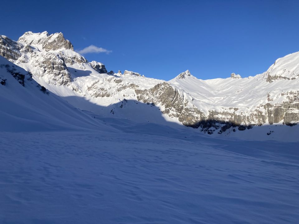 Ich bin unterhalb der Gross Gade einer Spur von den letzten Tagen gefolgt, welche mich in etwa zum Pt. 1991 südlich des Lang Bodens brachte und mir eine kurze Fellabfahrt zur originären Skiroute einbrachte.