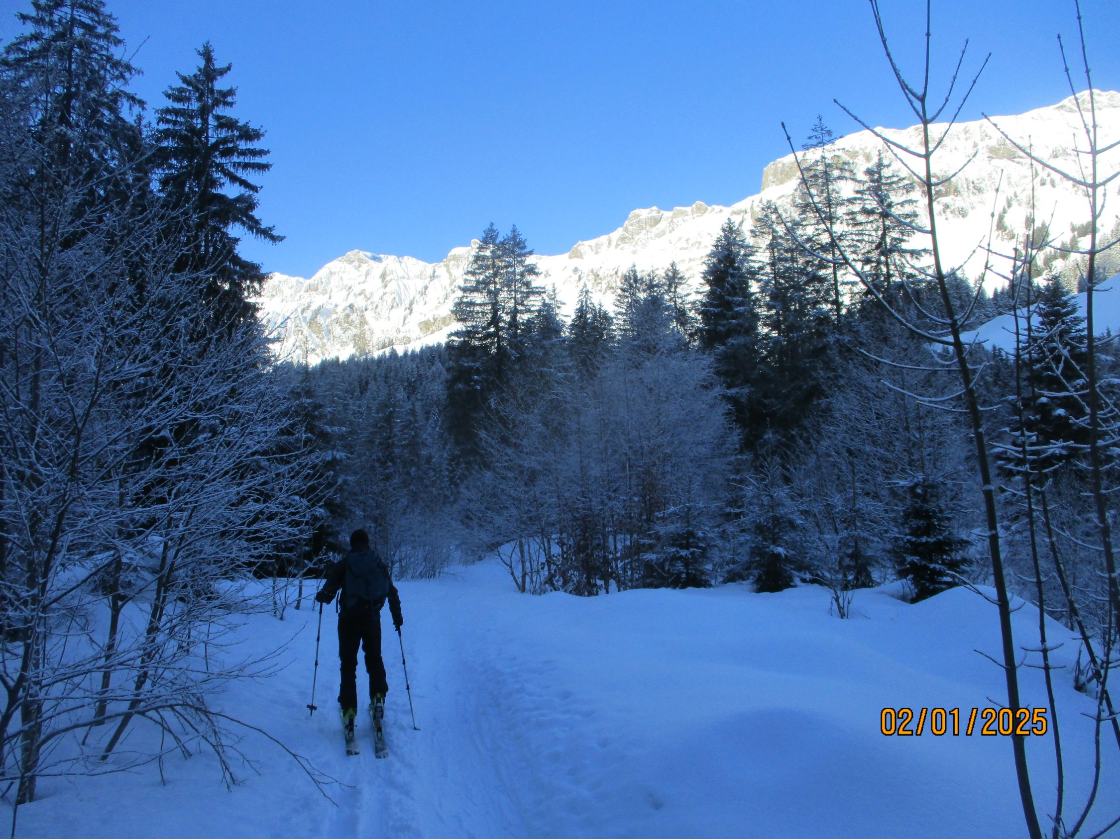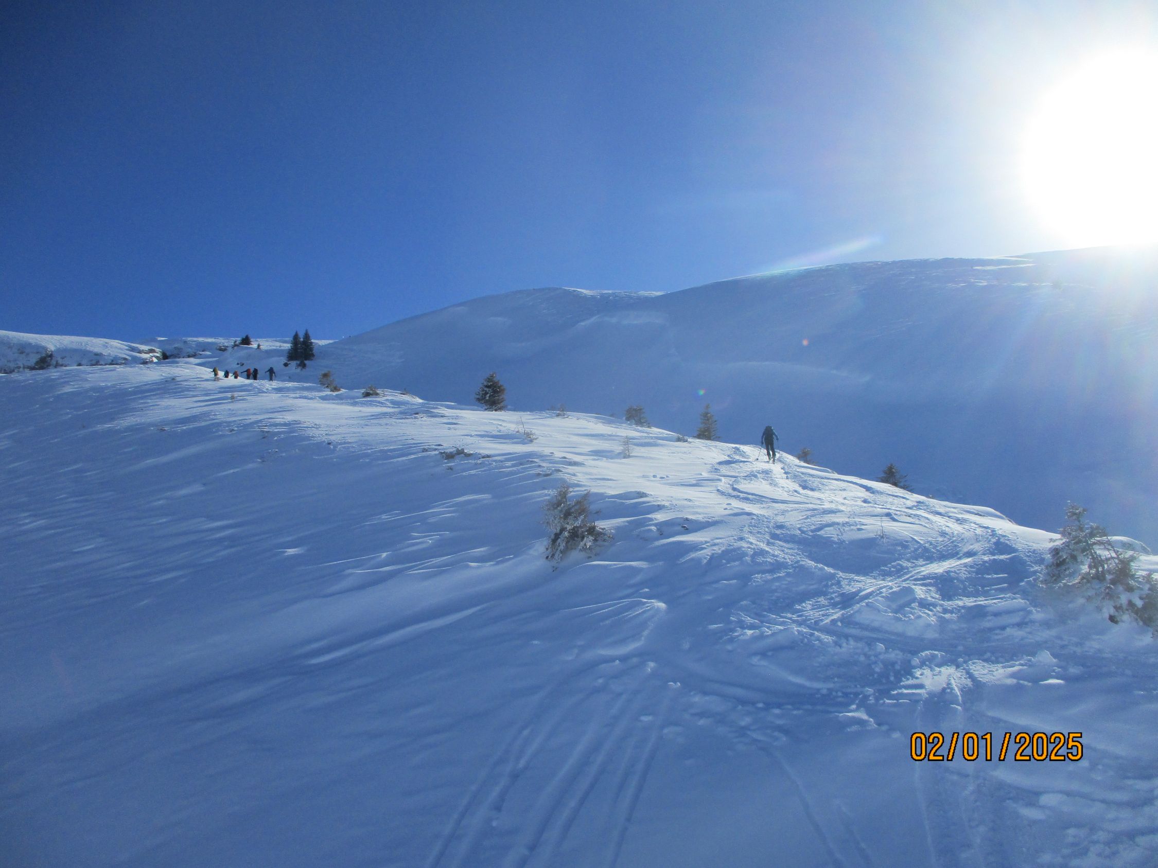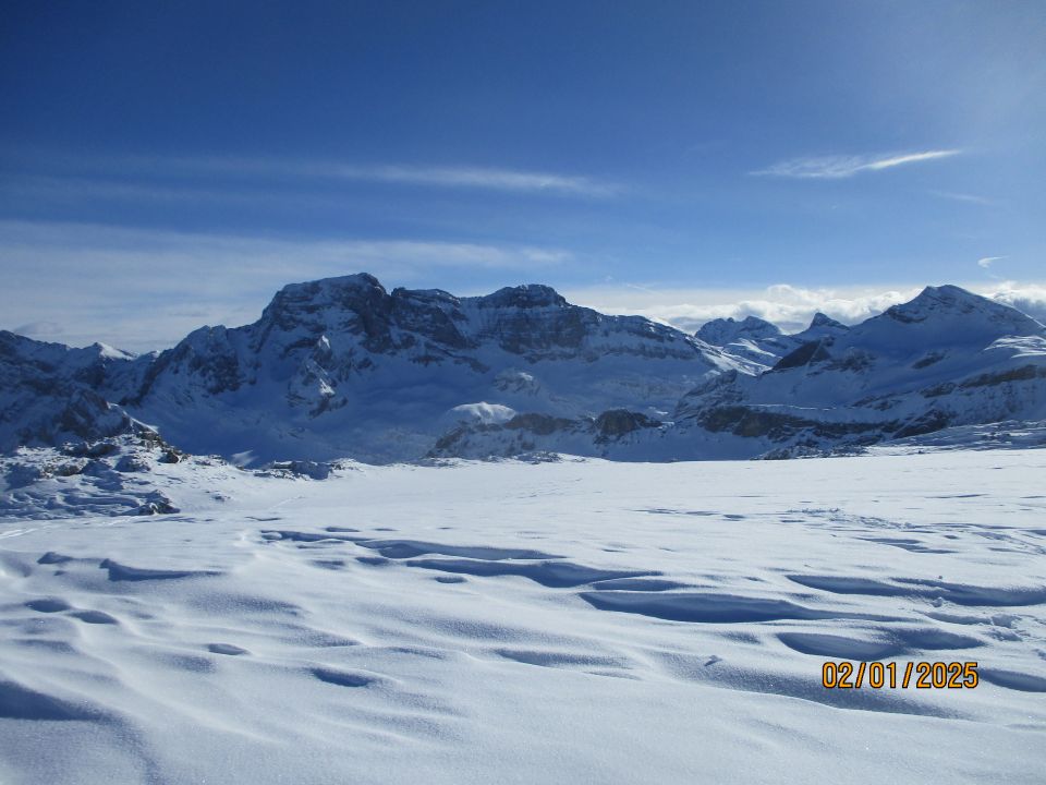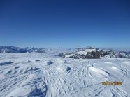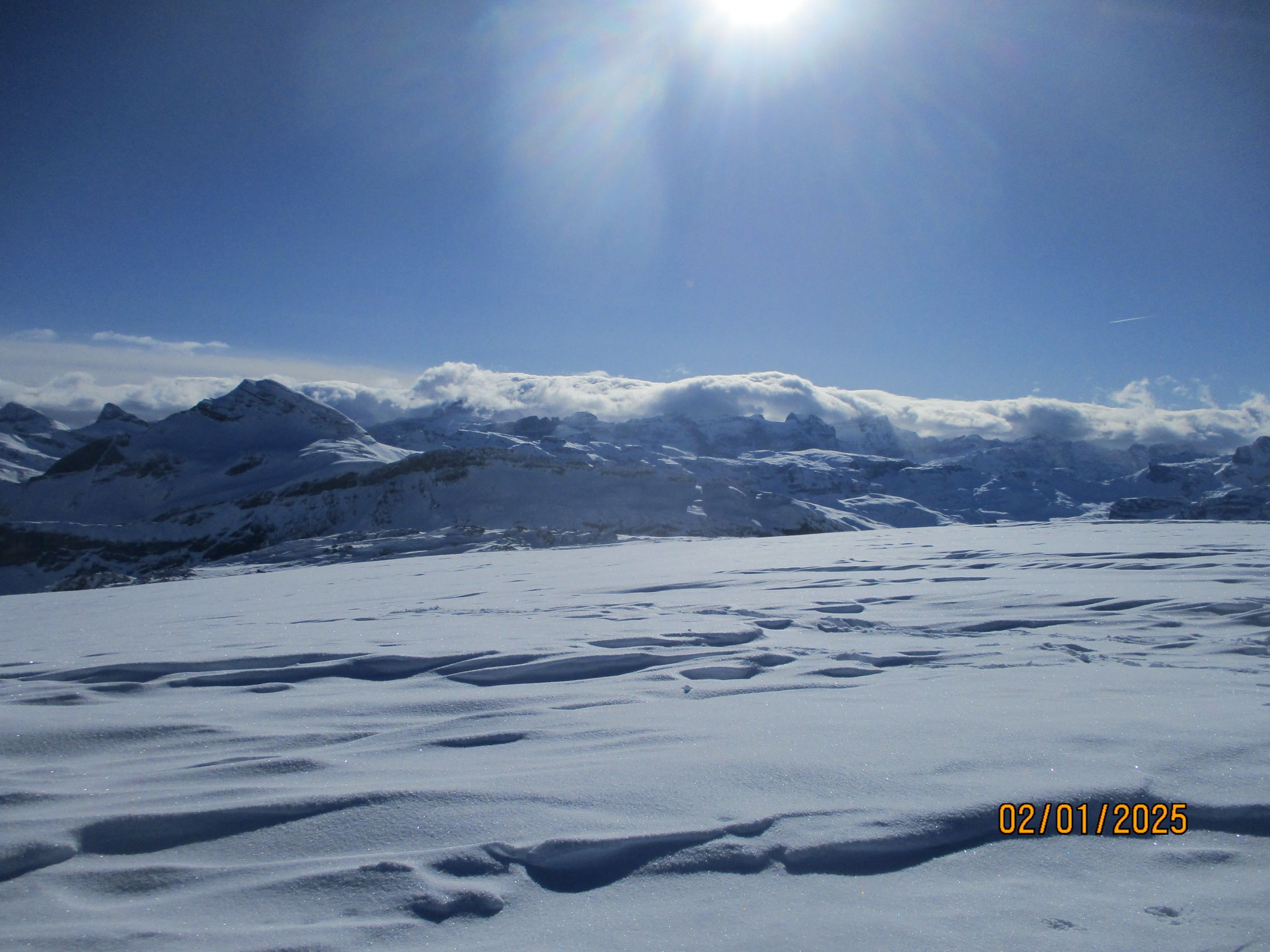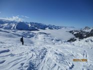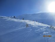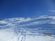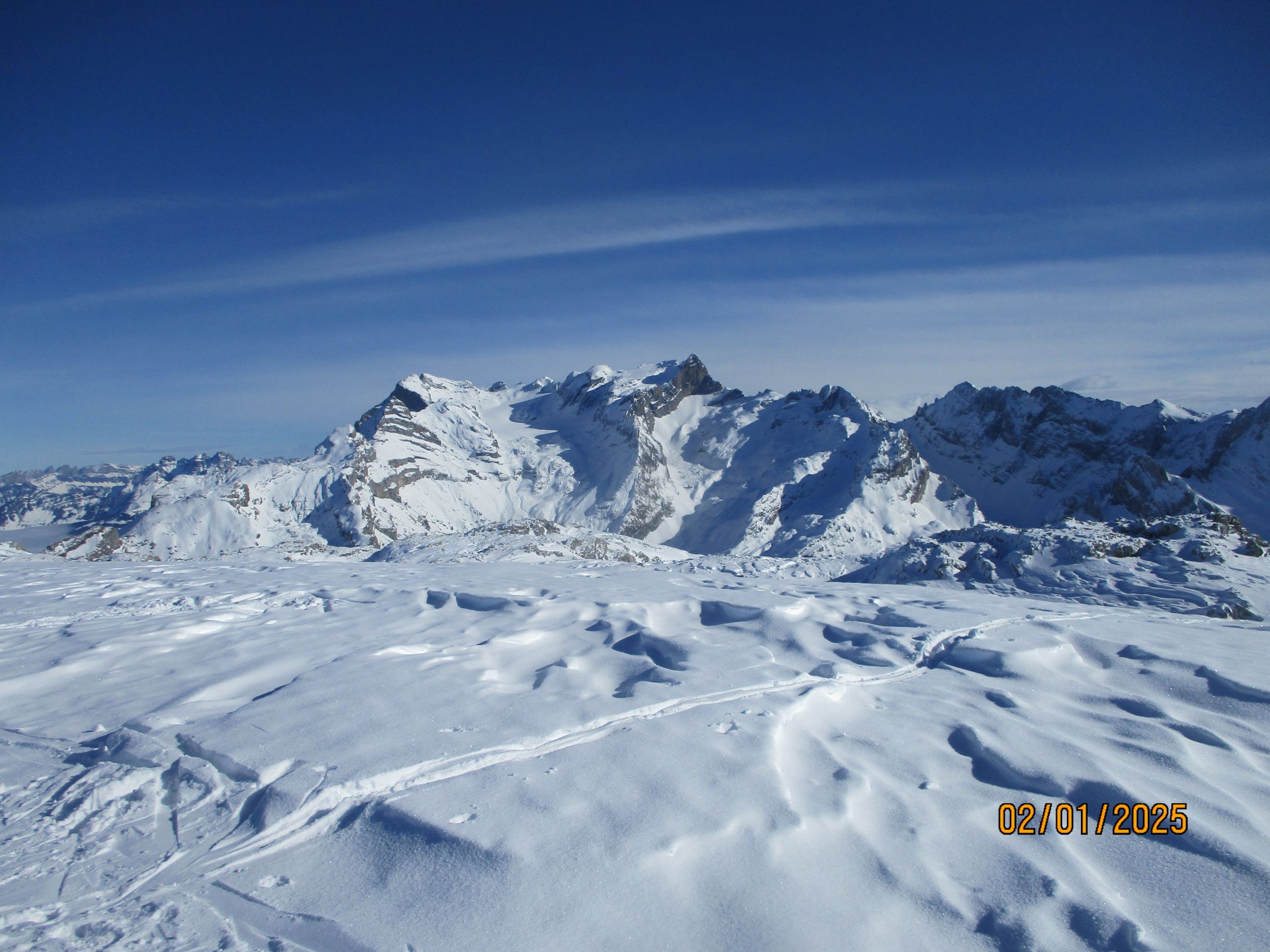 Ein tadelloser Tourentag mit an und für sich tadellosen Verhältnissen - mit einem Manko: die meist üppige Schneedecke ist leider nicht durchgehend üppig. In manchen Passagen ist die Schneeauflage dürftig. Dies ist besonders für Schneeschuhtourengänger relevant in einem Gebiet, wo es von Kalkspalten nur so wimmelt. Mit etwas Vor- und Umsicht und Abstieg nahe der Spur kam ich schlussendlich gut und unversehrt wieder vom Berg runter.