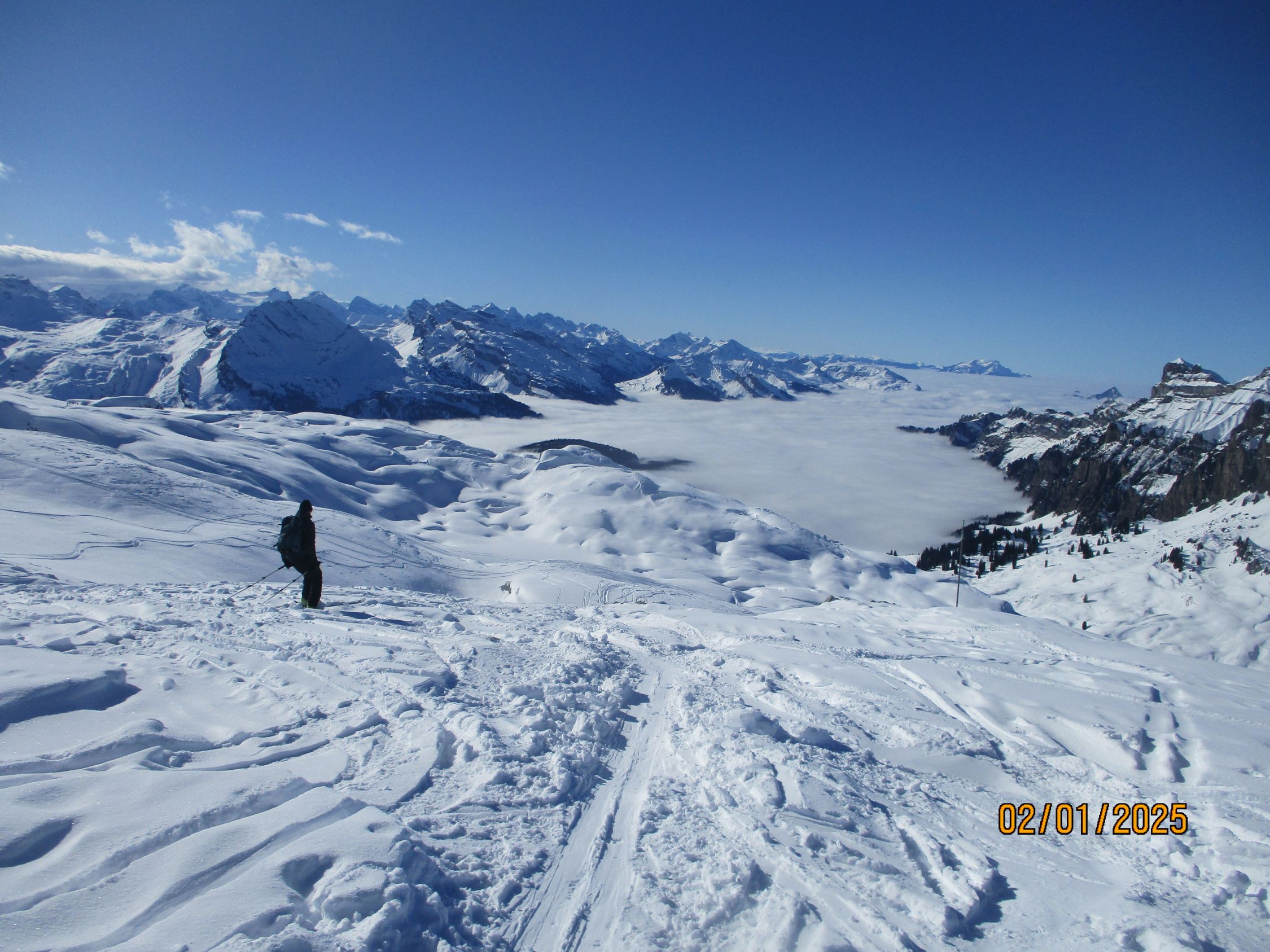 Tourenpartner Vladi auf Skiern geriet ob der wunderschönen Pulververhältnisse ins Schwärmen, und ein strahlend blauer Himmel hoch über der Hochnebeldecke tat sein Übriges hinzu :-)