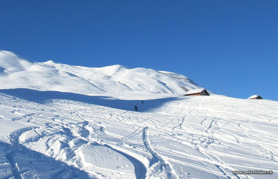 Im starken Kontrast zu gestern am Nollen war der Schnee nicht vom Wind gepresst und wunderbar locker obwohl die Expositionen ähnlich sind. Wenige Kilometer können schon einen grossen Unterschied machen.