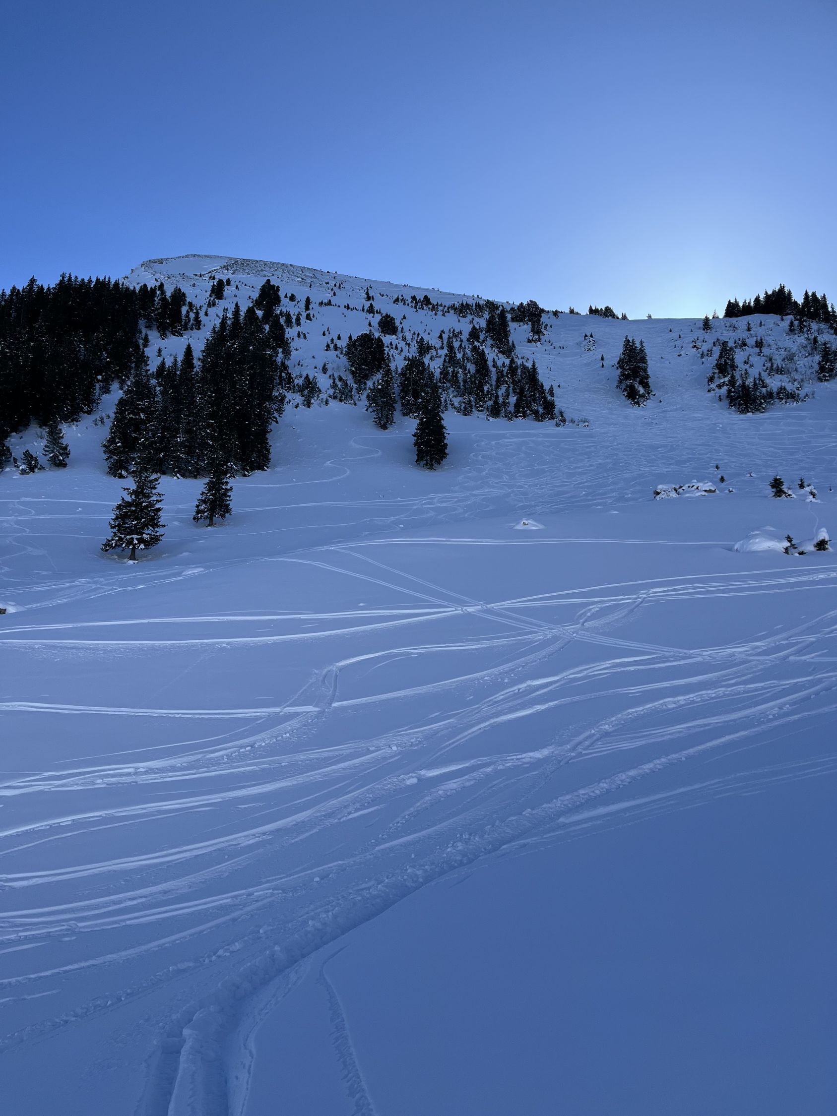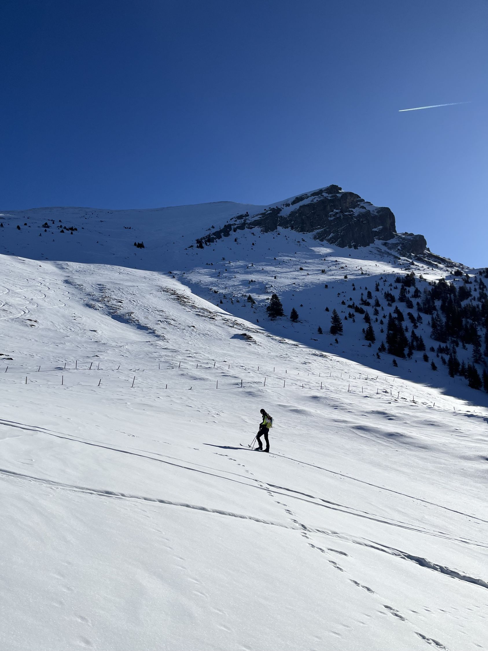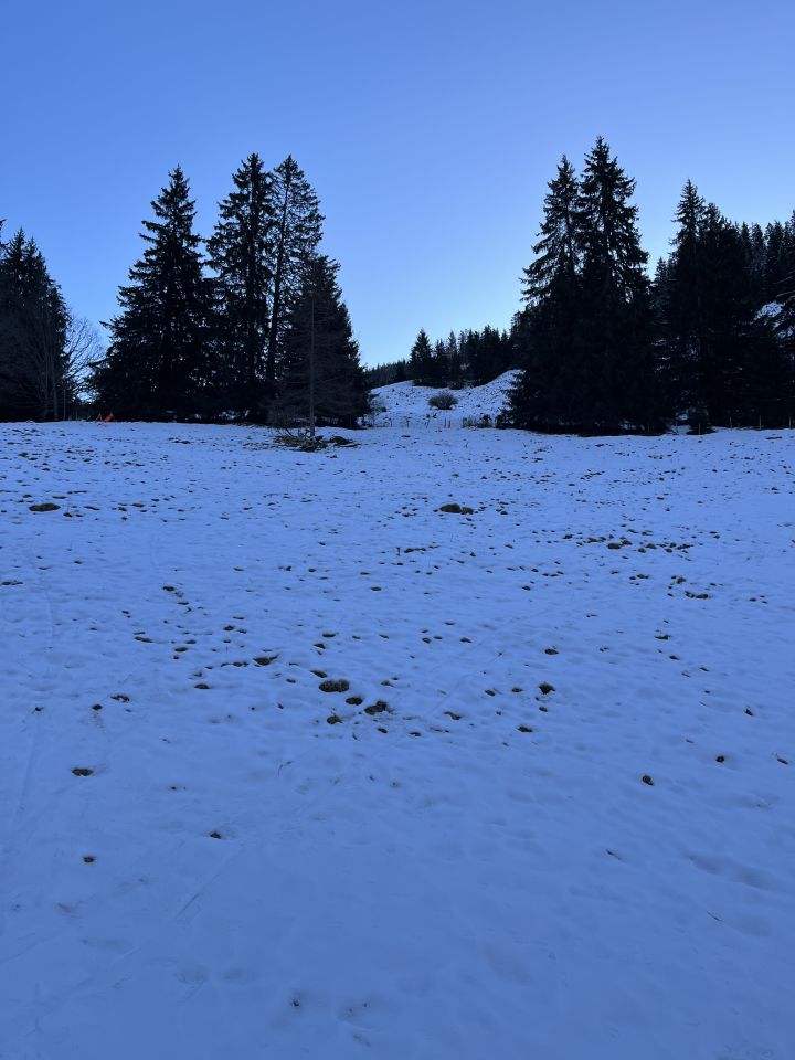 Im unteren Teil des lichten Waldes liegt wenig Schnee. Im Wald selbst wird's dann besser. Sobald man die Lichtung bei der Alp Wirie erreicht hat, trifft man nur auf eine harte, dünne und windbearbeitete Schneeschicht, die einem bis zum Gipfel erhalten bleibt.