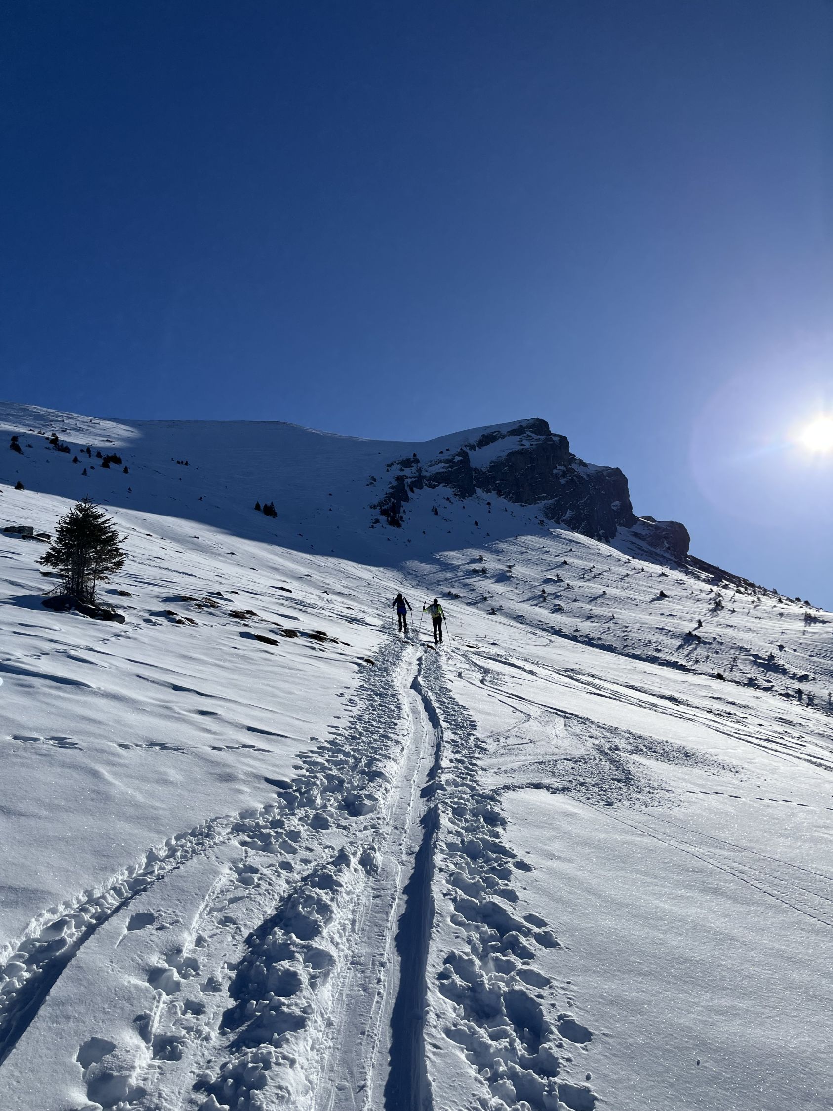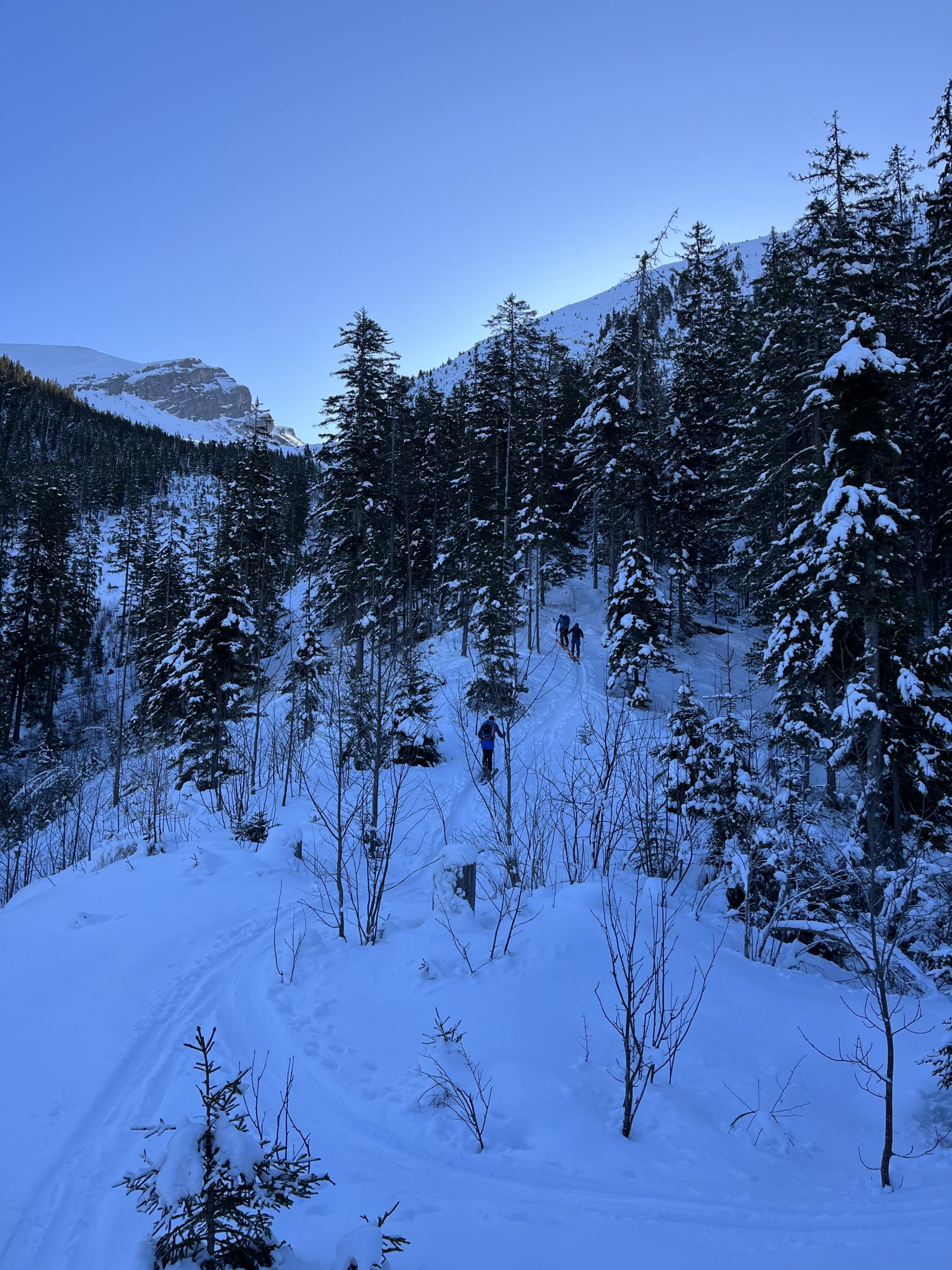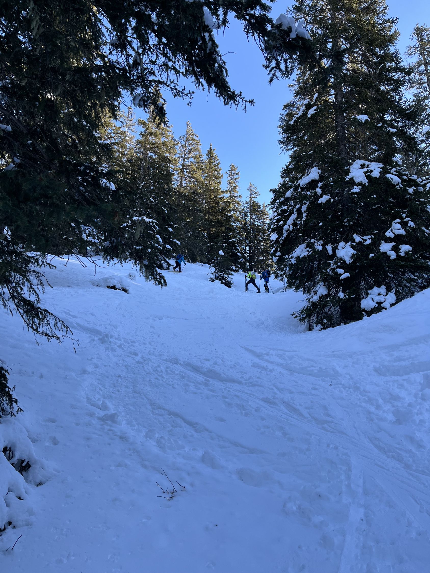 Im unteren Teil des lichten Waldes liegt wenig Schnee. Im Wald selbst wird's dann besser. Sobald man die Lichtung bei der Alp Wirie erreicht hat, trifft man nur auf eine harte, dünne und windbearbeitete Schneeschicht, die einem bis zum Gipfel erhalten bleibt.