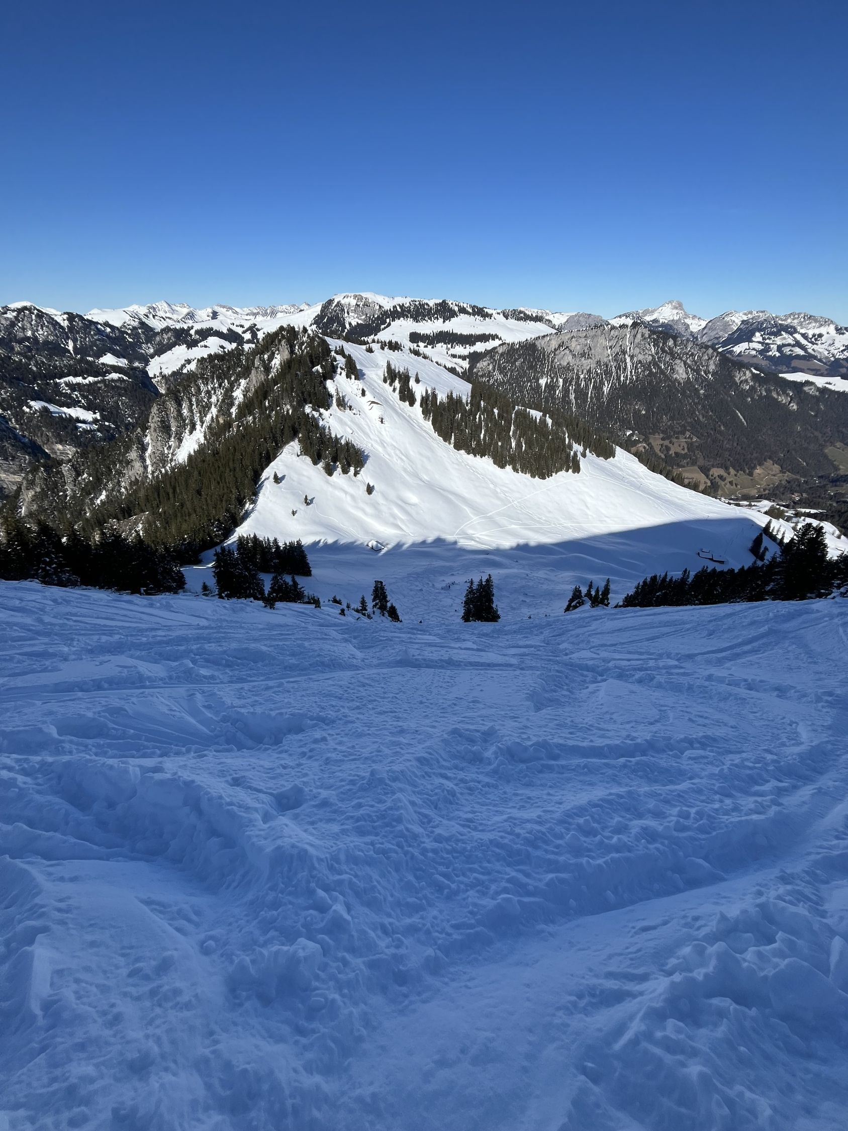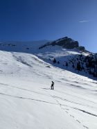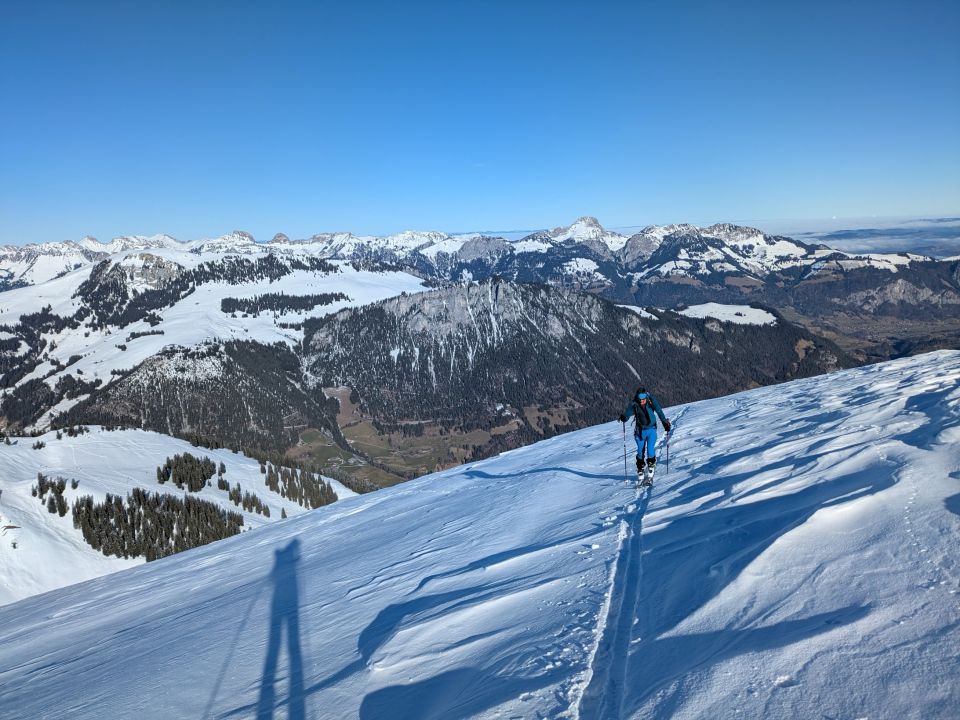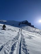 Die Abfahrt sieht allerdings besser aus, wenn man sich für die Alternative Nüegg entscheidet. Eine schöne Pulverschicht liegt zunächst auf dem westlichen Hang bis ca. 2'000m. Dann muss man Richtung Homad traversieren und die steilen Hänge oberhalb Untere Heitere auskosten. Man findet dort sogar noch unverfahrene Abschnitte mit feinstem Pulver! Weiter geht's zur Bergstation der Skiseilbahn und auf den Pisten runter zum Parkplatz. Von dort per Autostopp zurück zu Tiermatti.