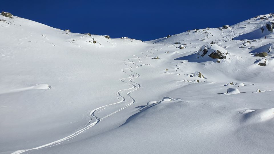 Ein perfekter Tourentag, Route gespurt, genauso wie Aug der SwissMap eingezeichnet. Aber Achtung: es hat wenig bis keine Unterlage und der etwas glatt gebratene Pulverschnee ist verlockend. Man muss wirklich absolut in den Mulden fahren und jedem noch so kleinen Buckel im Schnee ausweichen - die Skis danken es dir. Mit etwas Gespür findet man aber schon schöne Hänge ?