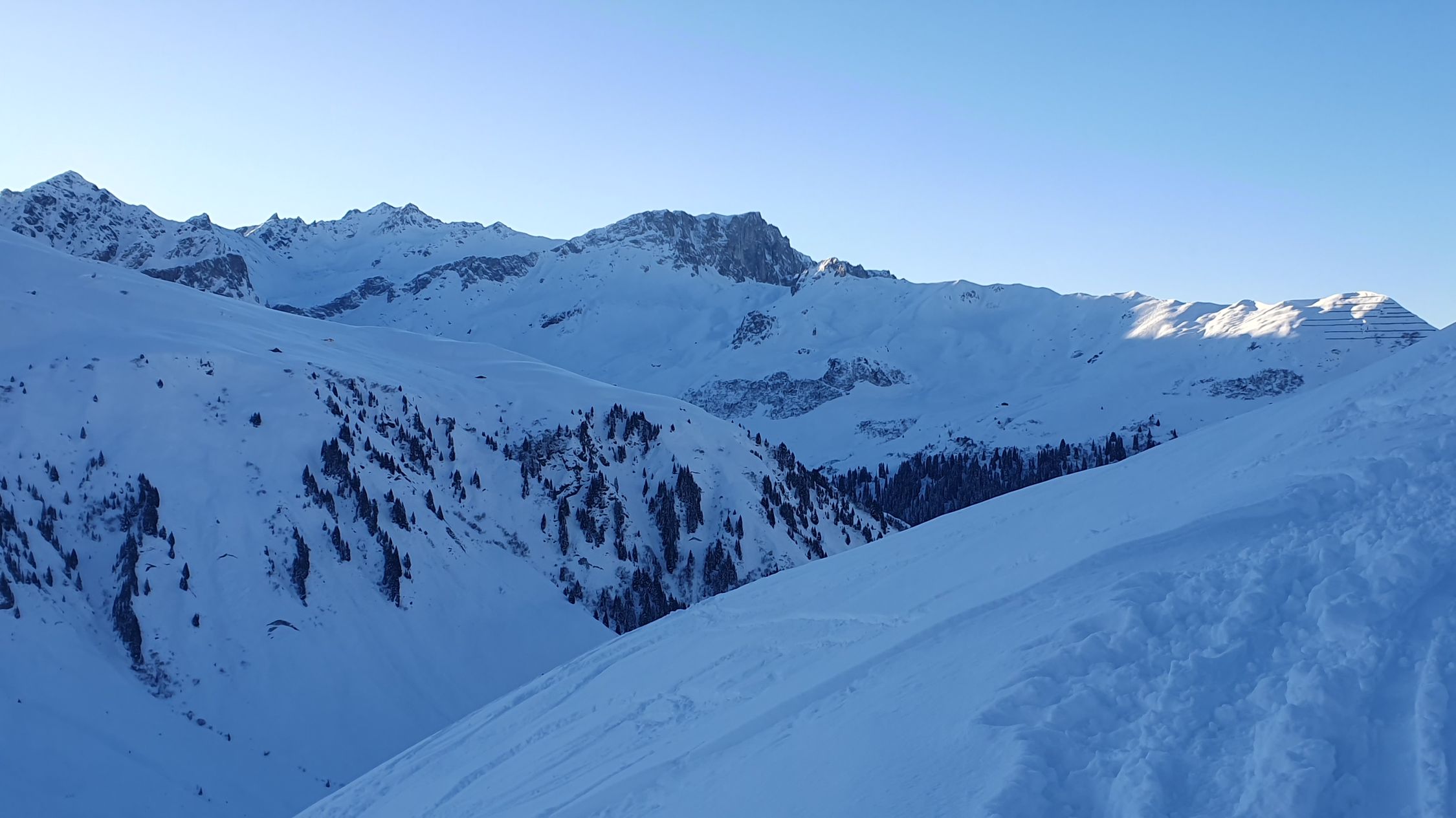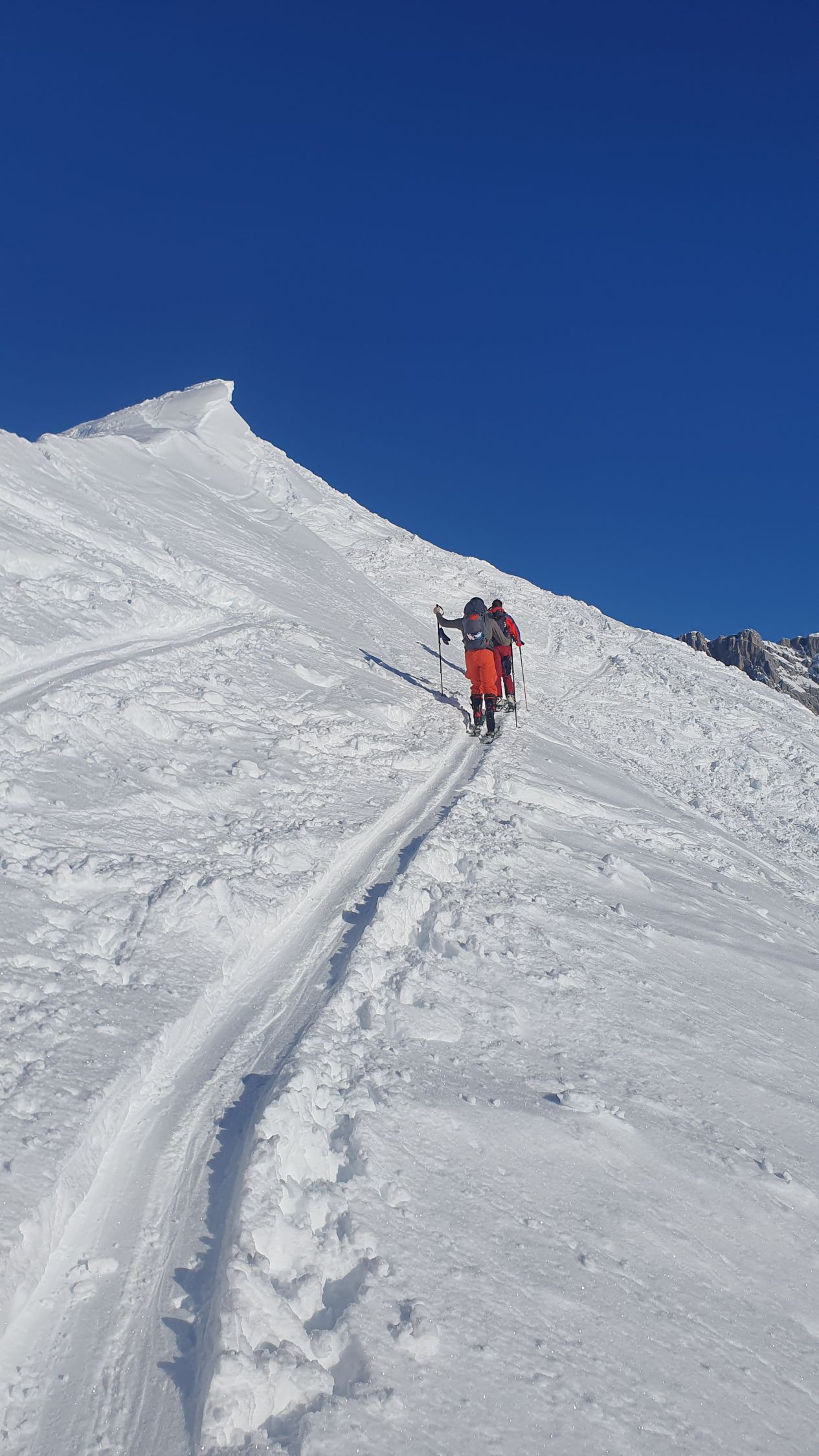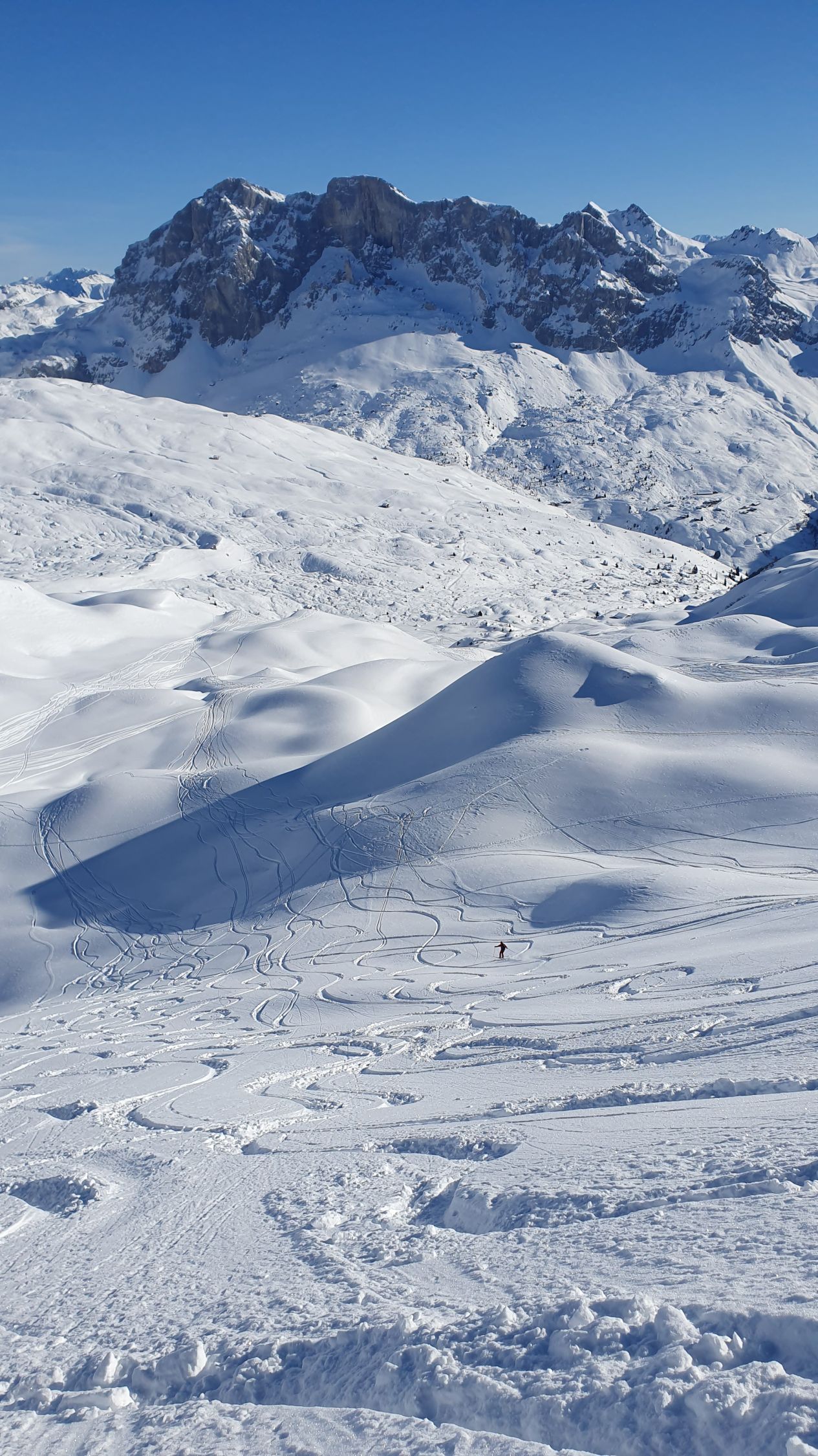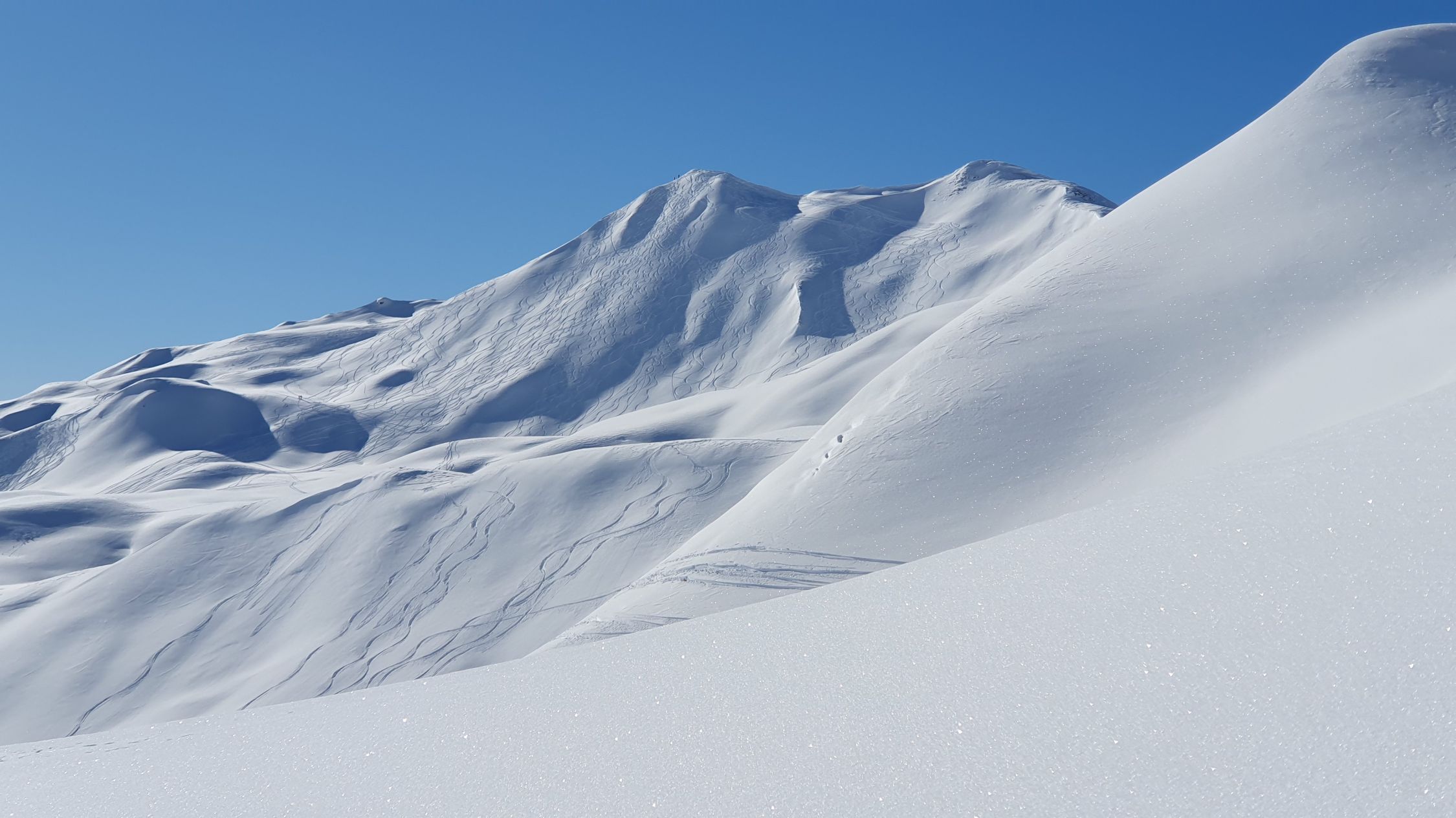 In wunderbar schönem Pulverschnee (beide Gipfel) fuhren wir runter, mit doch noch - wenn auch wenig Platz für ein paar eigene Spuren.