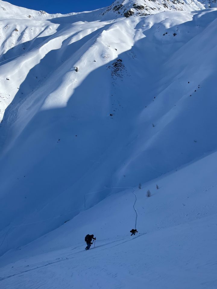 Abfahrt gut durch die Mulde unter der Sennetritzfurgga, also östlich der Aufstiegsspur.
