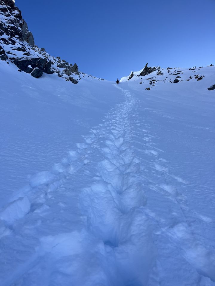 Wunderbarer Pulverschnee, noch unverfahren, der Aufstieg zum Guspissattel konnte mit gutem Trittschnee gemacht werden, auf den Pizzo Centrale war man aufgrund des rutschigen Untergrunds mit Steigeisen gut bedient.