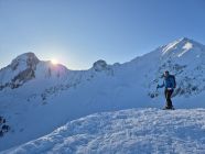 Um 7:40 gestartet, Blick auf Nebelmeer und Sonnenaufgang. Genug Schnee, nur ca. 20m unterhalb Gipfel Gras sichtbar, sehr kleine eisige Stellen. Gute Spur, Pulverschnee.