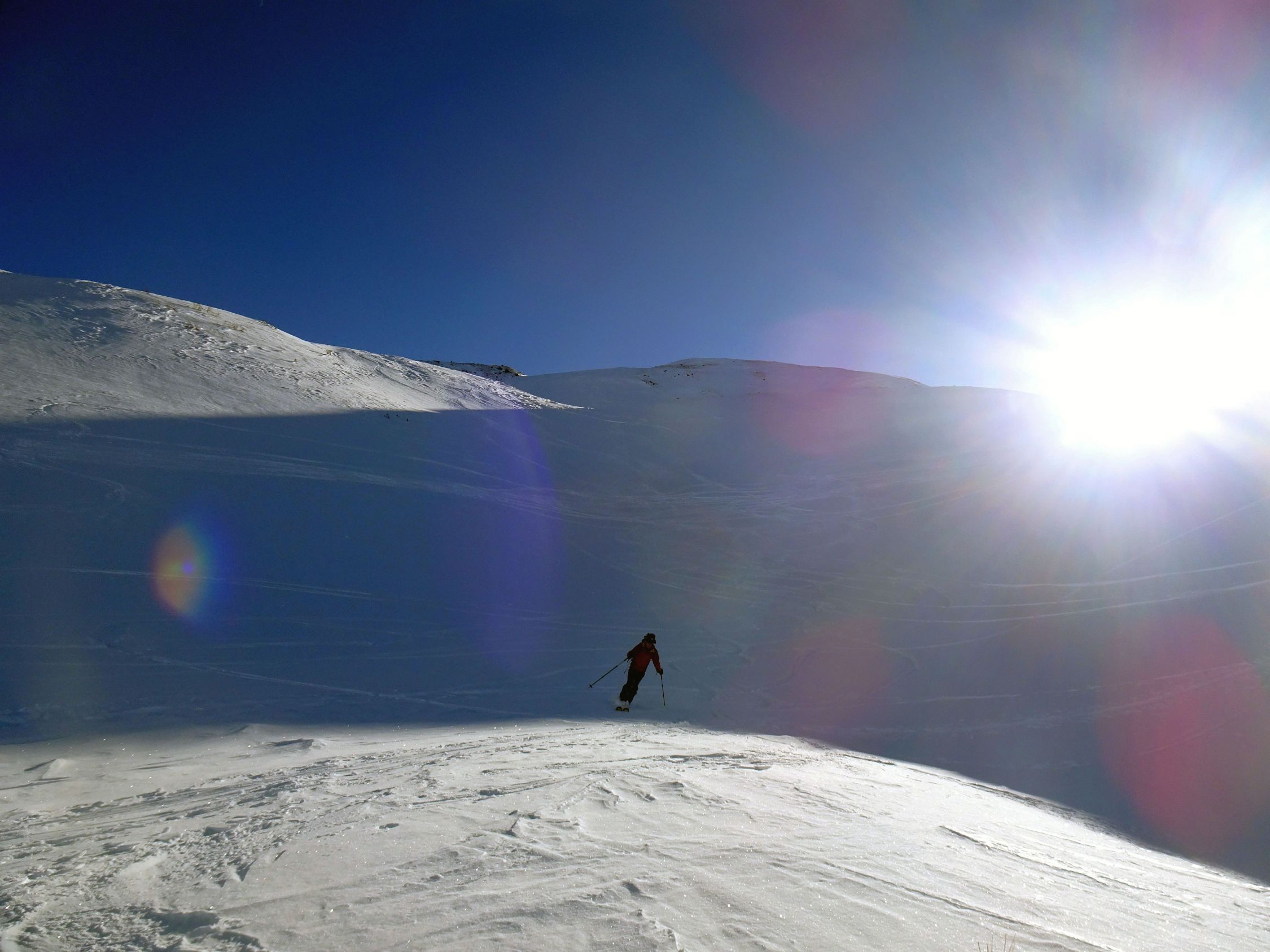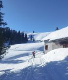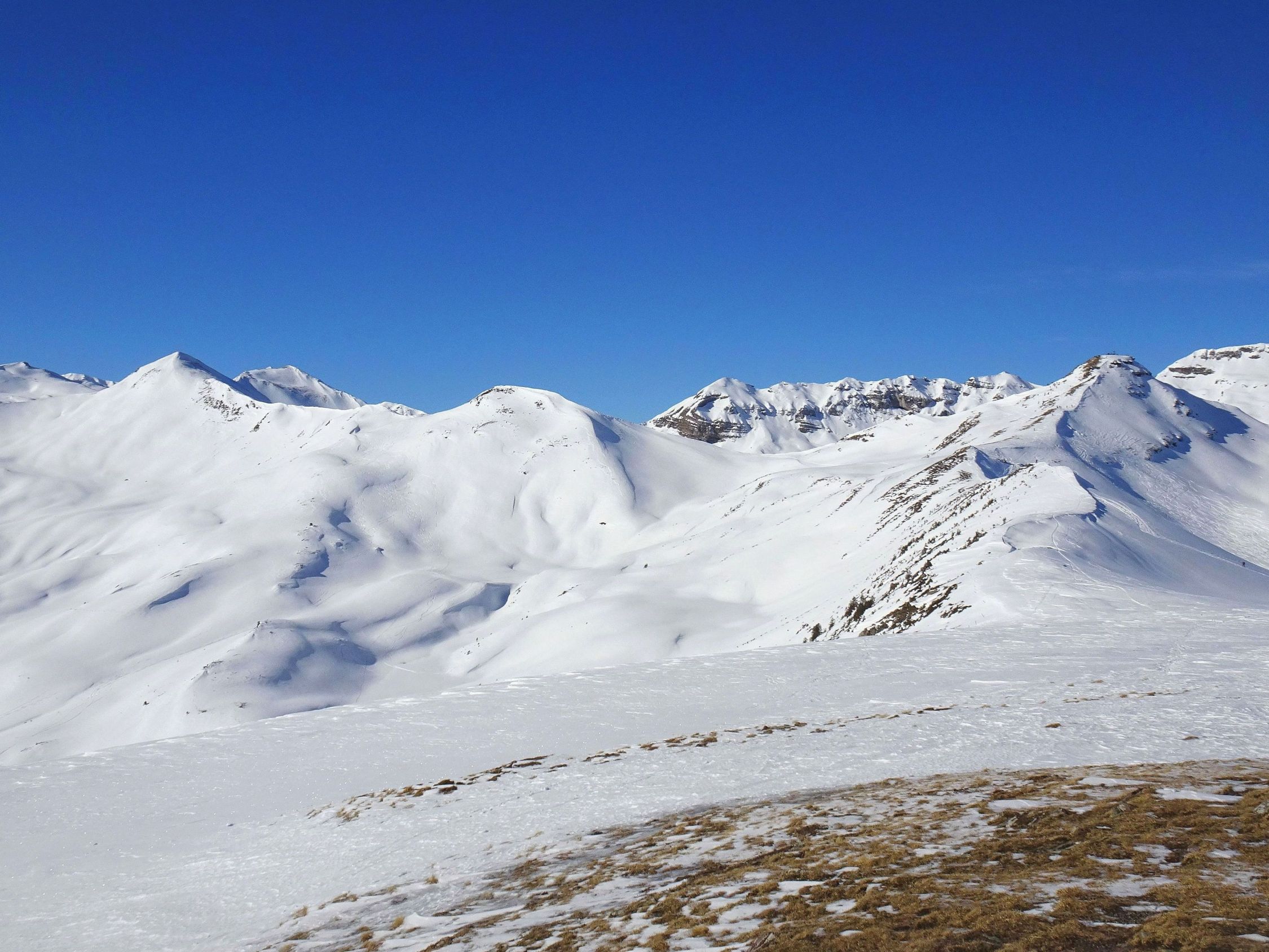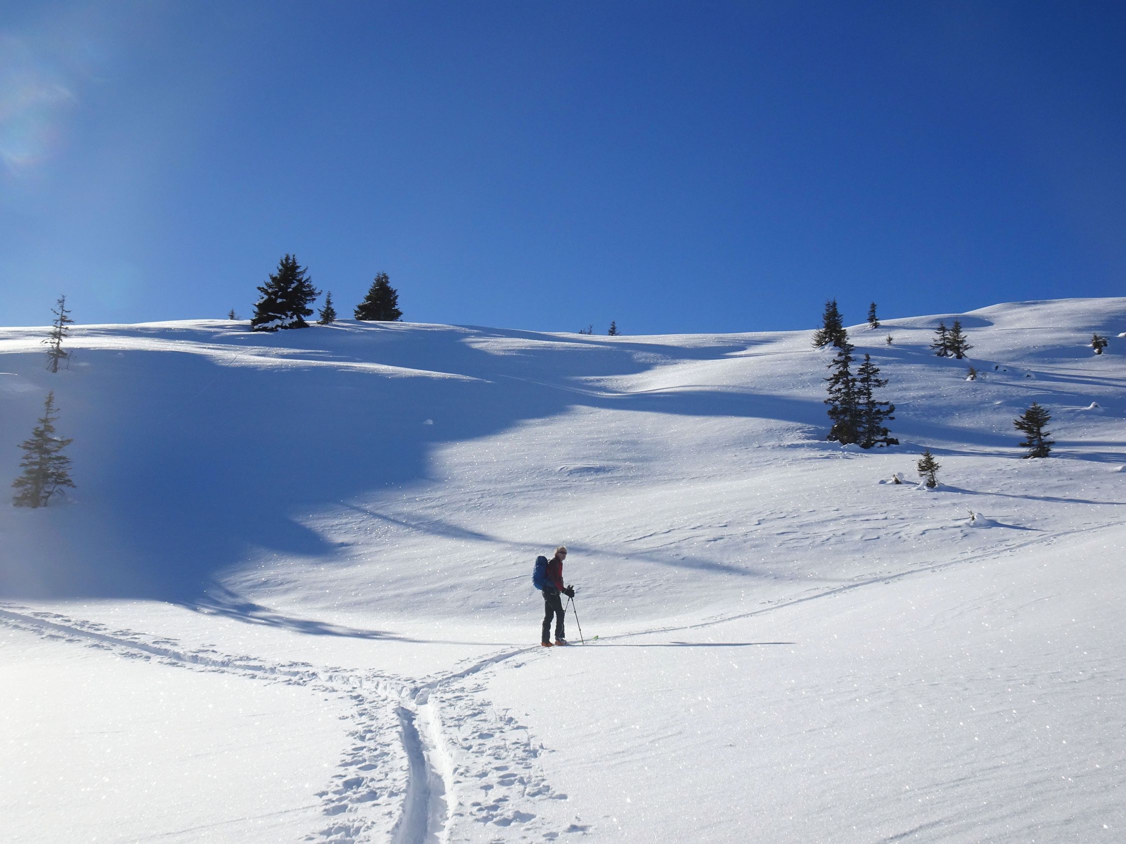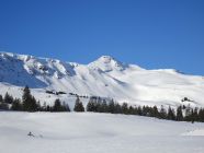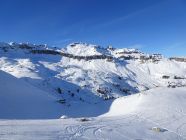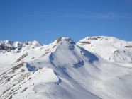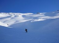 Abfahrt nach Cholschlag oft windbeeinflußt mit wechselnden Schneeverhältnissen. Es ließen sich aber durchaus noch einige schöne Pulvermulden finden und insgesamt war alles gut fahrbar. Perfektes Winterwetter, Sonne pur, kaum Wind und beste Fernsicht.
