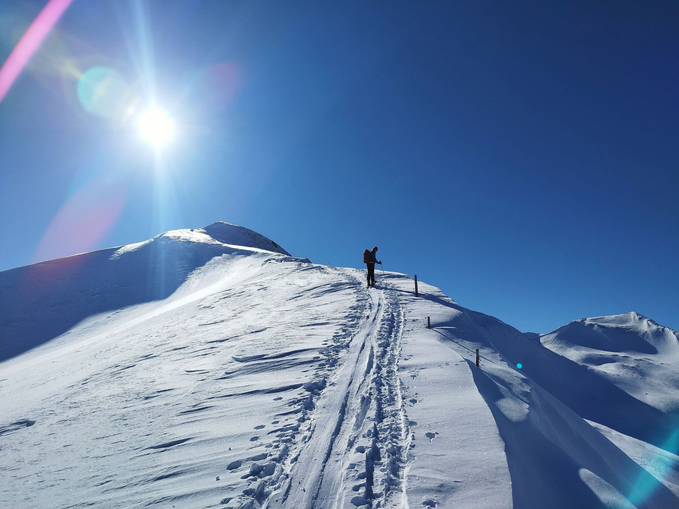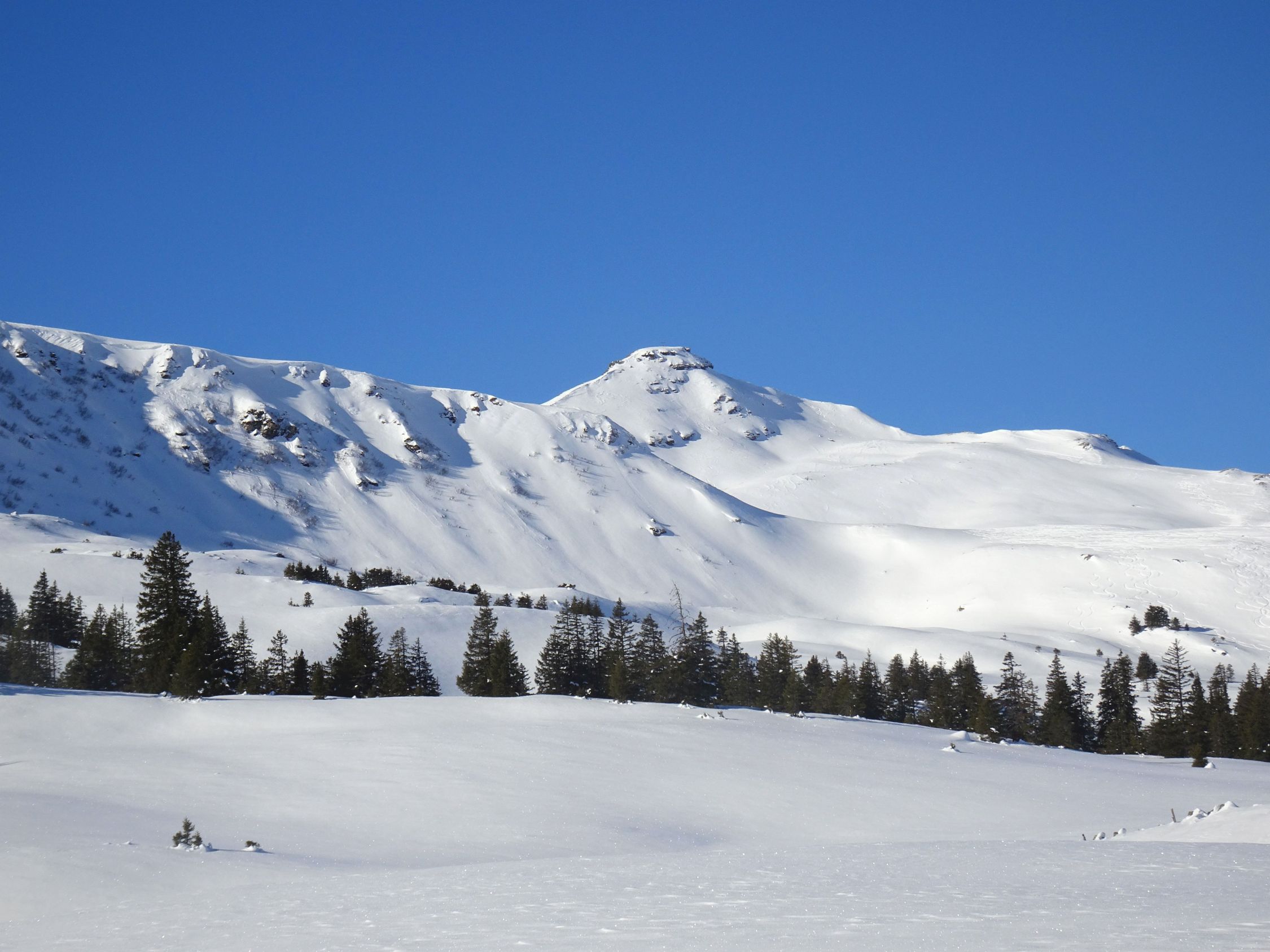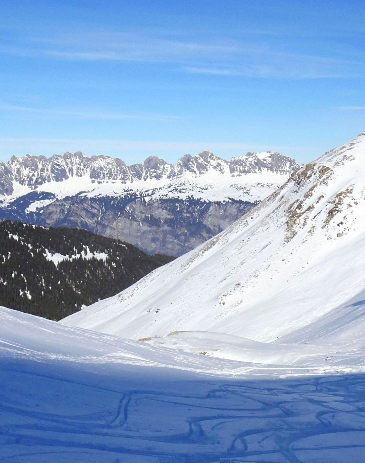 Abfahrt nach Cholschlag oft windbeeinflußt mit wechselnden Schneeverhältnissen. Es ließen sich aber durchaus noch einige schöne Pulvermulden finden und insgesamt war alles gut fahrbar. Perfektes Winterwetter, Sonne pur, kaum Wind und beste Fernsicht.