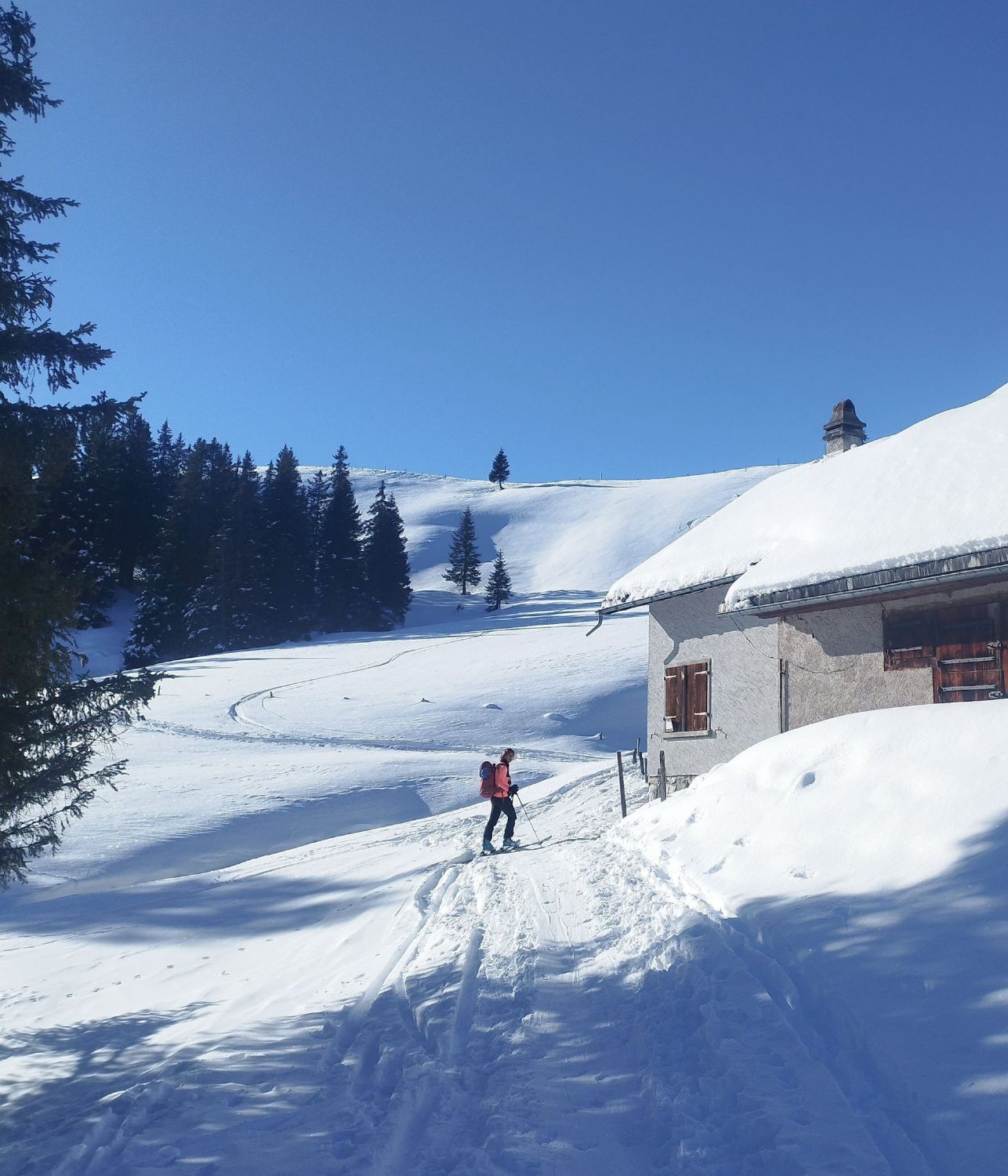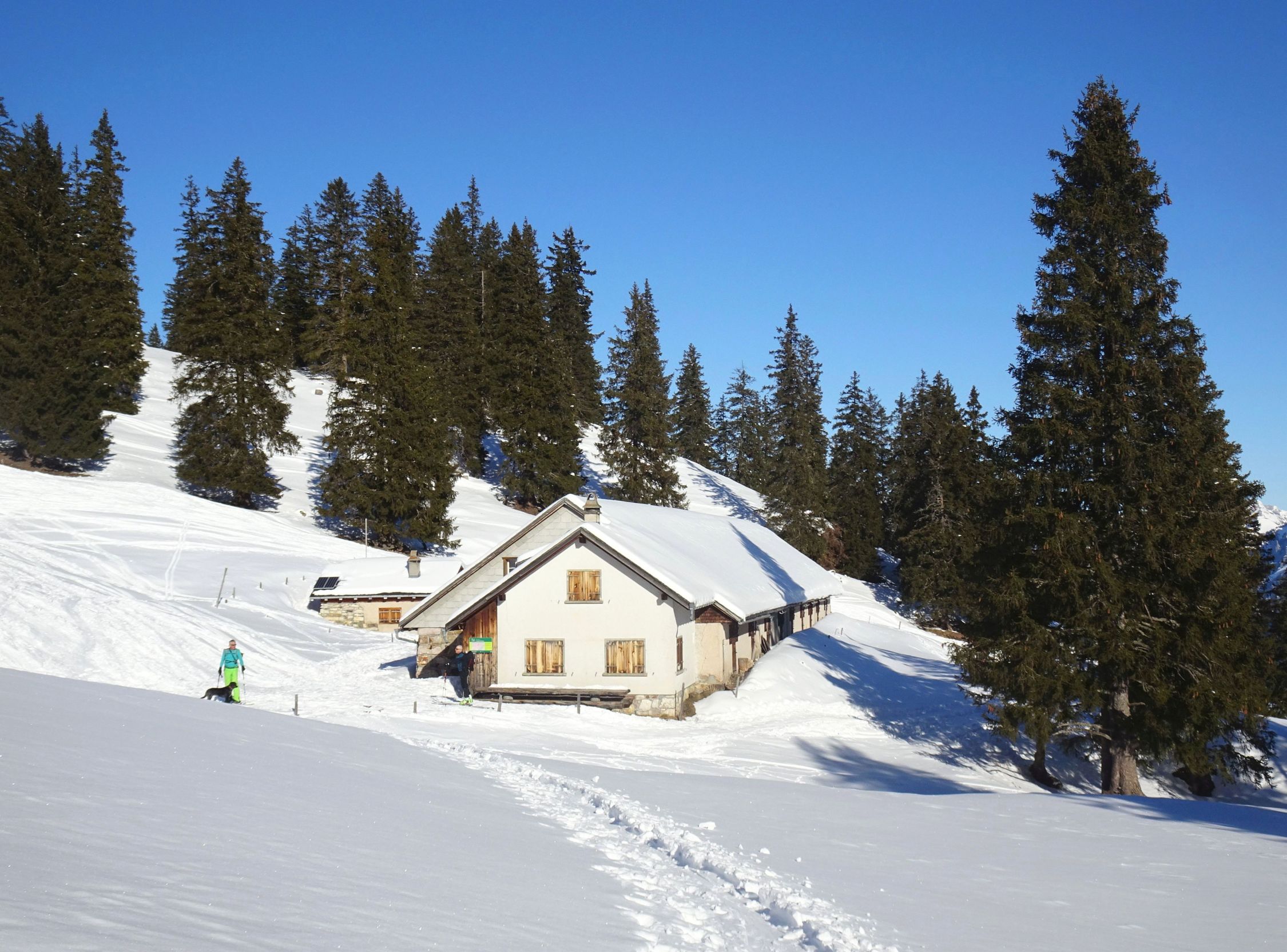 Schneelage ab Pamort gut (obwohl 100 hm unterhalb noch alles grün ist). Aufstieg bis Hüeneri meist griffig, abgeblasene Passagen am Kamm sind flach. Übergang zum Madchopf ging noch ohne Harscheisen, Spur wird aber stellenweise schon härter. Rundchopf südseitig aper, bei Überschreitung kurzer Abstieg zu Fuß (kann aber auch gequert werden).
