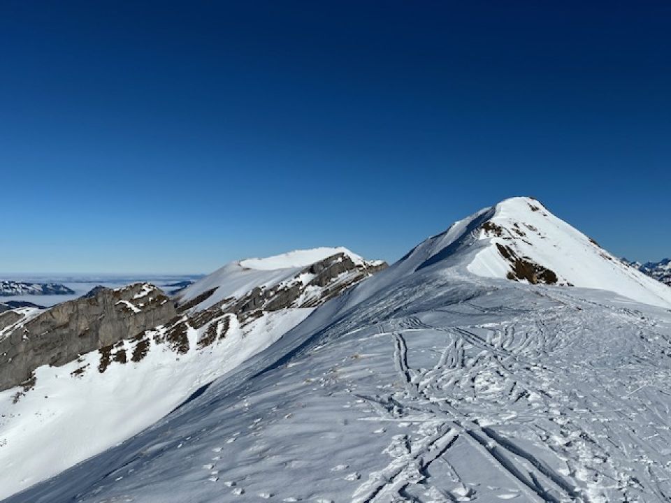 Maria-Rickenbach ist praktisch schneefrei. Bis Ahorn Fussmarsch. Dann genügend Schnee bis auf den Grat. Toller Tourentag mit schönem Pulverschnee. Stark verfahren vom Wochenende aber Abfahrt trotzdem ein grosses Vergnügen.