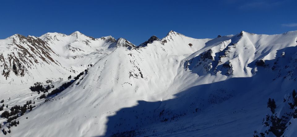Wir sind im NO-Hang aufgestiegen bis ca. 2180 m am Fuss des Couloirs. Toller Pulver mit noch wenigen Spuren bis in den Steibode, dort schon mehr verfahren, weniger Schnee, aber gut fahrbar bis zum Fieldrich.