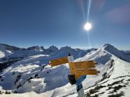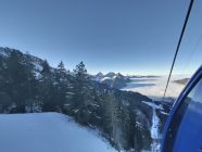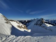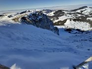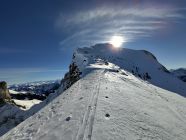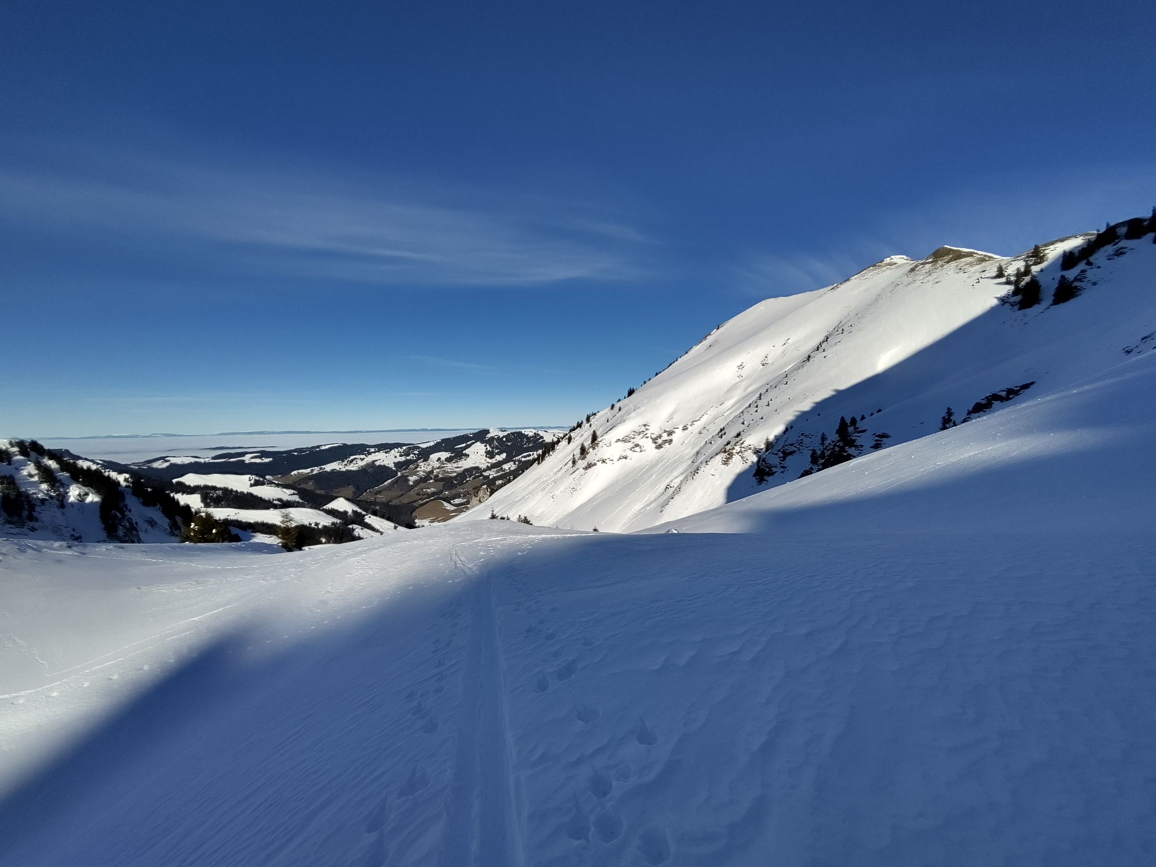 Start 9.30 h auf dem Vounetse bei strahlendem Sonnenschein und Blick aufs Nebelmeer. Einsamer Aufstieg (2-3 rutschige steile Waldpassagen; mit Ski kurz abziehen völlig unproblematisch) zum Sattel des Gros Brun/Schopfenspitz. Die durchwegs sonnenabgewandten, teils sehr steilen Abfahrten der Tour sind fantastisch: Pulver ohne Ende, tlw. Presspulver an flachen Orten gibts wenig ganz leichten Triebschnee. Es hat praktisch überall noch Platz für eigene Spuren.