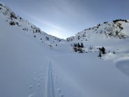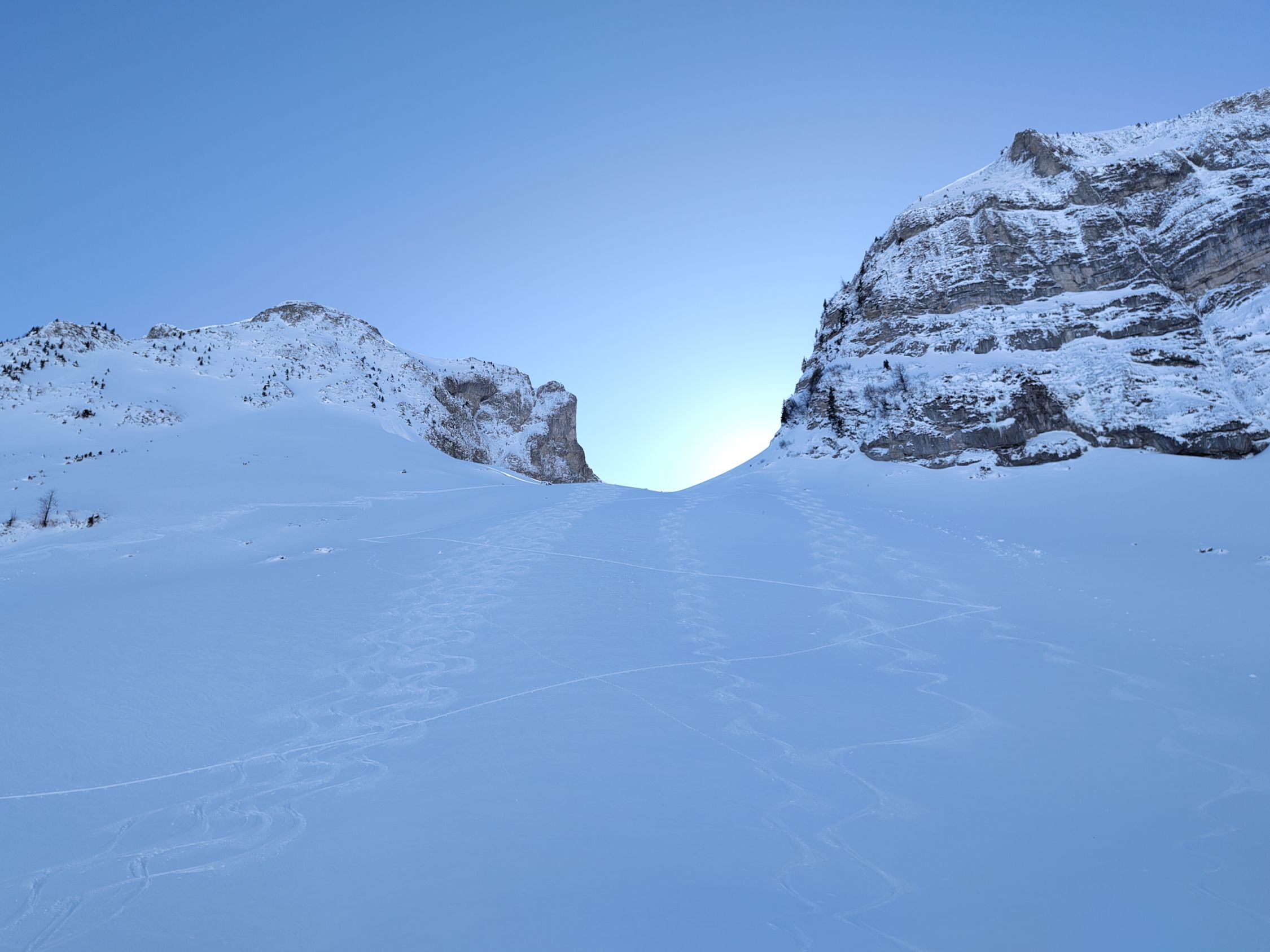Die Powderhänge halten super. Lawinenbulletin stimmt. Aufpassen mit dem Nassschnee! Nicht später starten, wenn man die ganze Tour machen will, denn im Aufstieg zum Col du Chamois wird der Nasschnee in der Sonne sehr schwer und vielleicht löst sich da nochmal was in den kommenden Tagen.