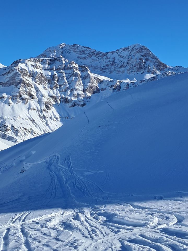Schon ziemlich windgeprägt, aber auch noch pulvrige Hänge, freilich schon zerfahren. Trotz schönem Wetter und vielen Spuren - die Lawinensituation ist und bleibt delikat. Aufstiegspur war sicher, aber in der Abfahrt sind viele Varianten möglich. 300 Meter über dem Tal hat gestern eine Gruppe ein Schneebrett ausgelöst ( siehe Bild mit Anrissen darüber), wie diverse andere sind wir wieder aufgestiegen, um wieder die Aufstiegspur zu erreichen. Jeder kann sich fragen, ob er das auch gemacht hätte, wenn er als erster da gewesen wäre.