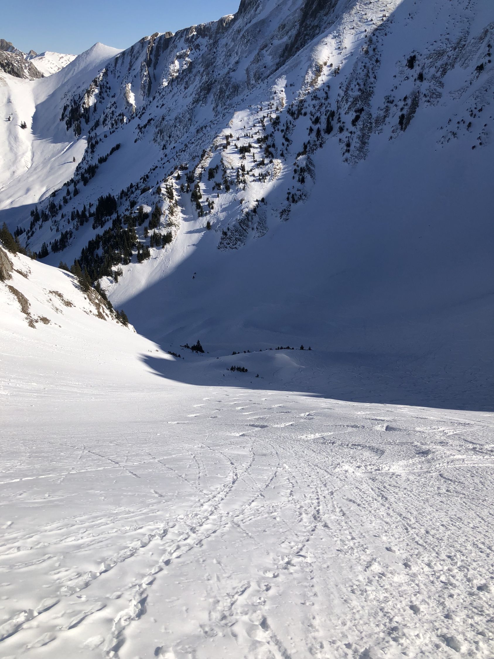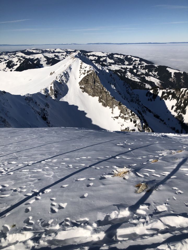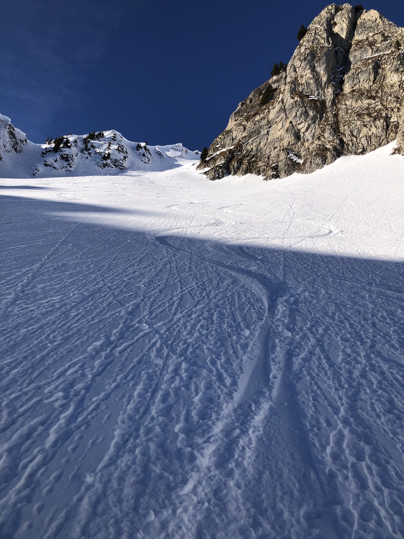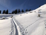 Abfahrt Schibe: bis zur Querung über den markanten Graben viel befahren, aber immer noch Pulver gut. Gute Aufstiegsspur ab Hinter Rychisalp, allerdings paar Stellen bereits mager und hier Harscheisen nützlich.