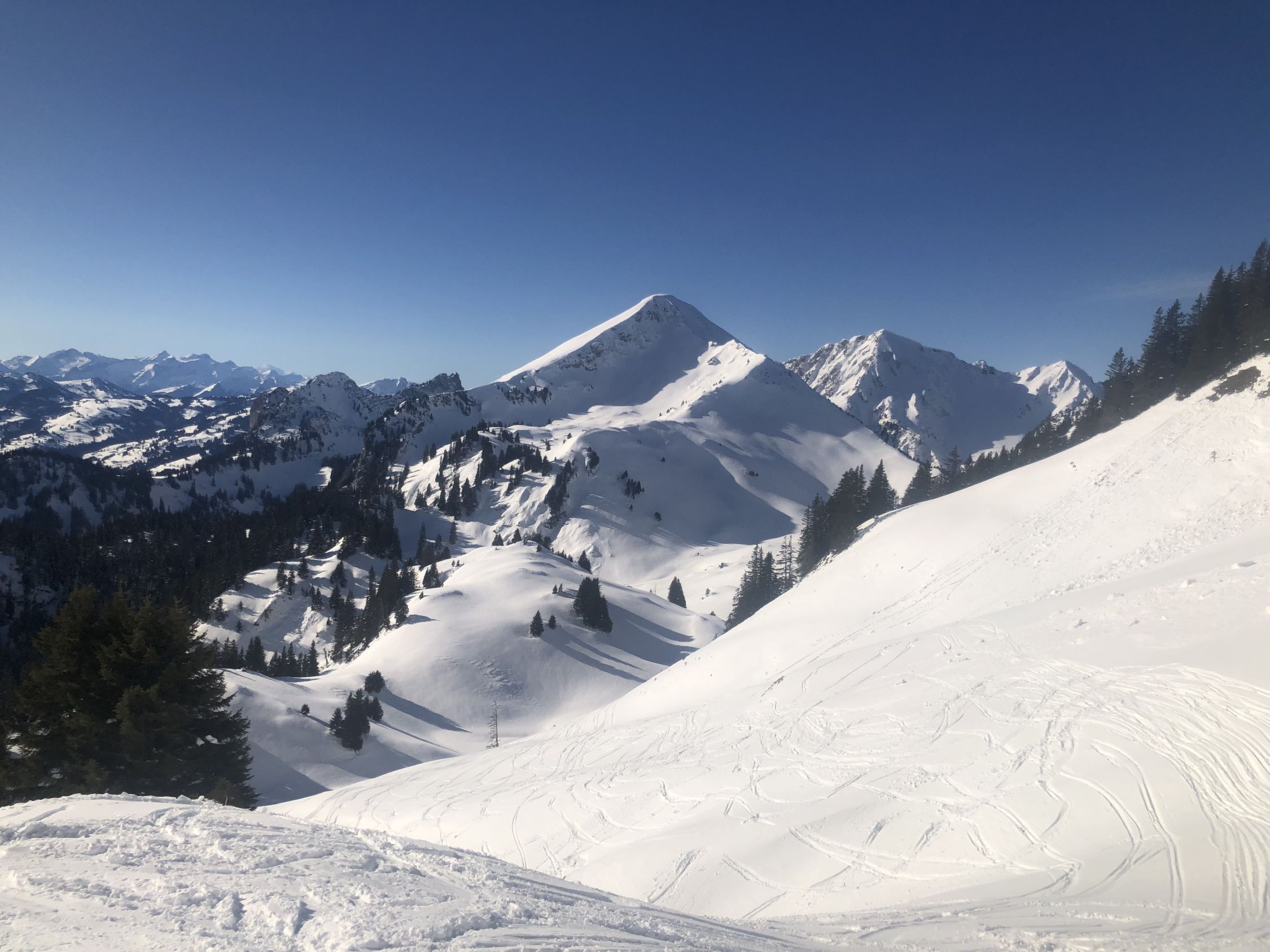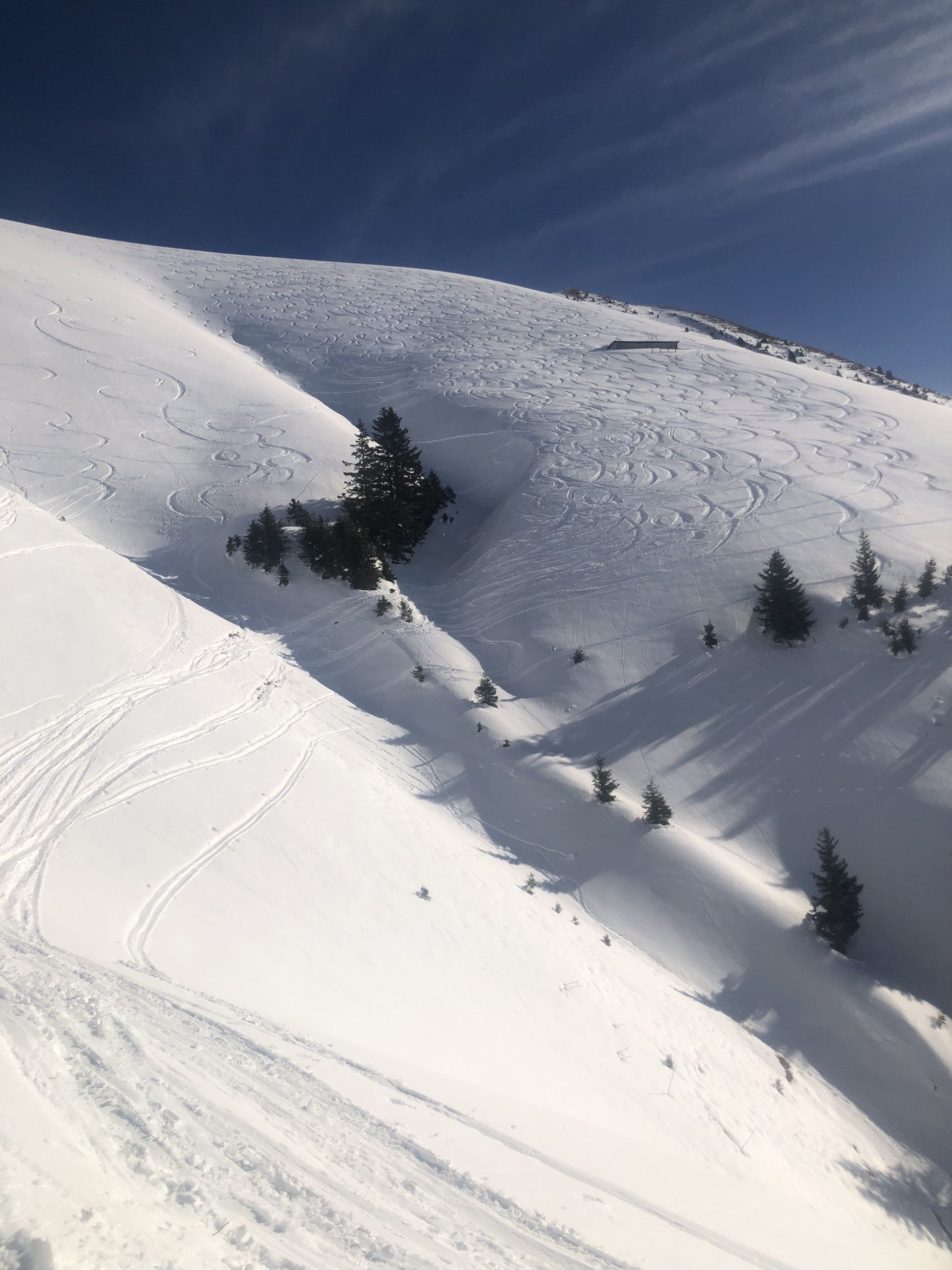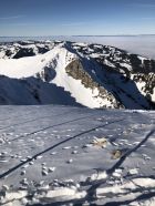 Abfahrt Märe: viele Spuren. Ab Höhe Gemsstube vieeel Platz für eigene Spuren. Pulver wie es sein soll. Ab Pt.1716 bin ich rechts vom Graben sehr steil runter und dann wieder im Graben schönster Pulverschnee bis rechts rüber zur Alp Seeberg. Unterhalb Seeberg bis Brüggli Pt.1365 auch genial.